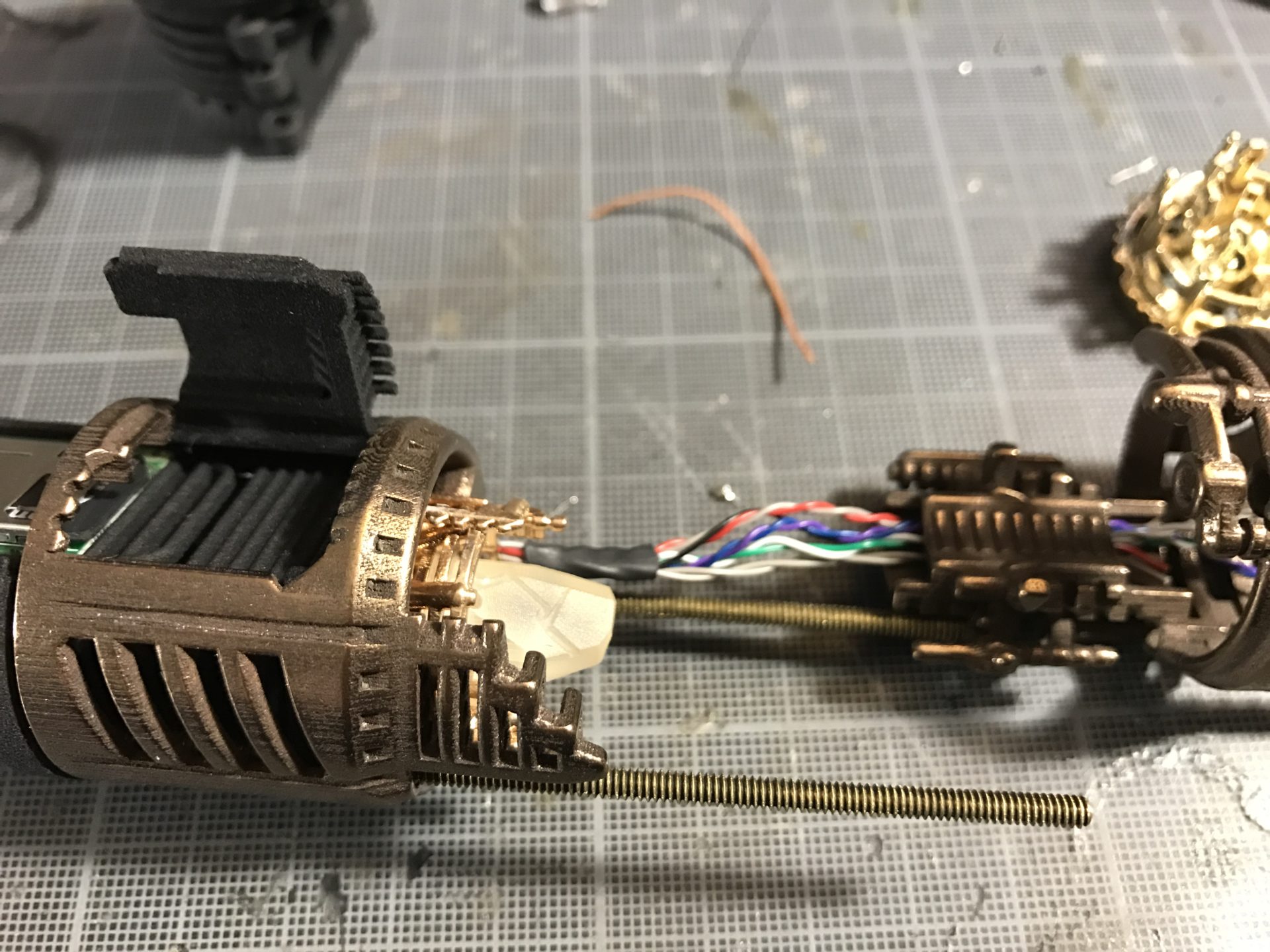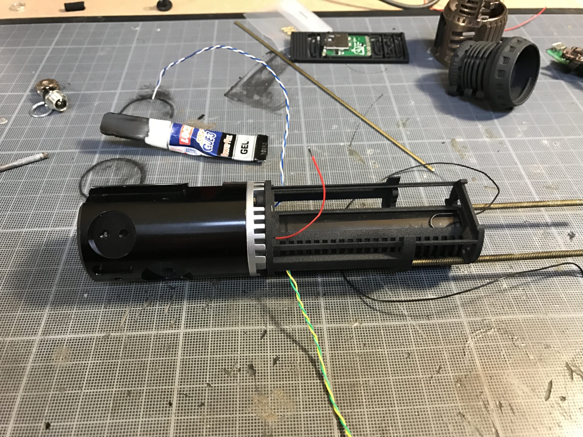Step 3- Prepare you 4-40 threaded rods and cut them to the proper length according to the blade blade holder used. You would have to partially assembly the chassis part for that. On the picture below, you can see where we cut the rod (black mark).