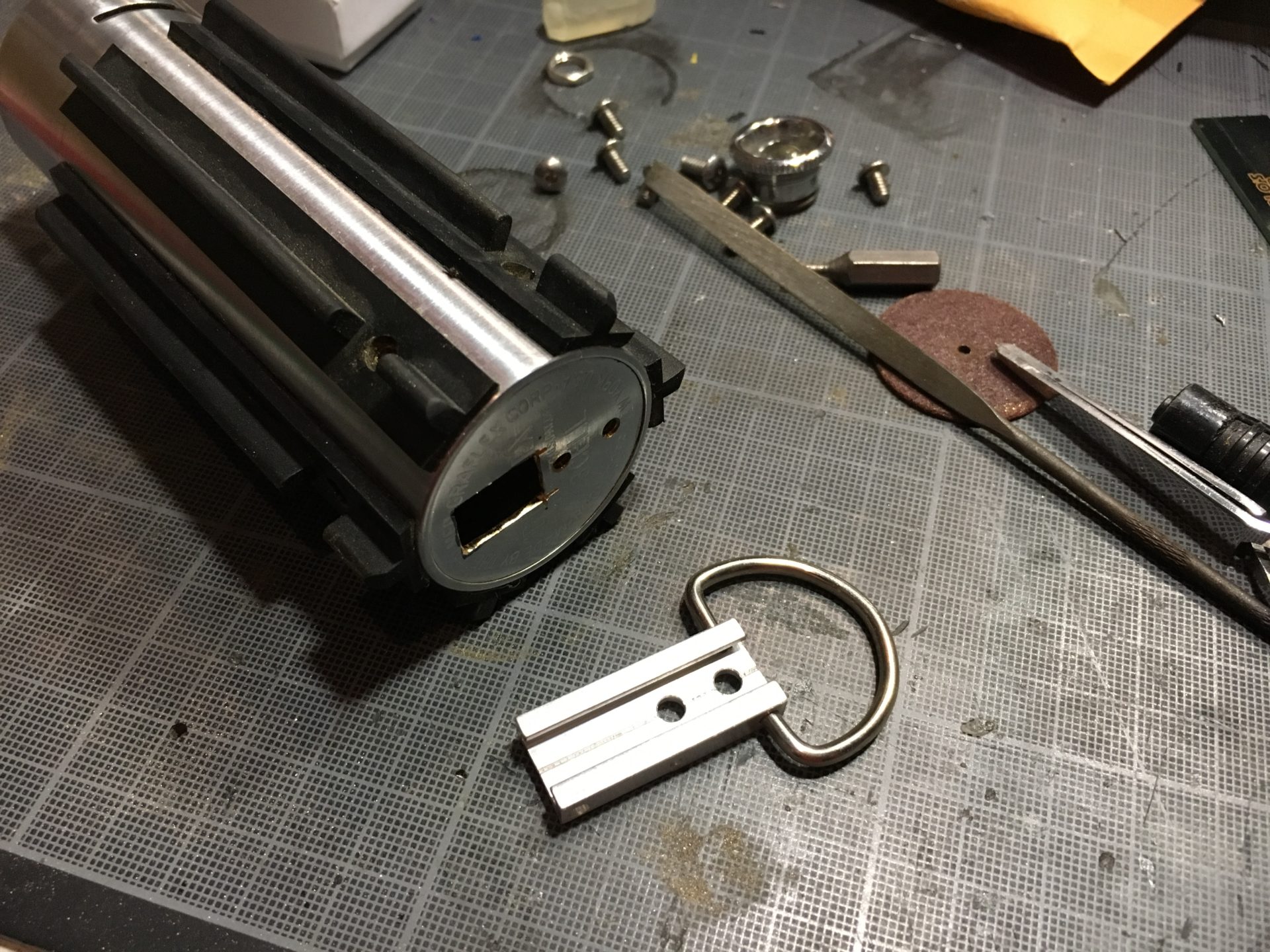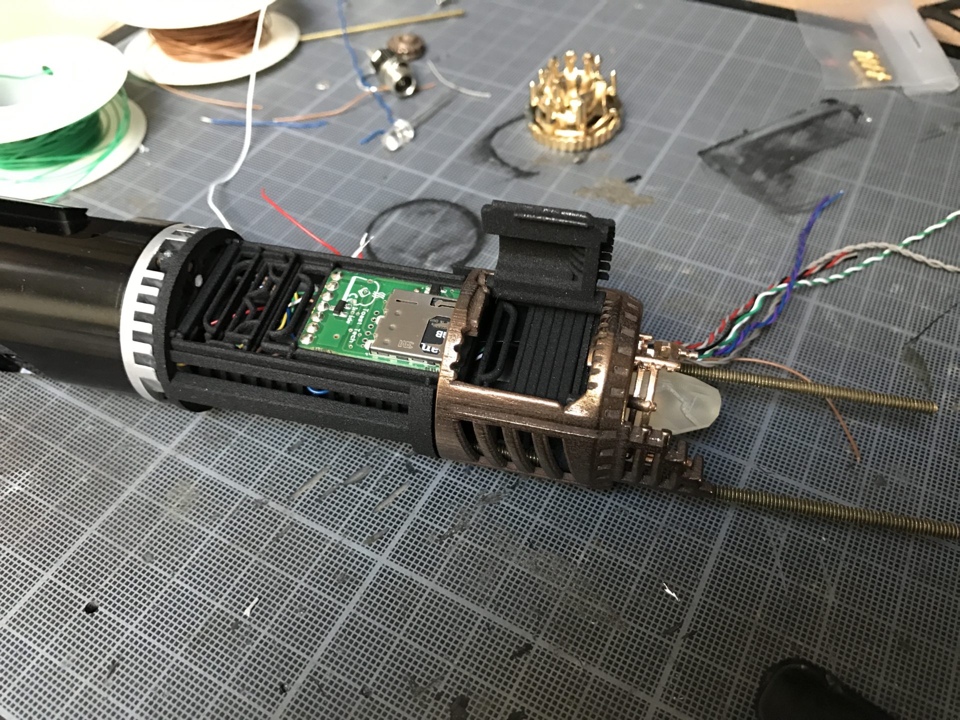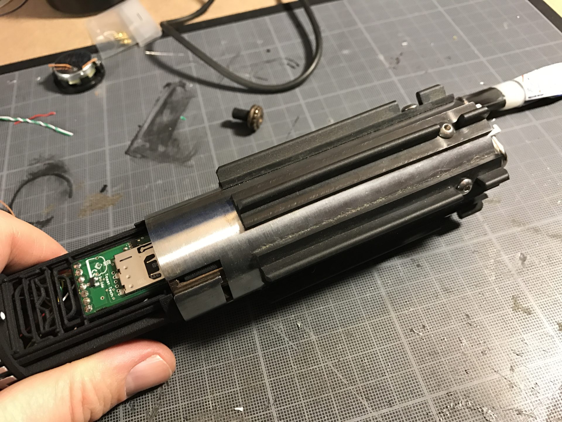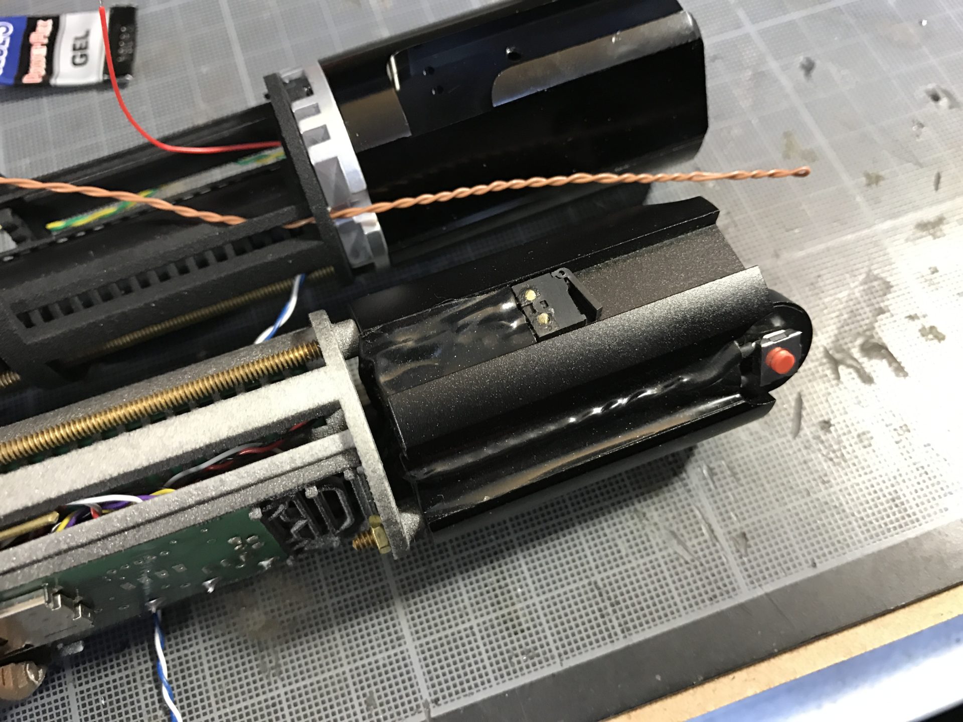 Notes: To install the AUX slider switch that works with TGS and NerfworXlab Blade Holders (link in the electronic components section above), you can use small bits of the 1.5mm OD rods, to guide and secure the switch. You’ll have to mod the Graflex top in order to reduce the length of the slide switch inner tab accordingly.