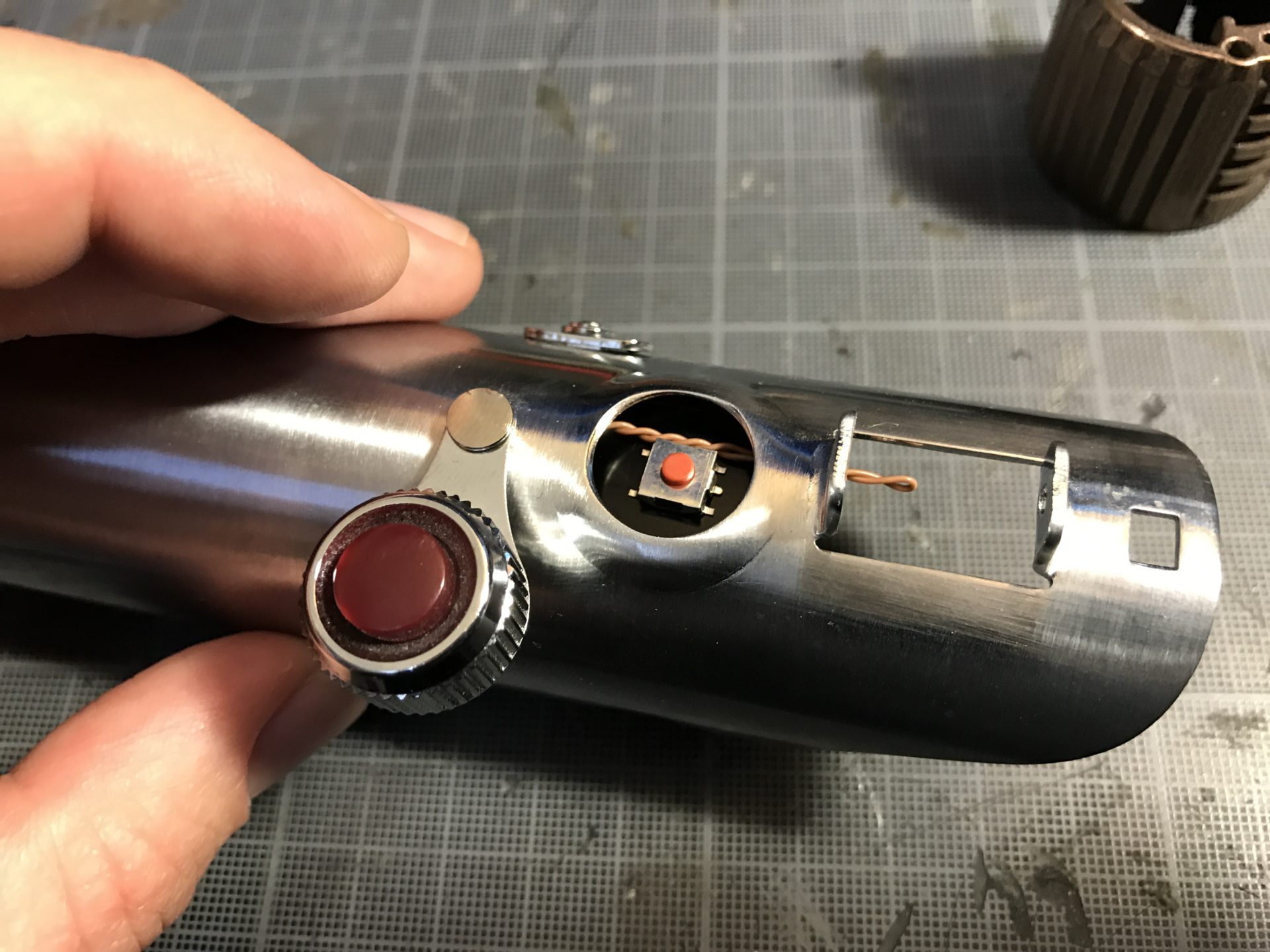 Step 5- Insert the blade holder into your Graflex vintage or replica top, in order to position and glue the main switch. Then solder the wires to the switch. Do not glue the tactile switch directly on the metal blade holder, you have to insulate it.