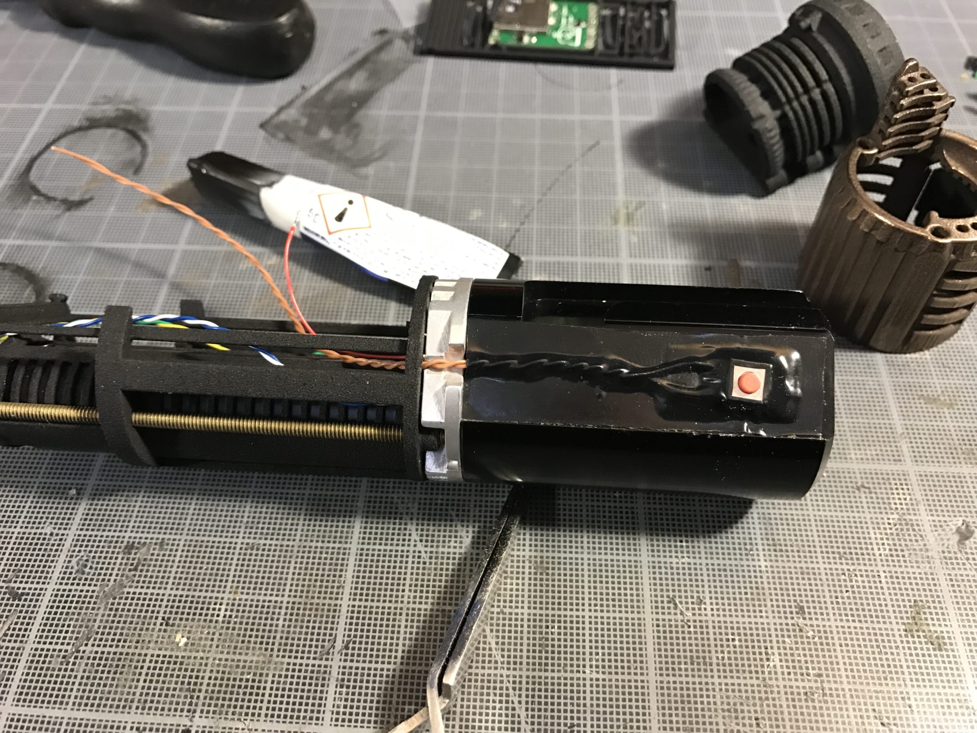 Step 20– Assemble the chassis into the top flash. The red button might need some additional material under it to activate the tactile switch correctly (depending on the blade holder used). You can glue a piece of plastic under the red button for that.