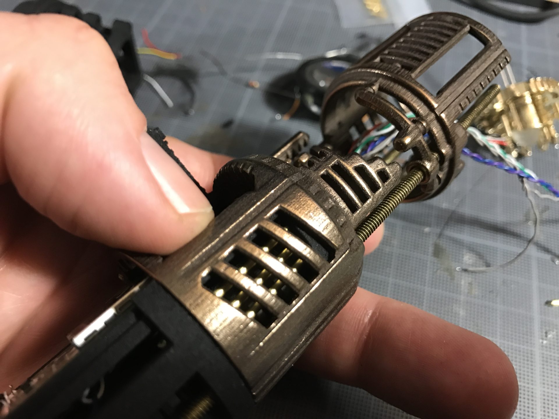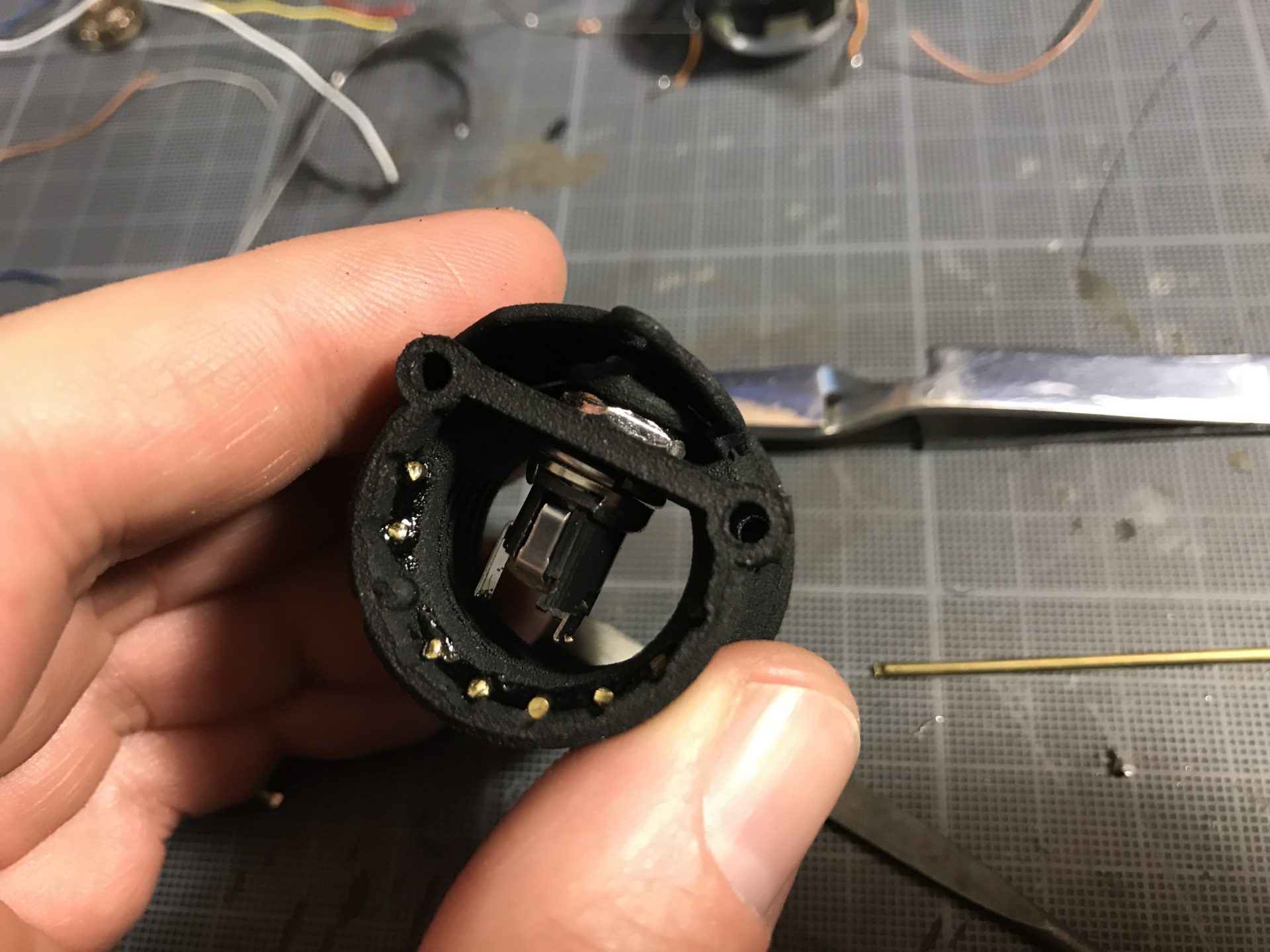 Step 16- Insert the above assembly into shell 2, pulling out the wires from the back using pliers will insert now wires get in the way and stay properly in the dedicated channel. Also check that the bottom fits fine.