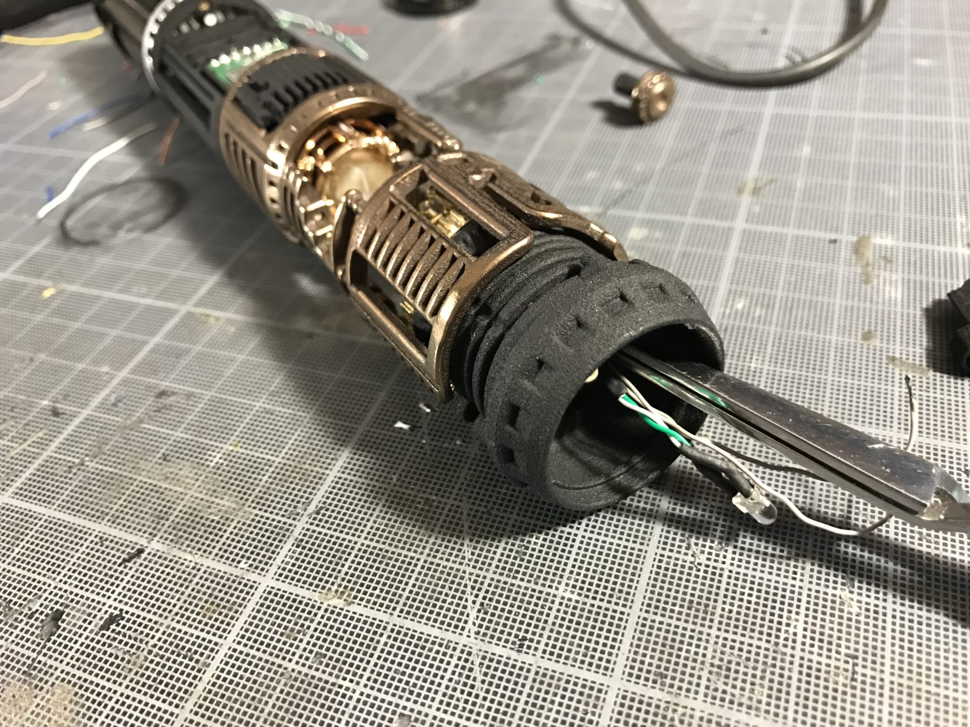 Step 19– Depending on the style (ANH, ESB or TFA), vent the Graflex bottom and add the grips and D-ring. If you’re installing a Vintage, we would recommend to leave the Vintage bottom not modded and use a replica bottom to install the grips and holes… the way you don’t “destroy” an antique flash, can show people where the saber comes from and convert it / change styles immediately by switching bottoms.