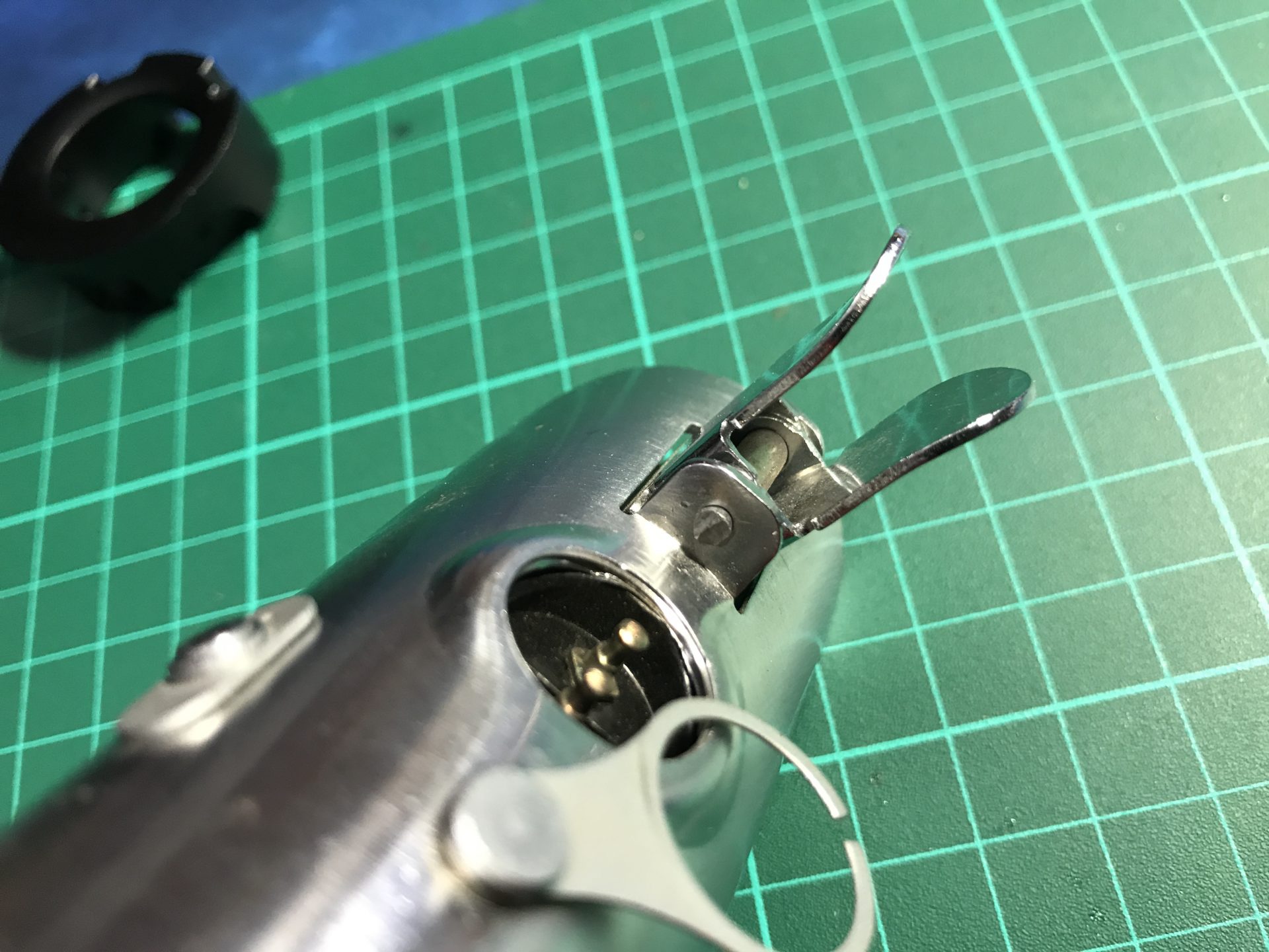 Step 1: Vintage Graflex bunny ears pin removal. To be done with care and patience, remove the red button, protect the hilt and file down the pin in order to be able to push it out. You can eventually use a rod to softly hammer the pin out, and remove the bunny ears.