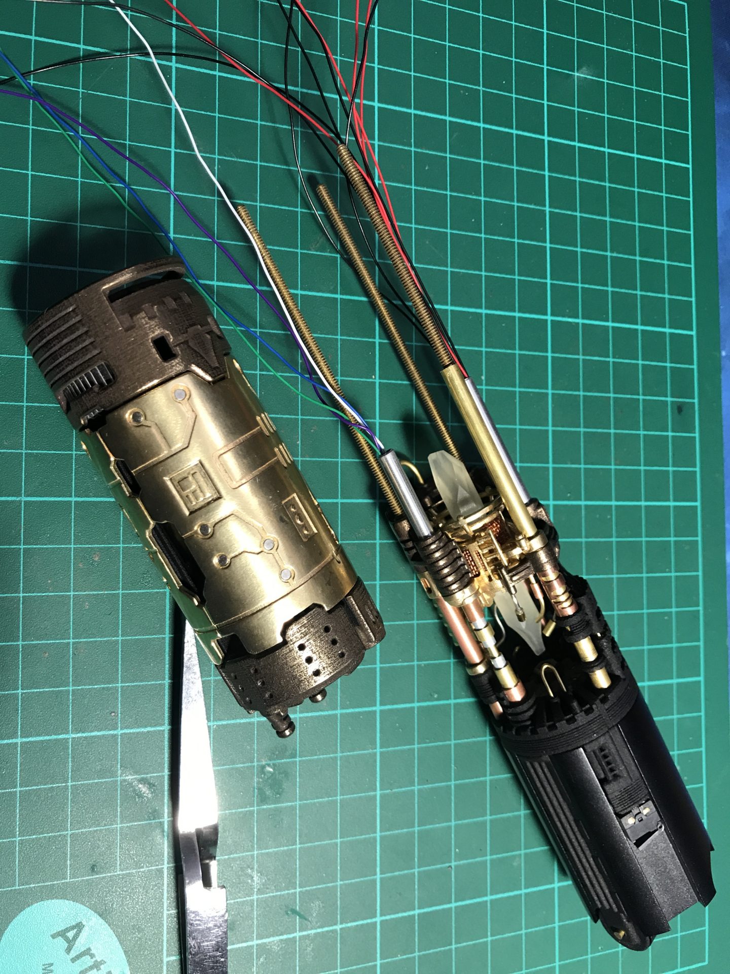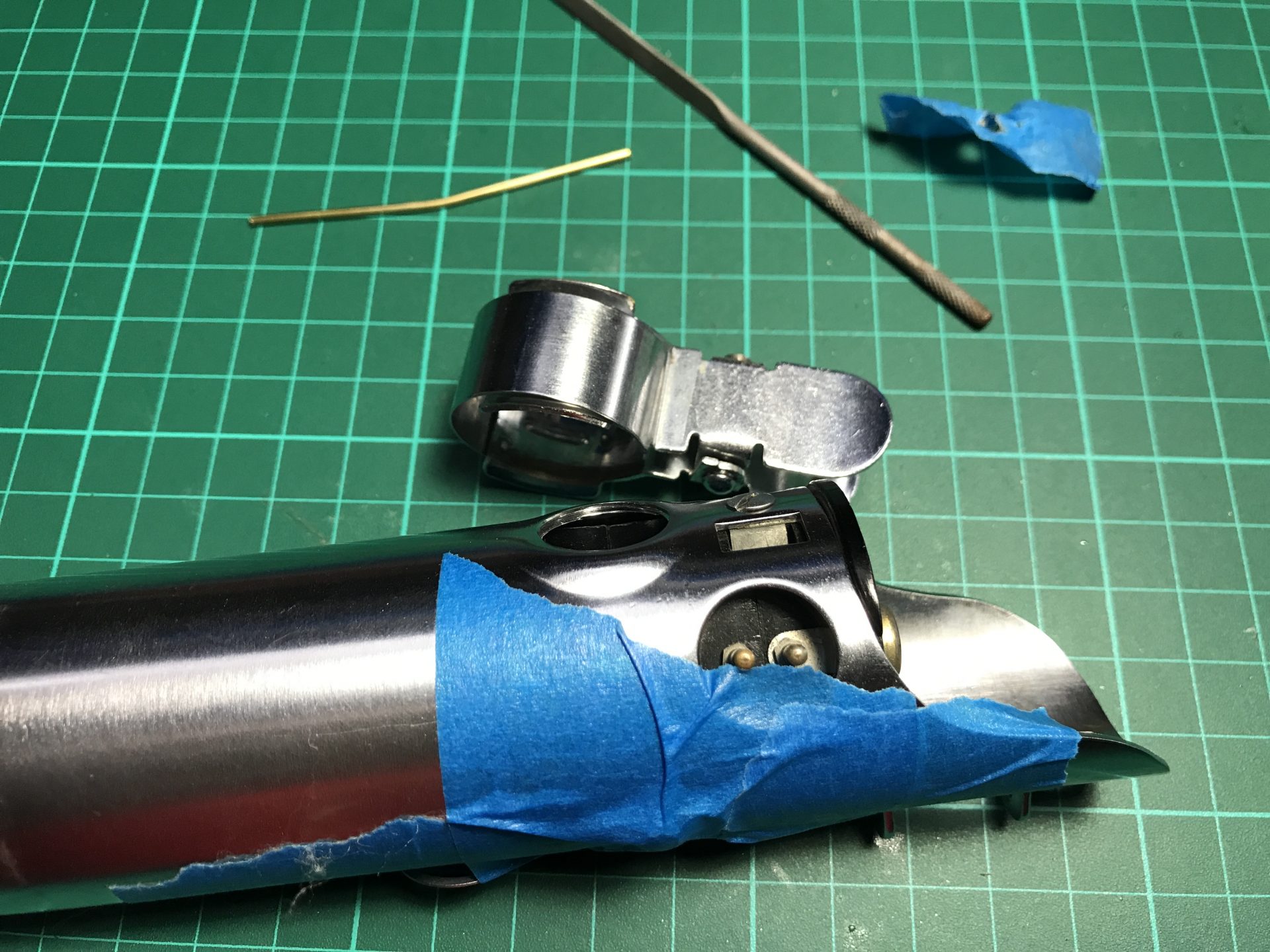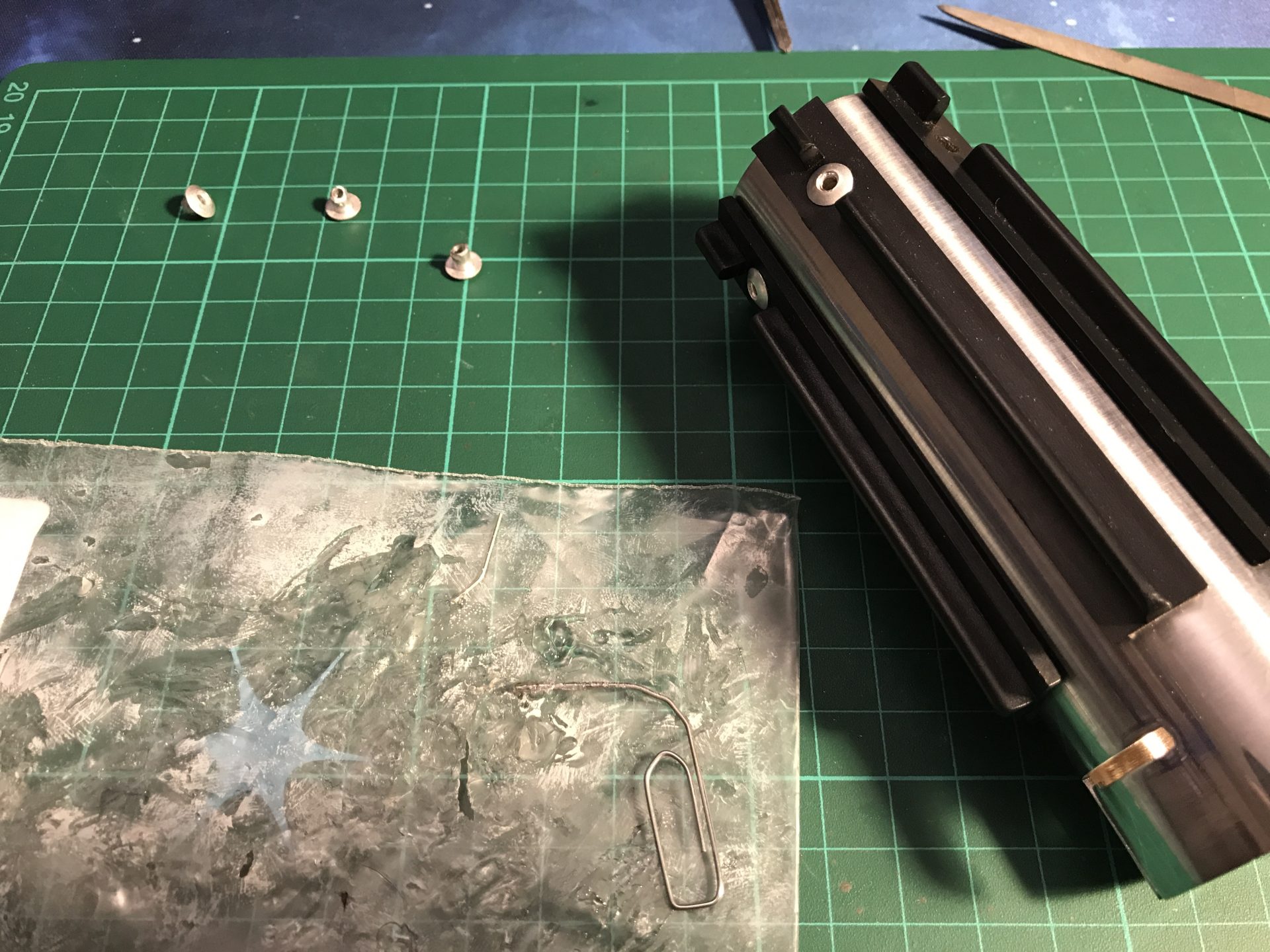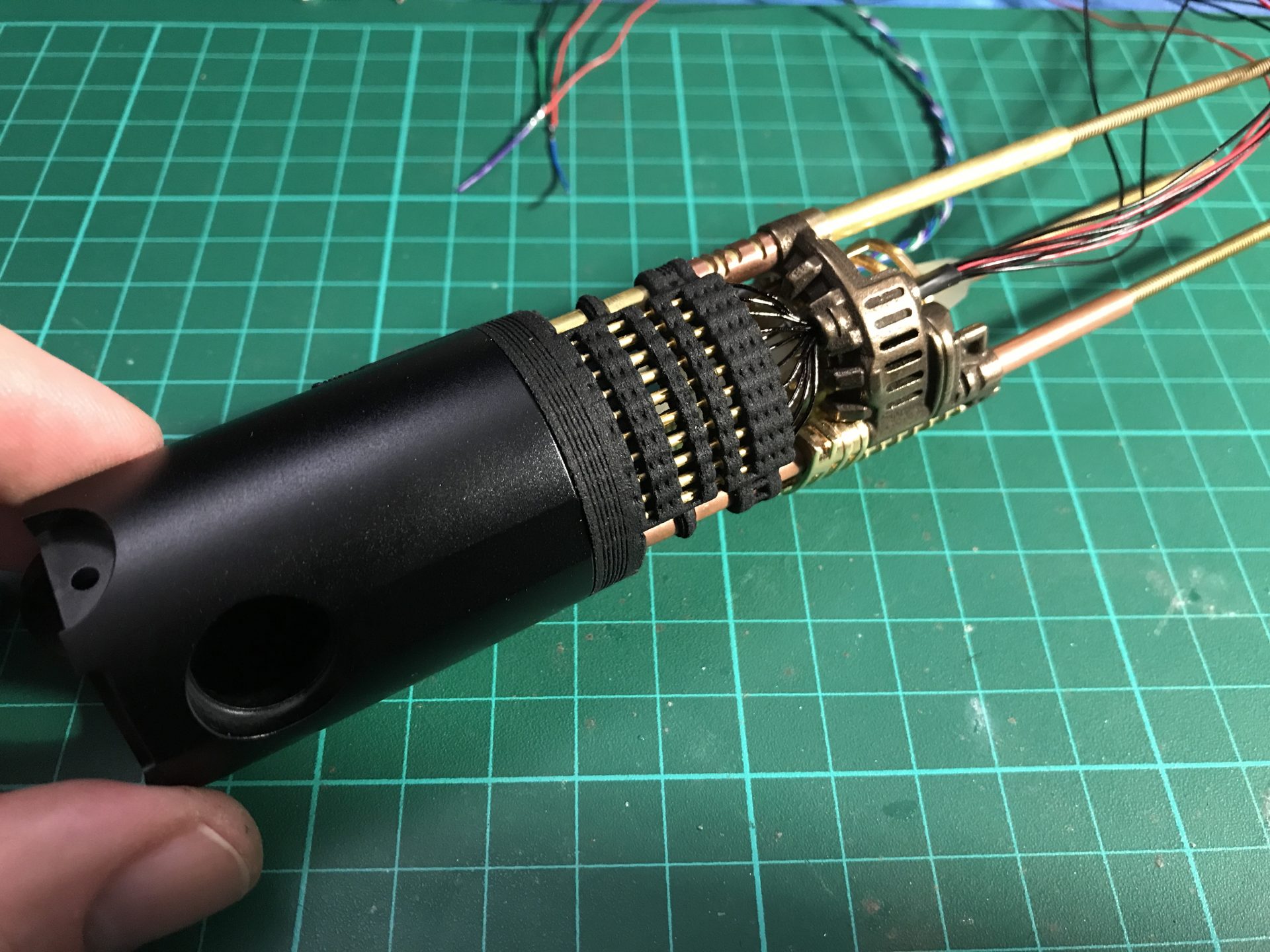 Step 4: You can also cut the electrical contact to glue them on the blade holder and add more vintage accuracy to your hilt.