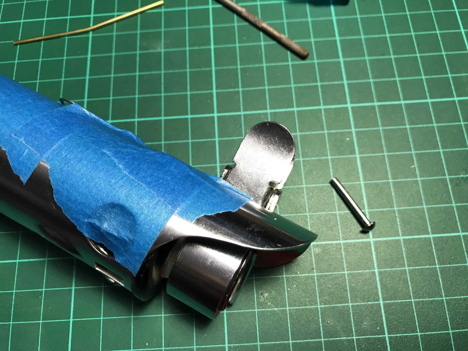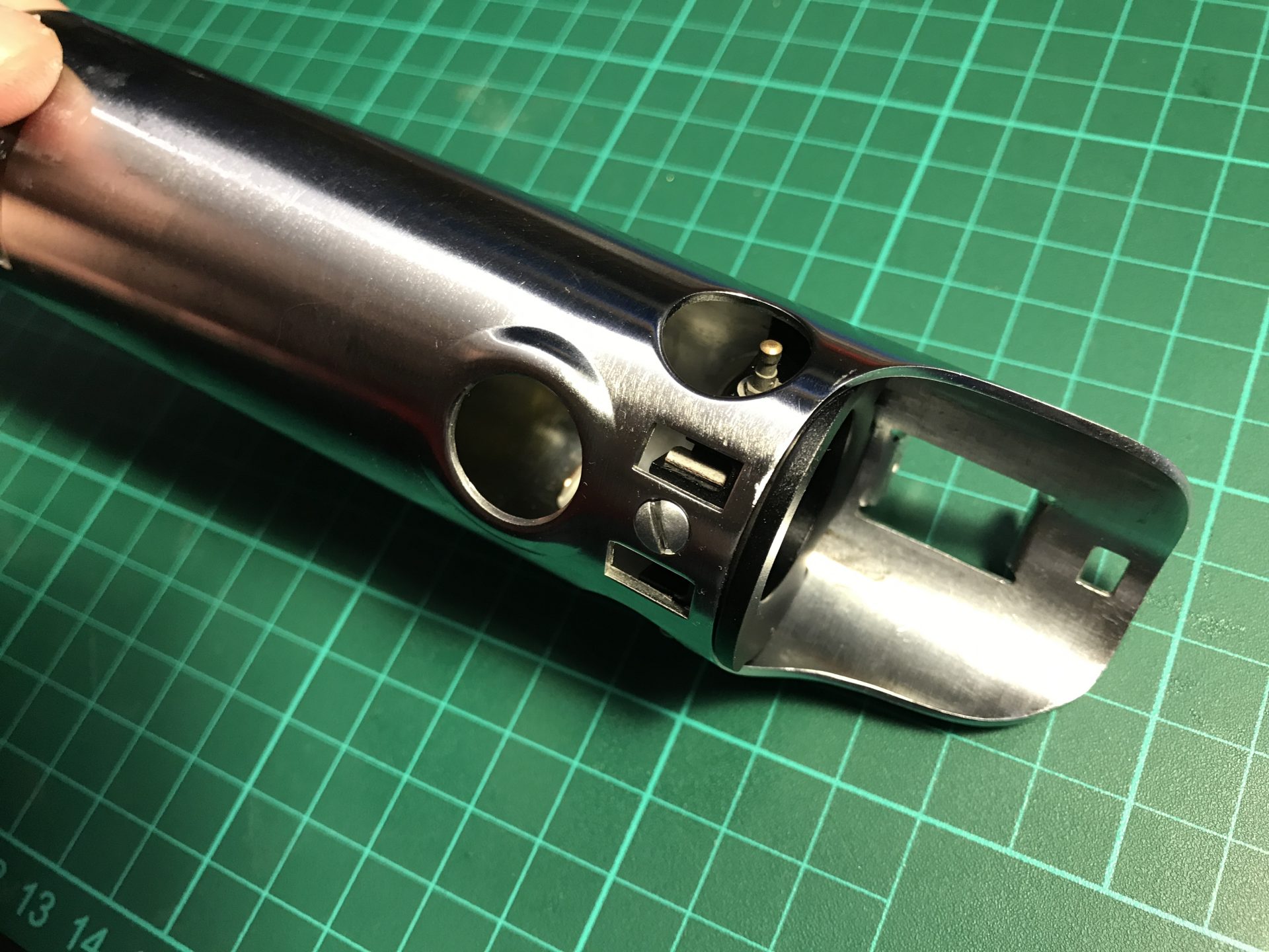 Step 6: Now fit together the 2 parts of the blade holder to check they assemble properly. It might be necessary to carefully hammer the upper part down to avoid a gap in the brass pin socket.