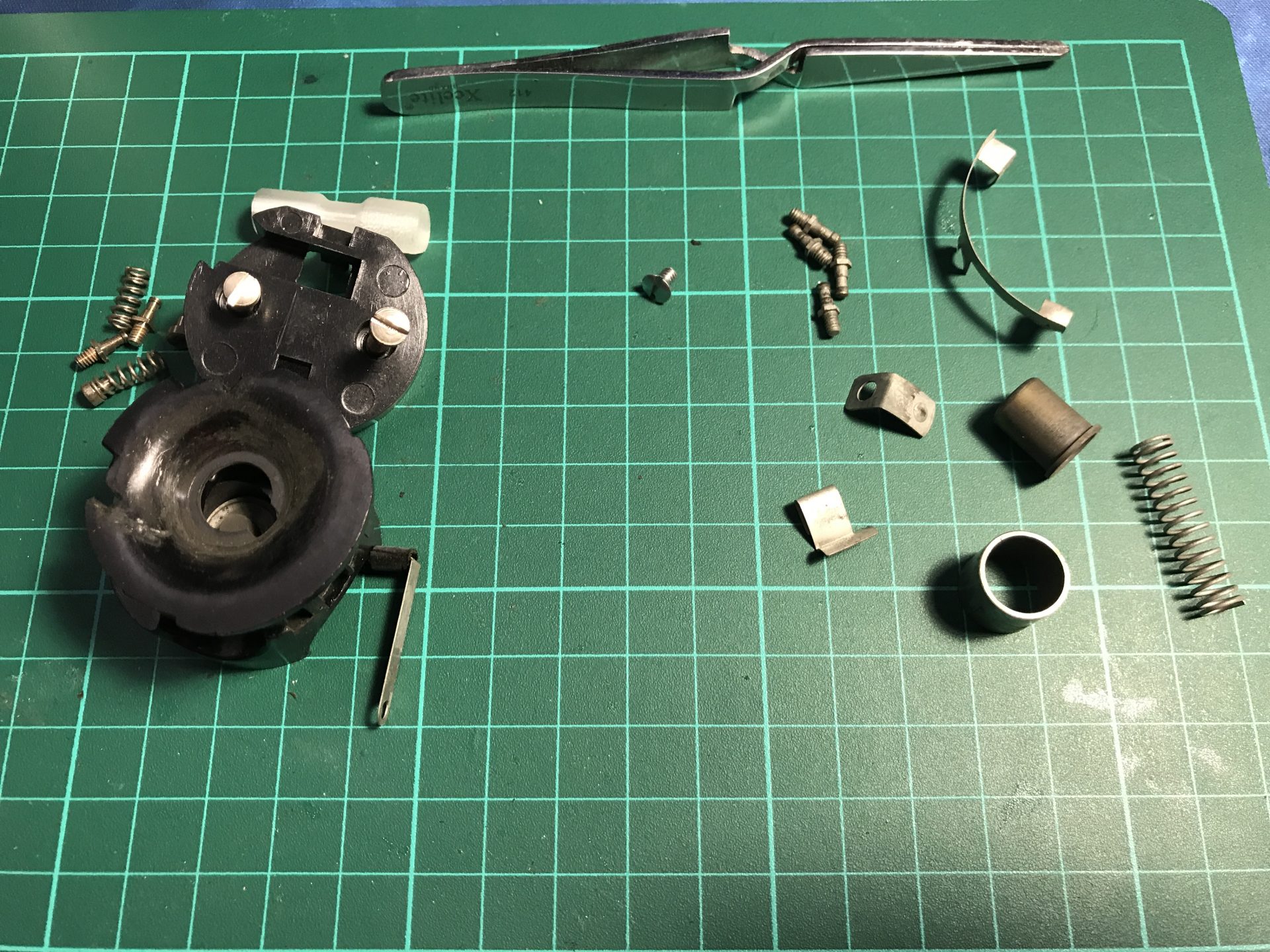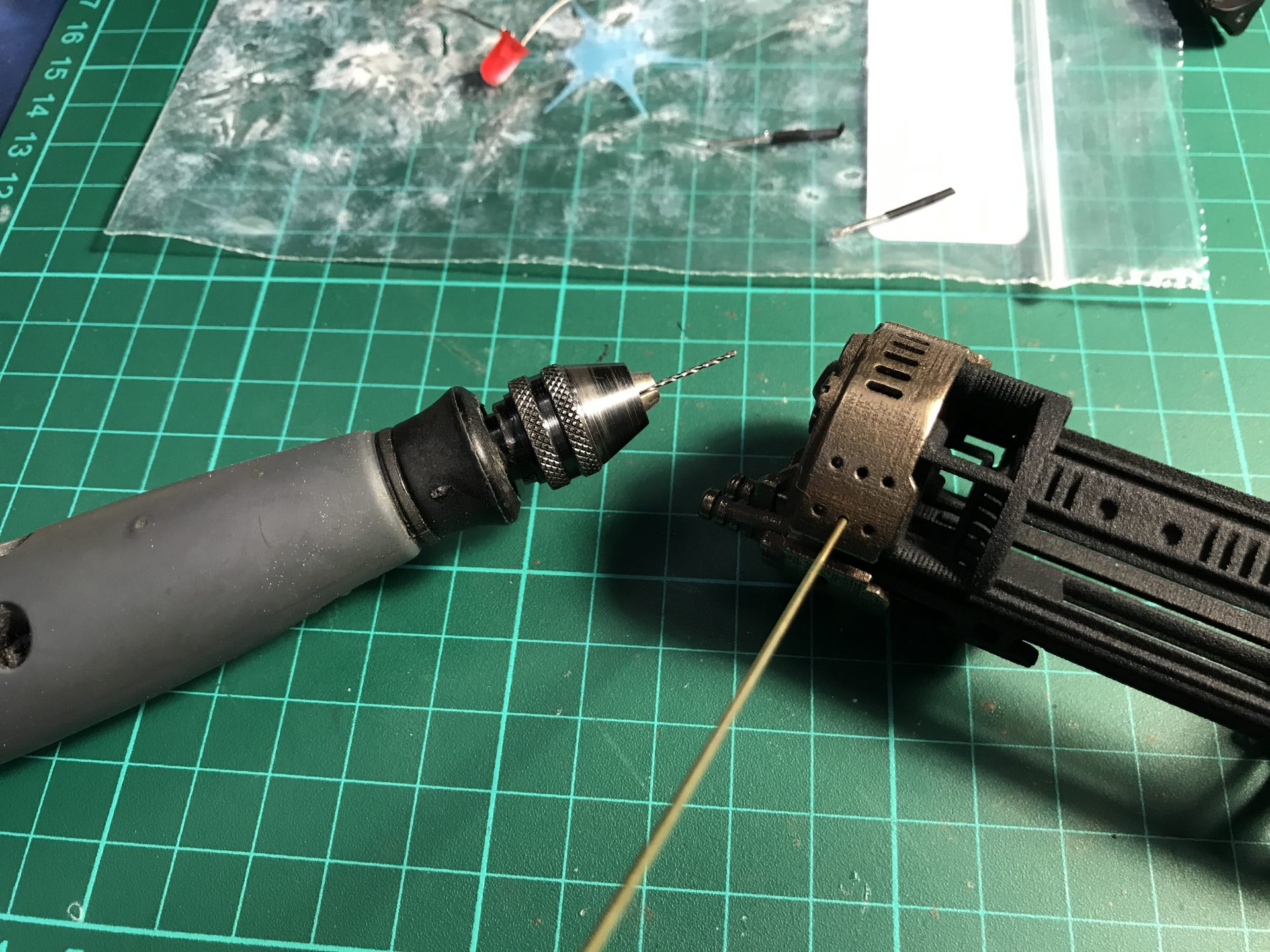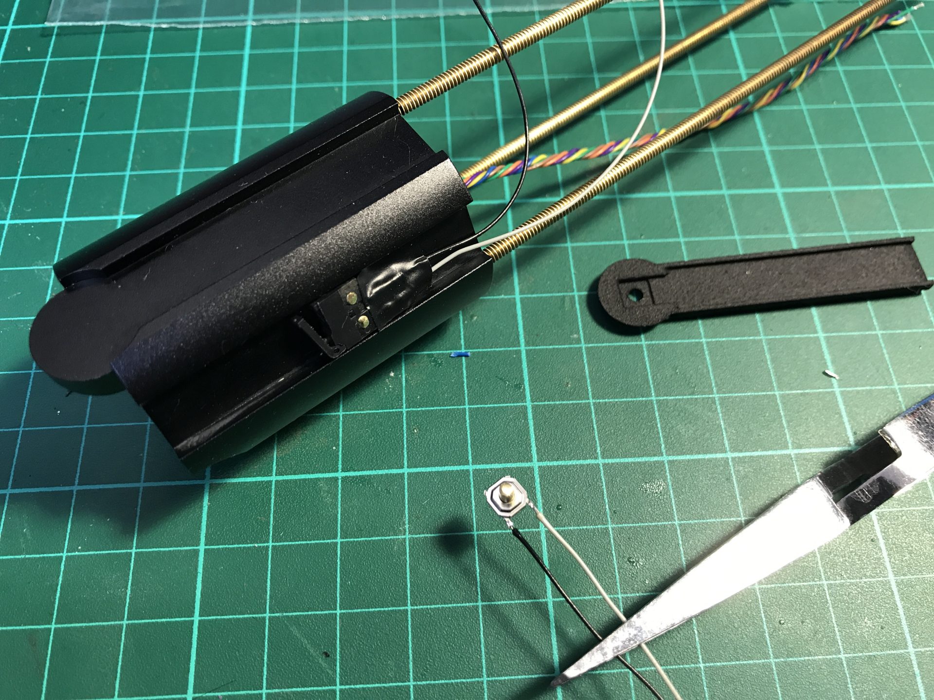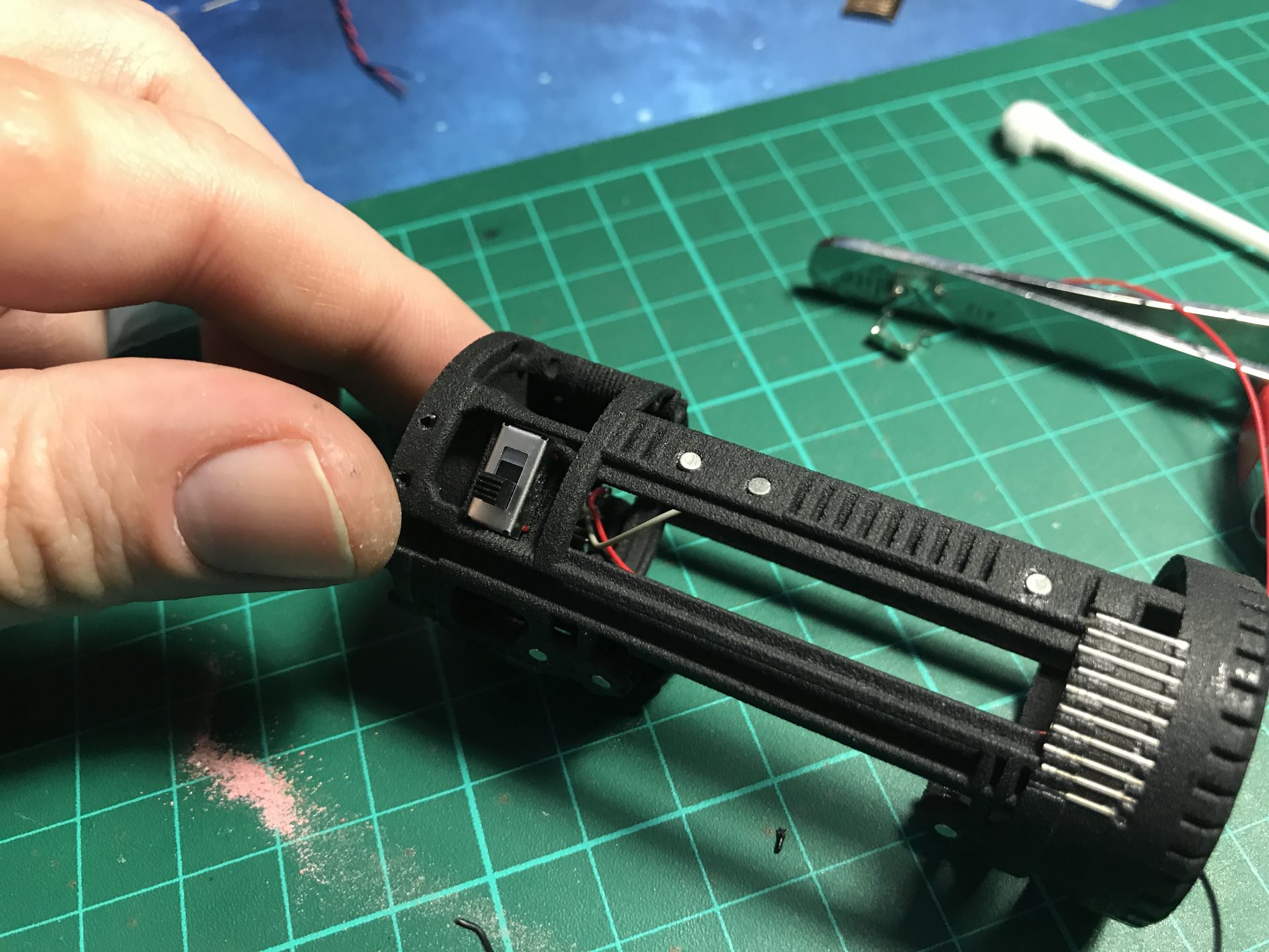 Step 47: Glue a plastic piece under the switch to make it able to activate the main switch on the blade holder.
