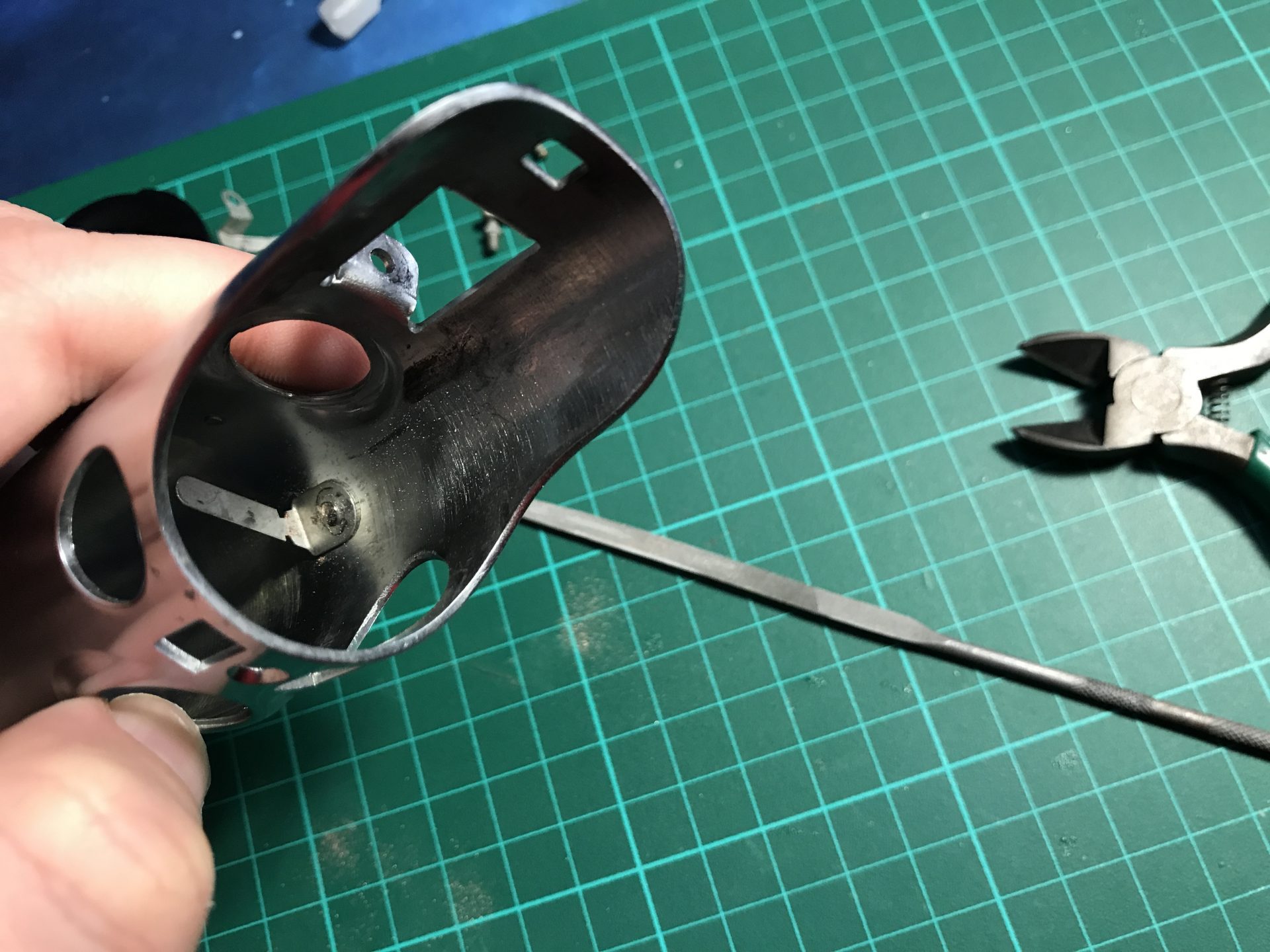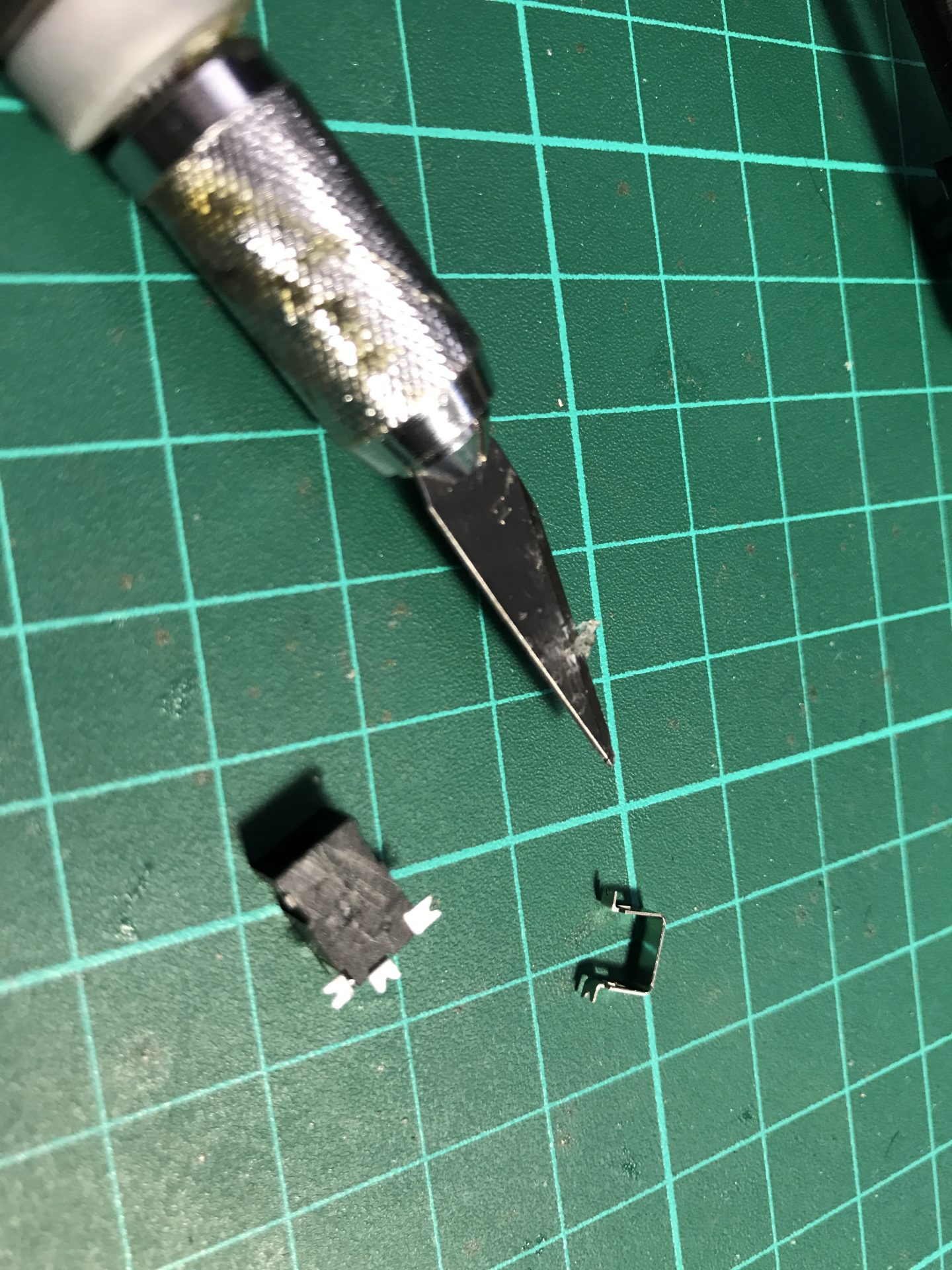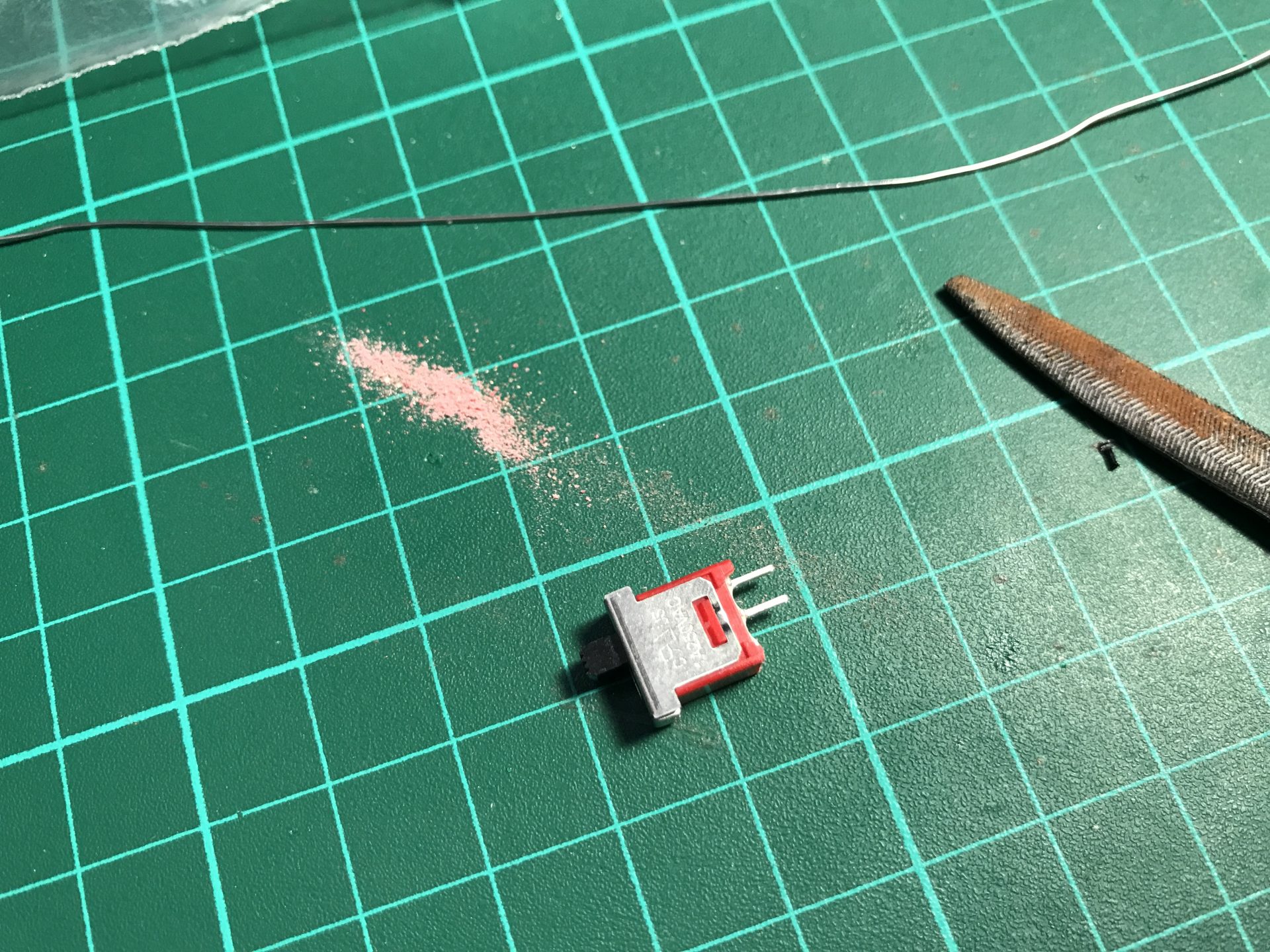 Step 5: The slider switch tab needs to be cut down. We first sanded carefully each border until it could be easily broken by bending the tab. Then sand down the tab until it fits perfectly when inserting the blade holder lower part.