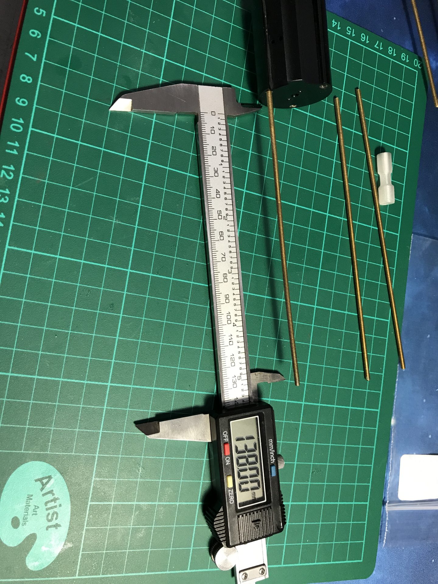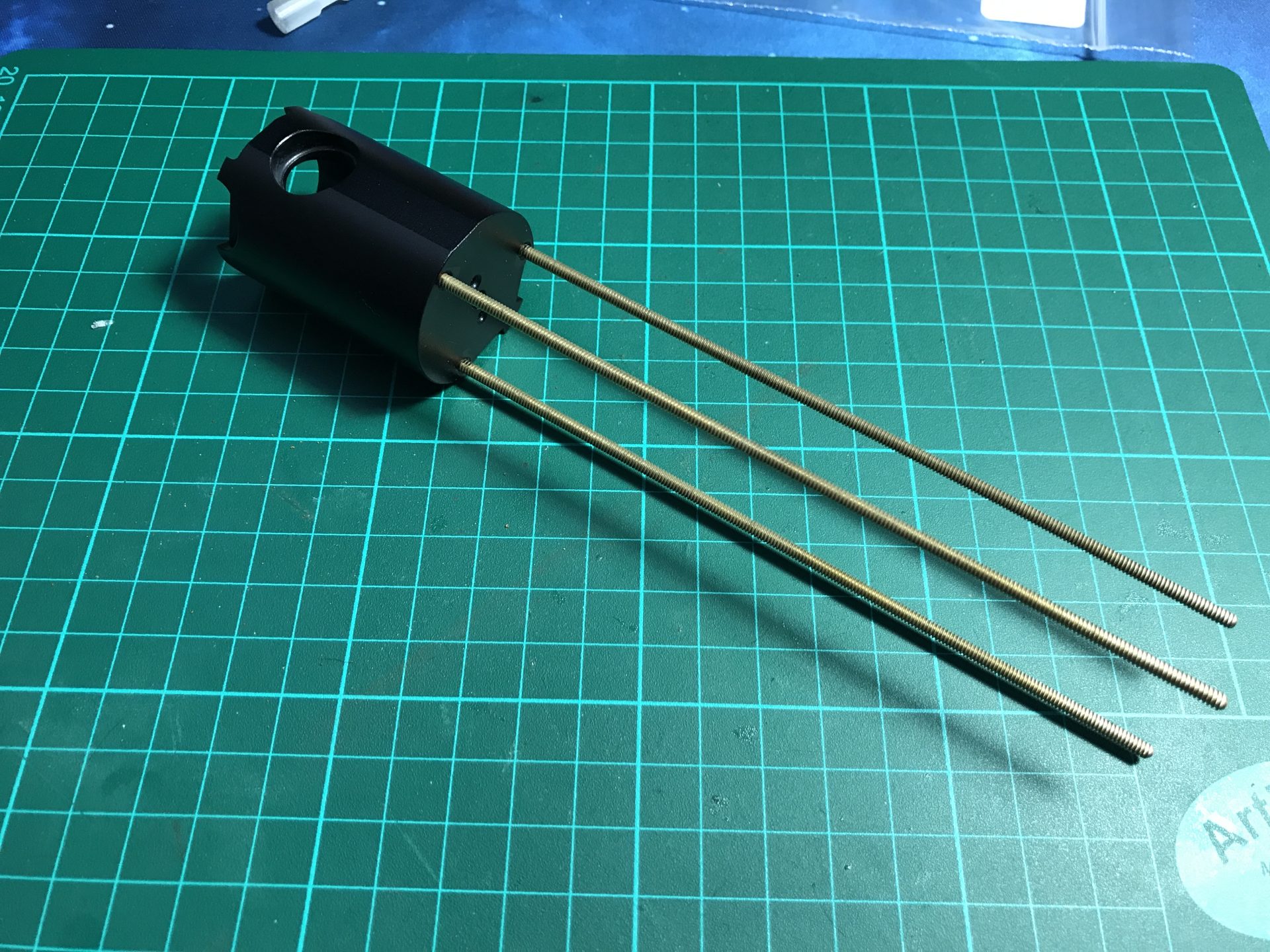 Step 7: Cut the brass threaded rods, the length outside the blade holder must be 138mm, so plan accordingly the additional length to screw them into the blade holder (according to the blade holder used. Make sure the 3 rods have the same length once screwed in (as a test, the blade holder should sit fit on the 3 rods without falling down).