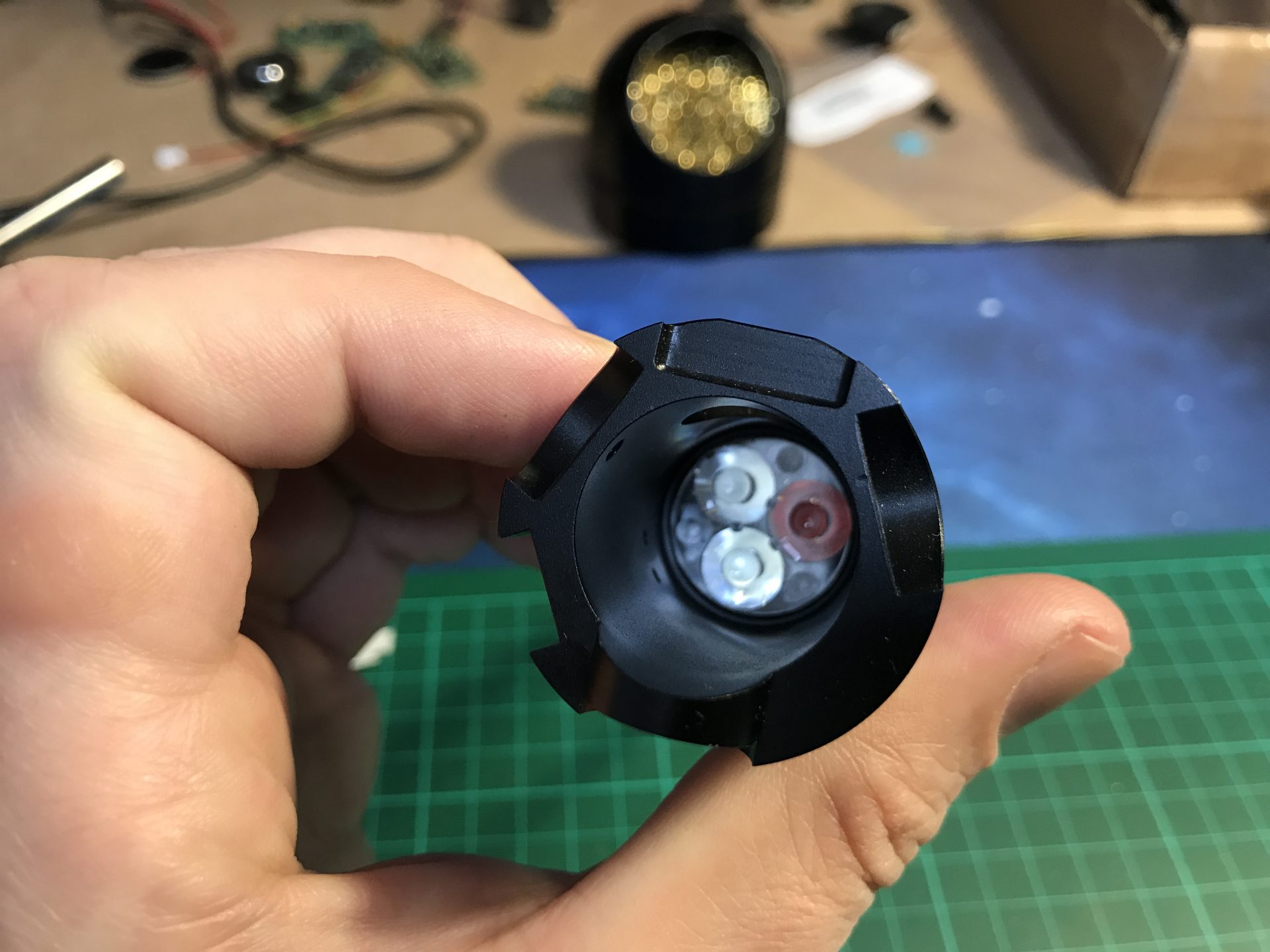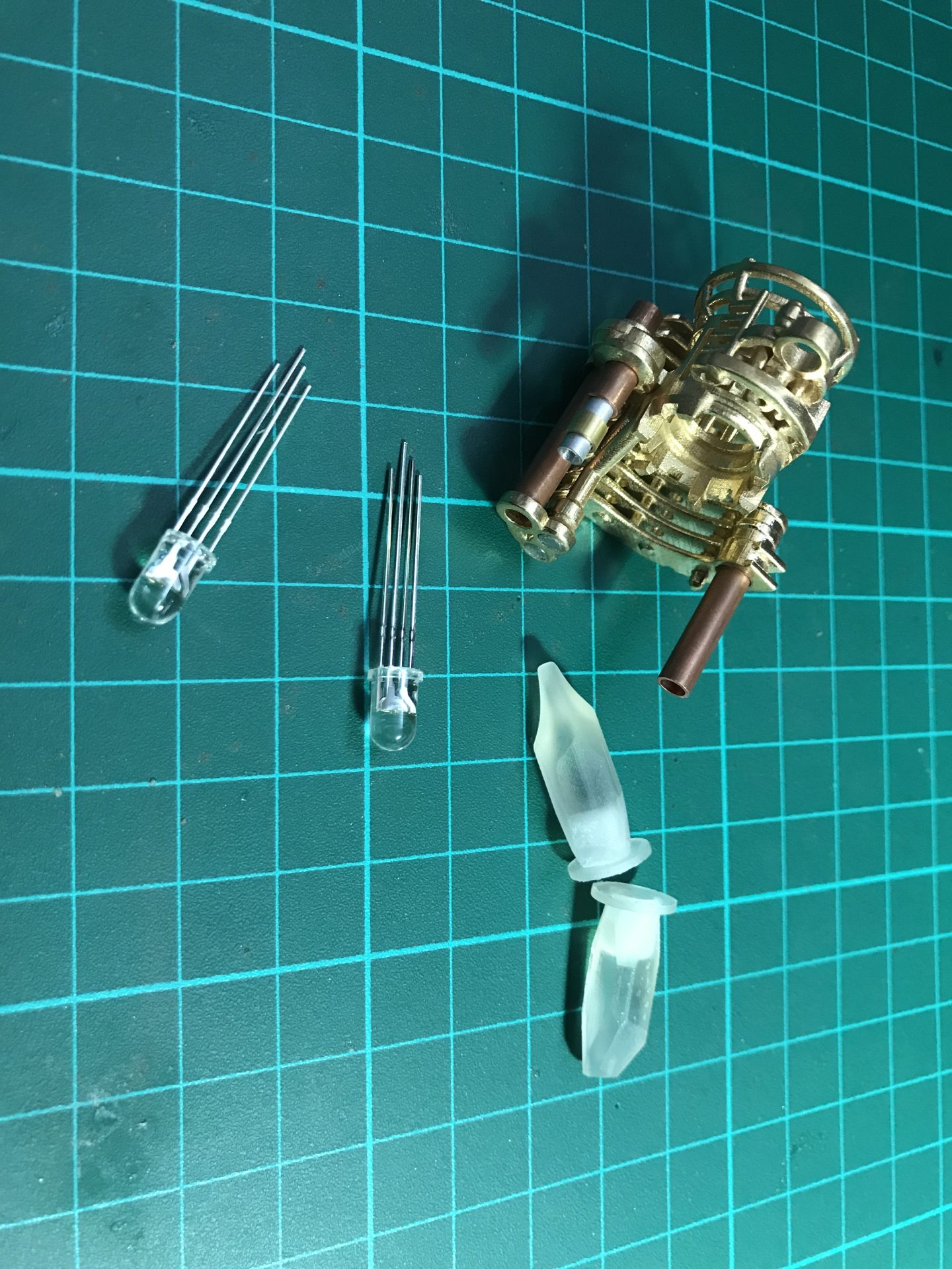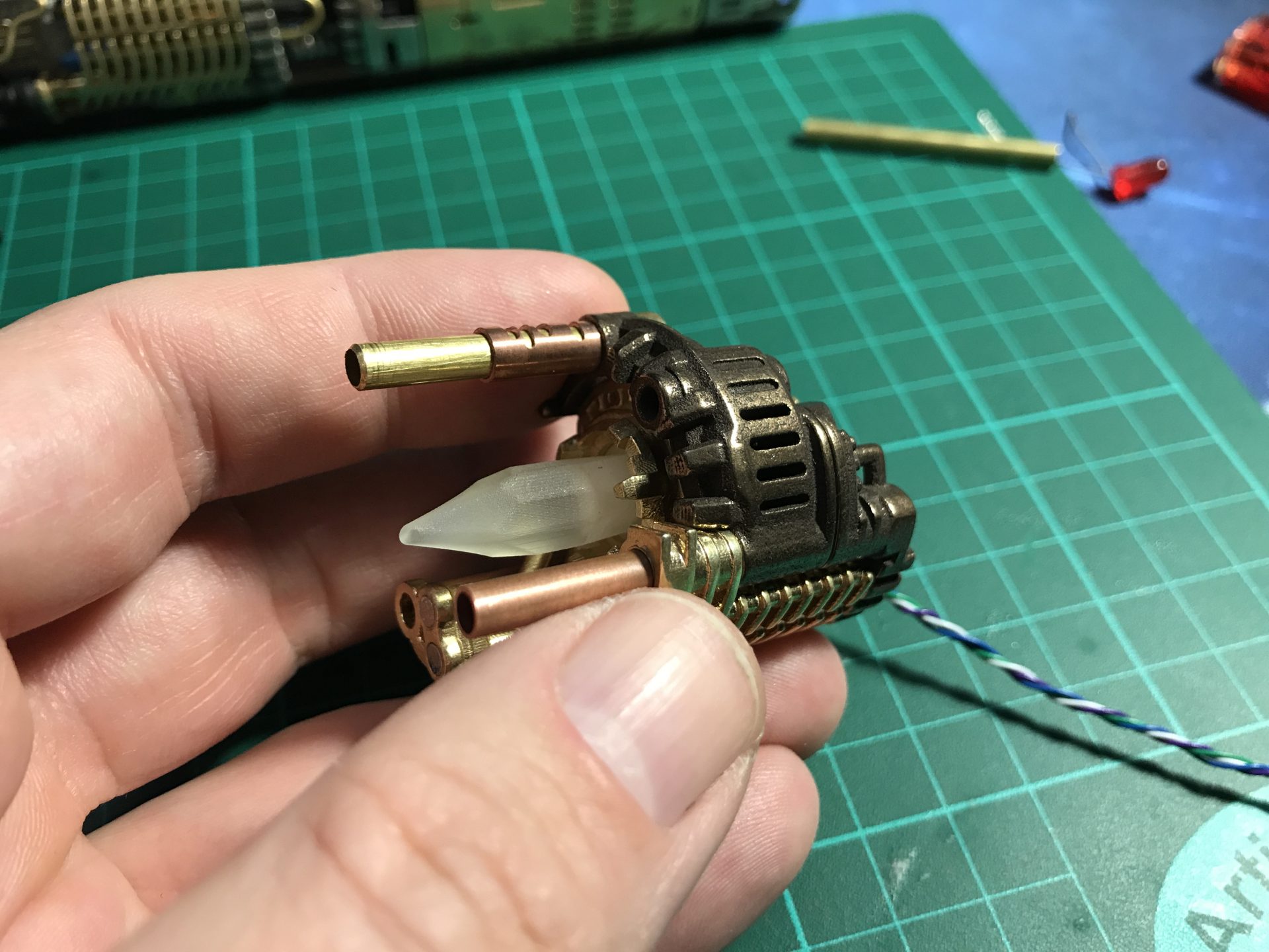Step 19: To install the Crystal Chamber leds, we join together and solder two 5mm RGB back to back. The led assembly can only be inserted in the chamber from one side (make sure you limit the led leads to the minimum). The wires exist from the side of the CC as shown in the pictures below. Then add and glue your crystals (after testing the leds work fine of course).