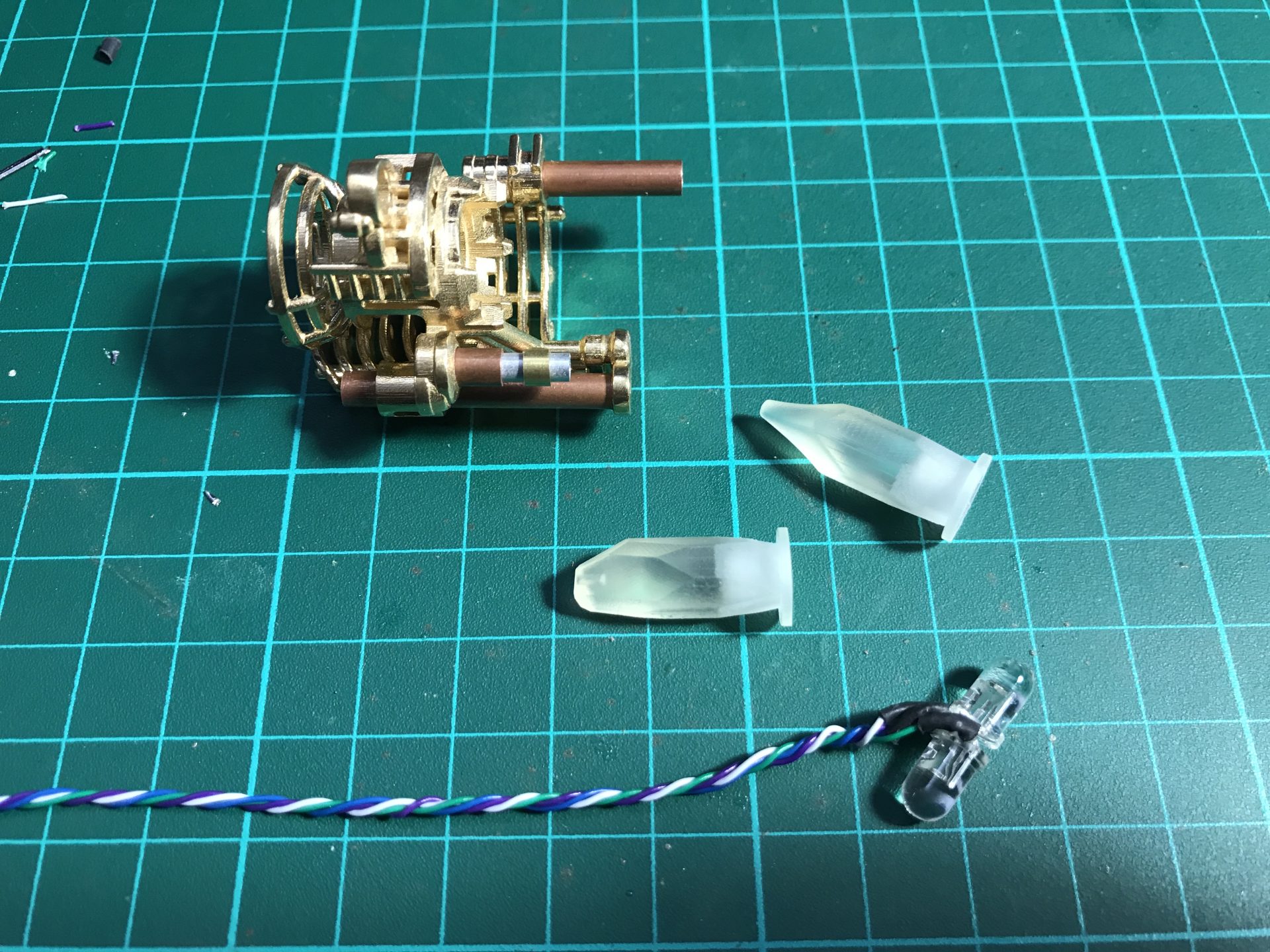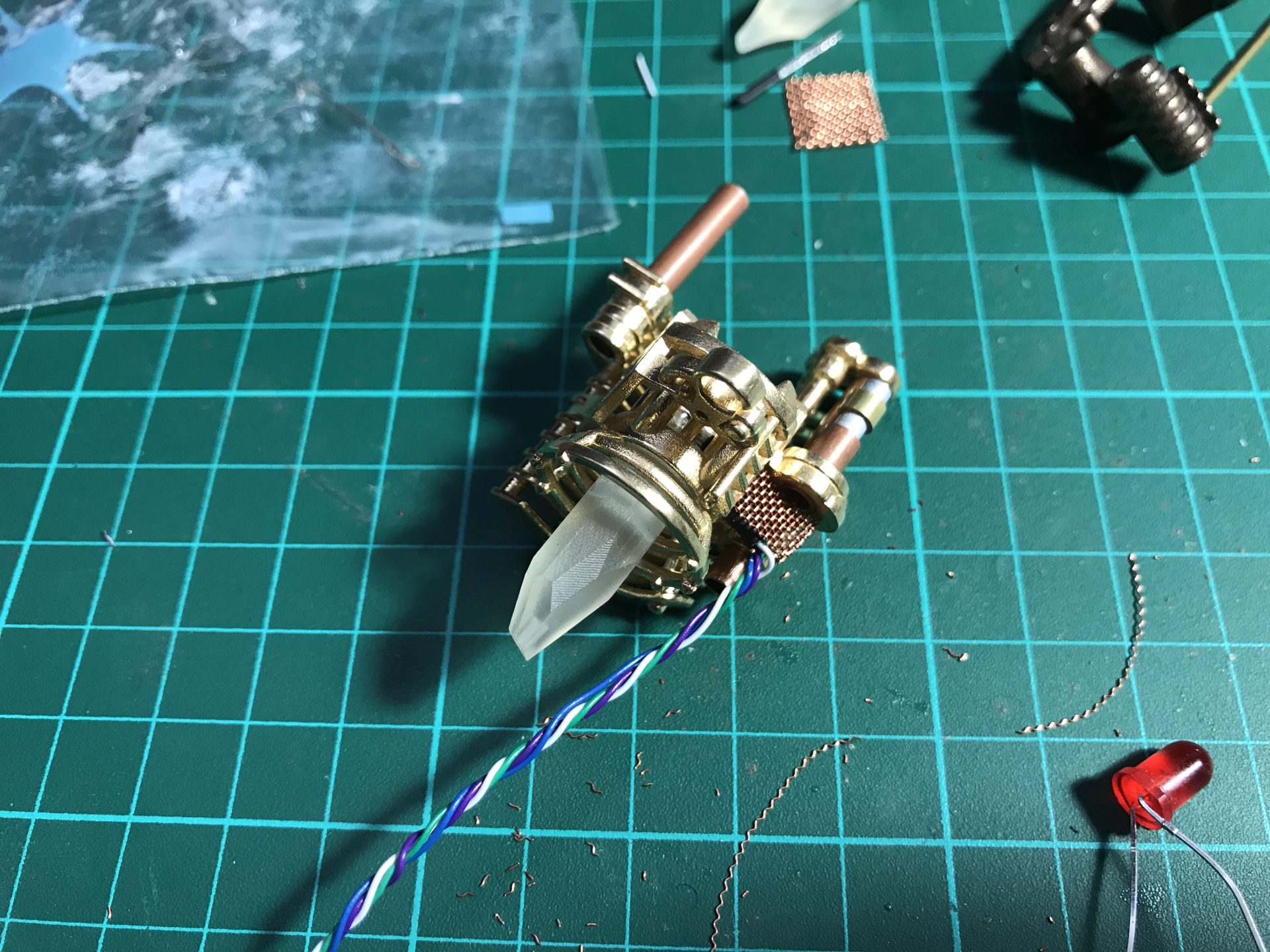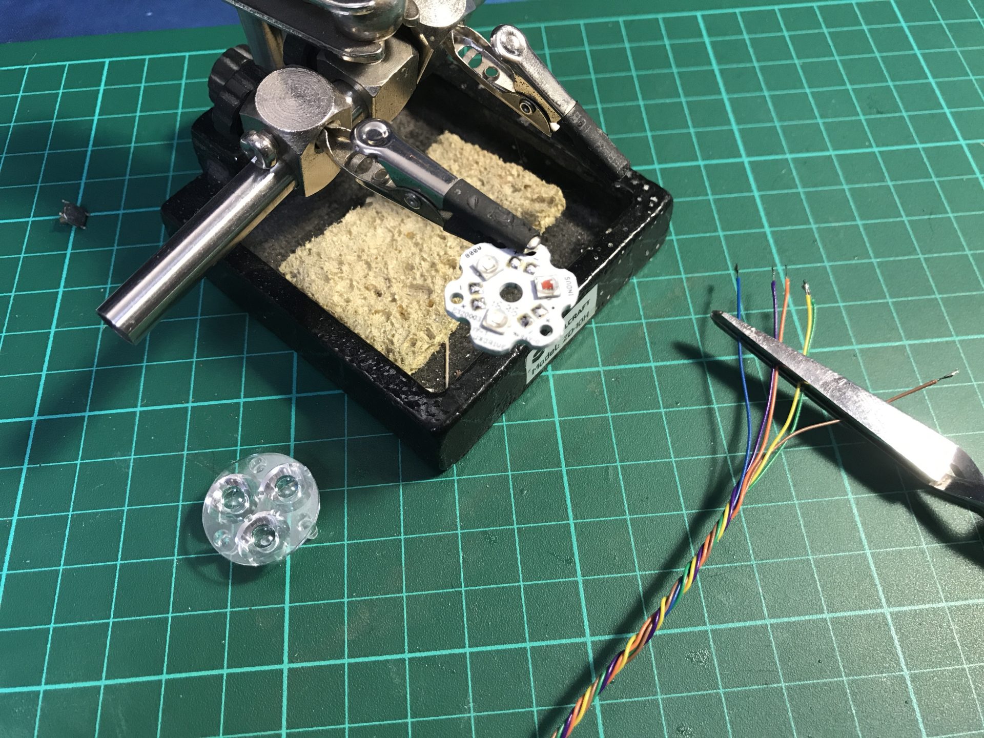 Step 19: To install the Crystal Chamber leds, we join together and solder two 5mm RGB back to back. The led assembly can only be inserted in the chamber from one side (make sure you limit the led leads to the minimum). The wires exist from the side of the CC as shown in the pictures below. Then add and glue your crystals (after testing the leds work fine of course).