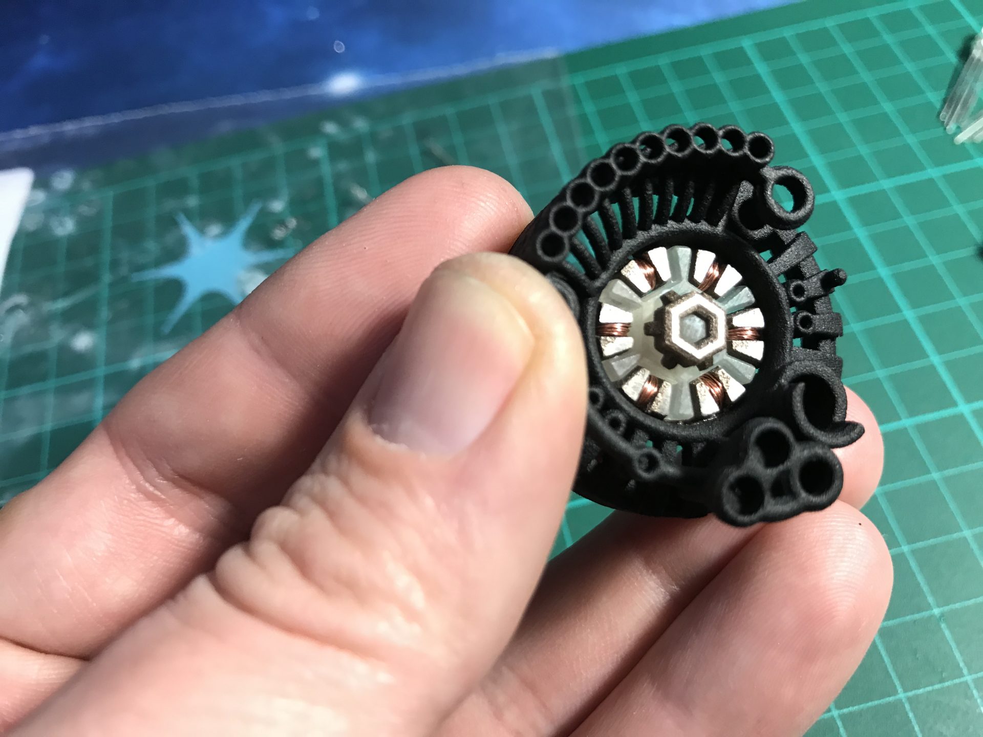 Step 12: Assemble the Arc Reactor parts (the top part needs to be cut out of the main part). If printed in steel, they can be polished for a better look. Use copper wires to build the Arc Reactor (electric wires for example as a good source). Once the wires attached and secured, insert the frosted plastic part (press fit normally). Then, glue the Arc Reactor into the front chassis part, there is a notch in the reactor part that aligns with the biggest hole of the front chassis part (the reasto.