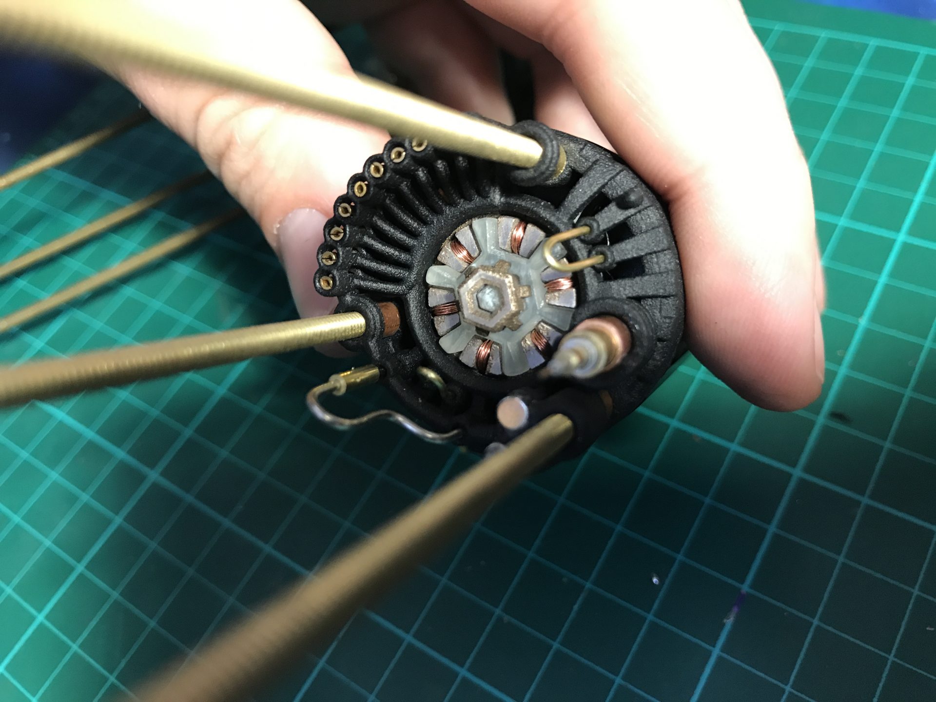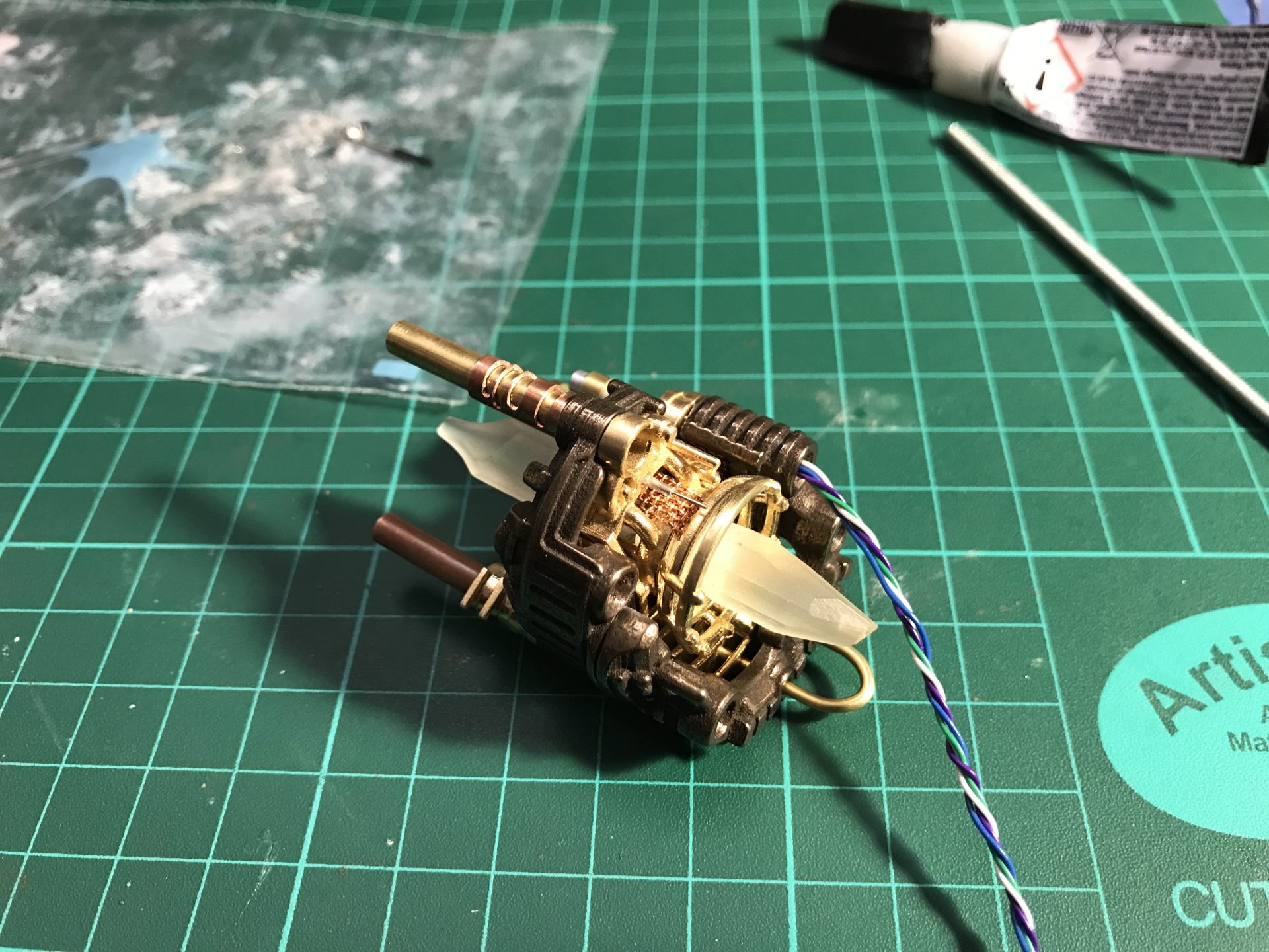 Step 21: As shown in the pictures below, add the Rod 1.5mmOD U Shape to complete the Crystal Chamber assembly (add a bit of super glue at the end of each rods to secure them).