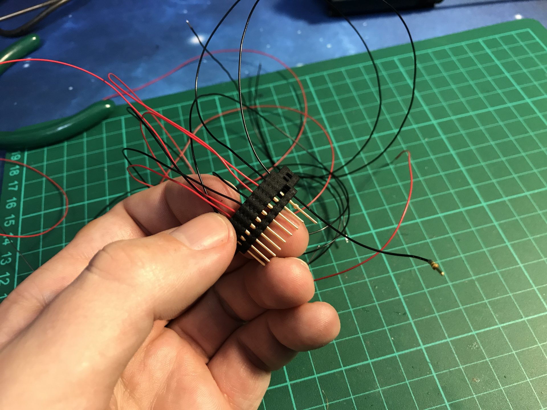 Step16: Install the female pins. Make good note of your wires positions, cut them to leave just enough margin, then solder the female pins. When soldering the pins, make sure to leave no except of pewter on the pins, as it will prevent them to be inserted currently into the holder. We used super glue (tiny drops) to secure the pins in the holder.