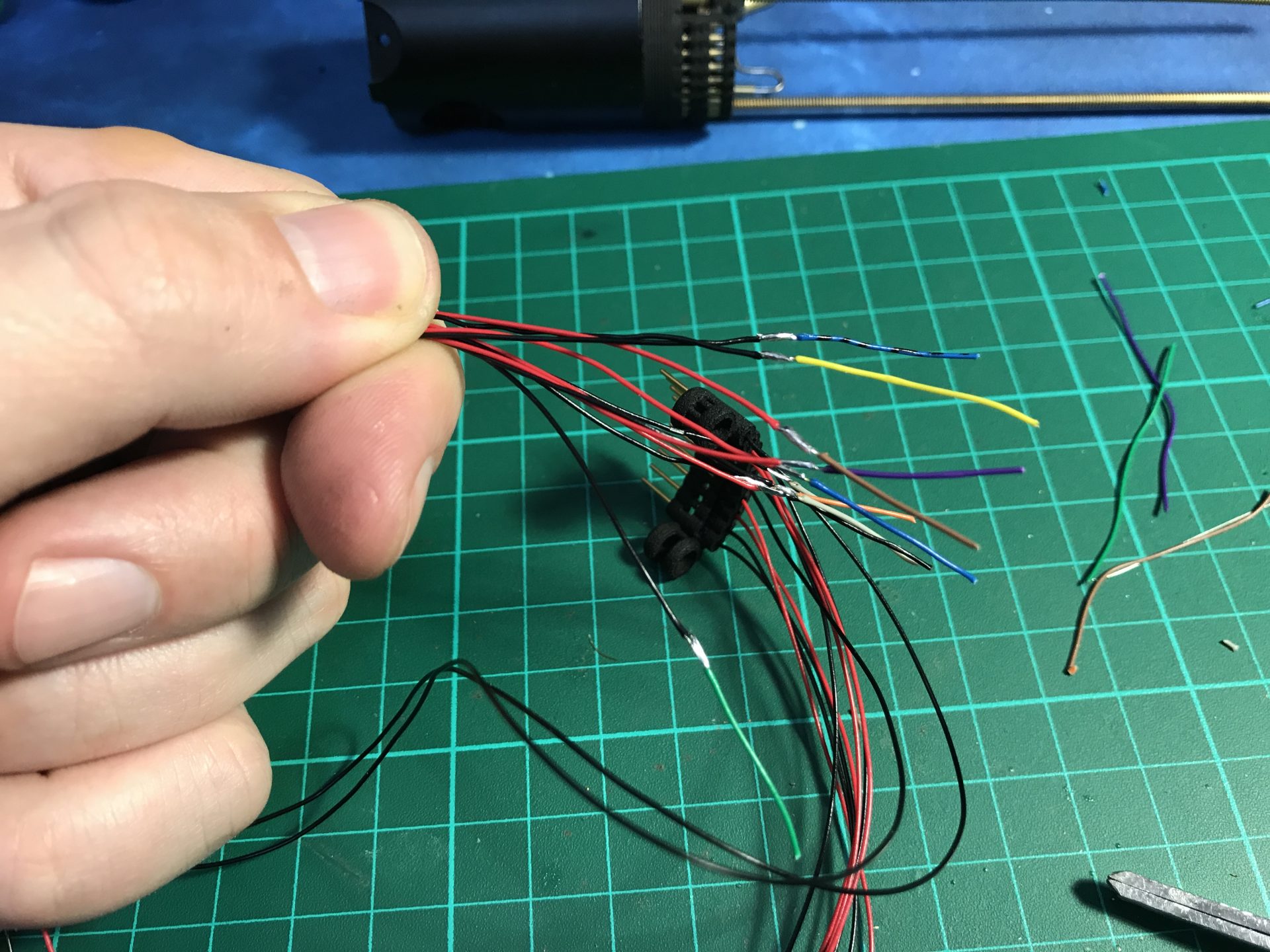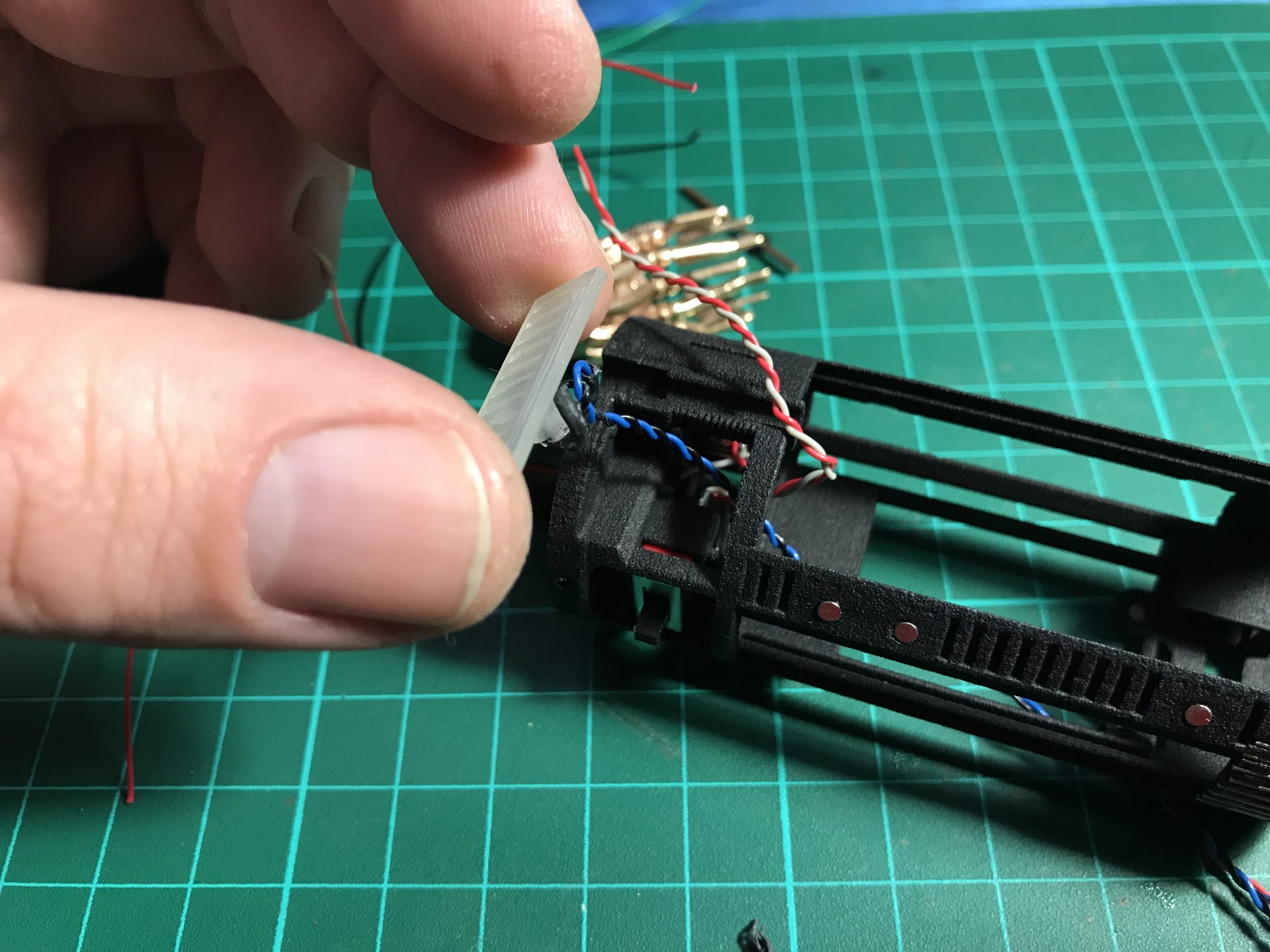 Step 17: Solder the male pins (same advice, to not exceed on the amount of pewter). We used super glue again to secure the male pins in the dedicated holder. The wires being exposed, choose the color of wires you prefer. You can then identify the wires at the end by using a small length of colored wire. Once the custom male plug is done, you can insert it on the chassis rods