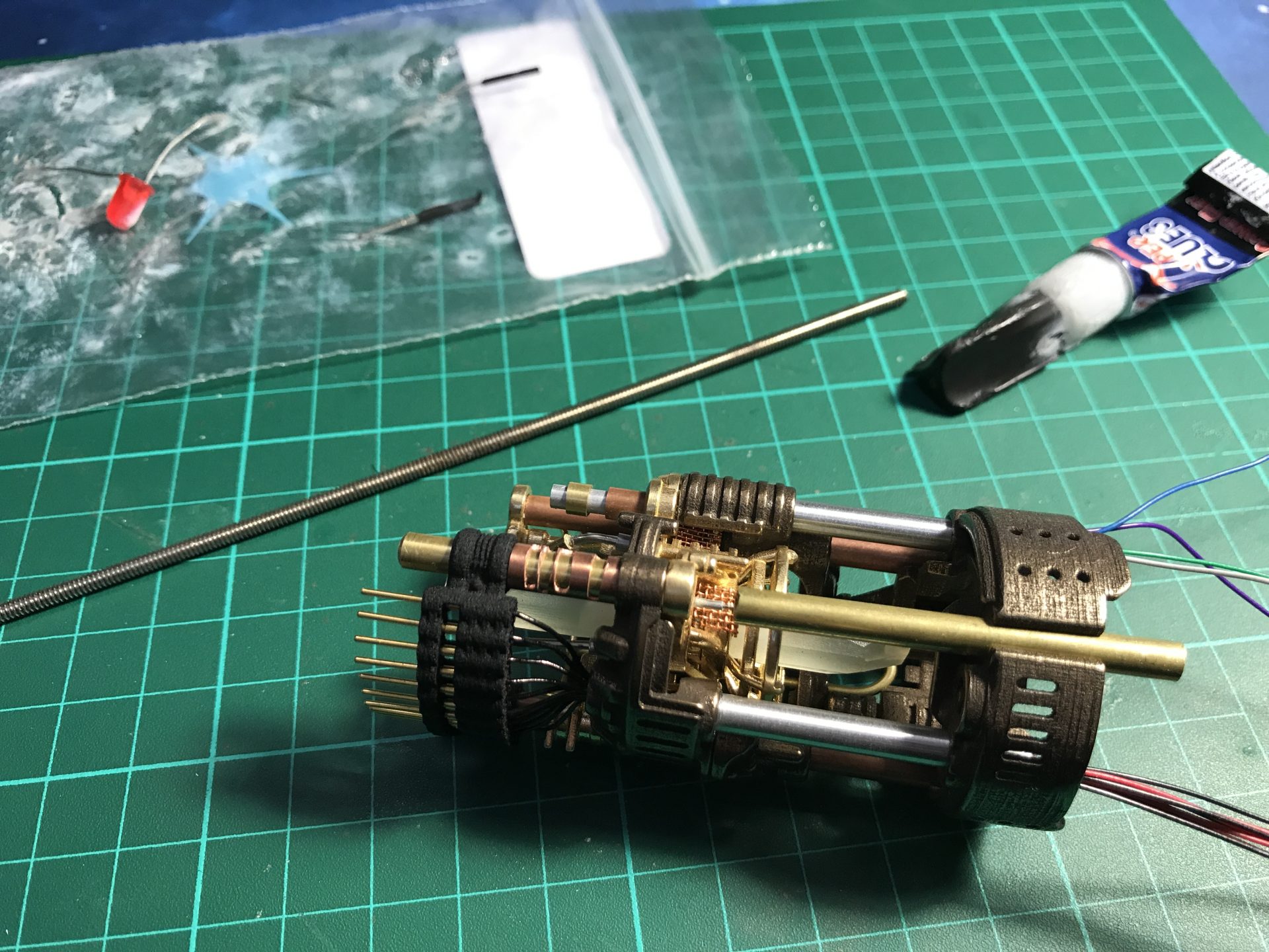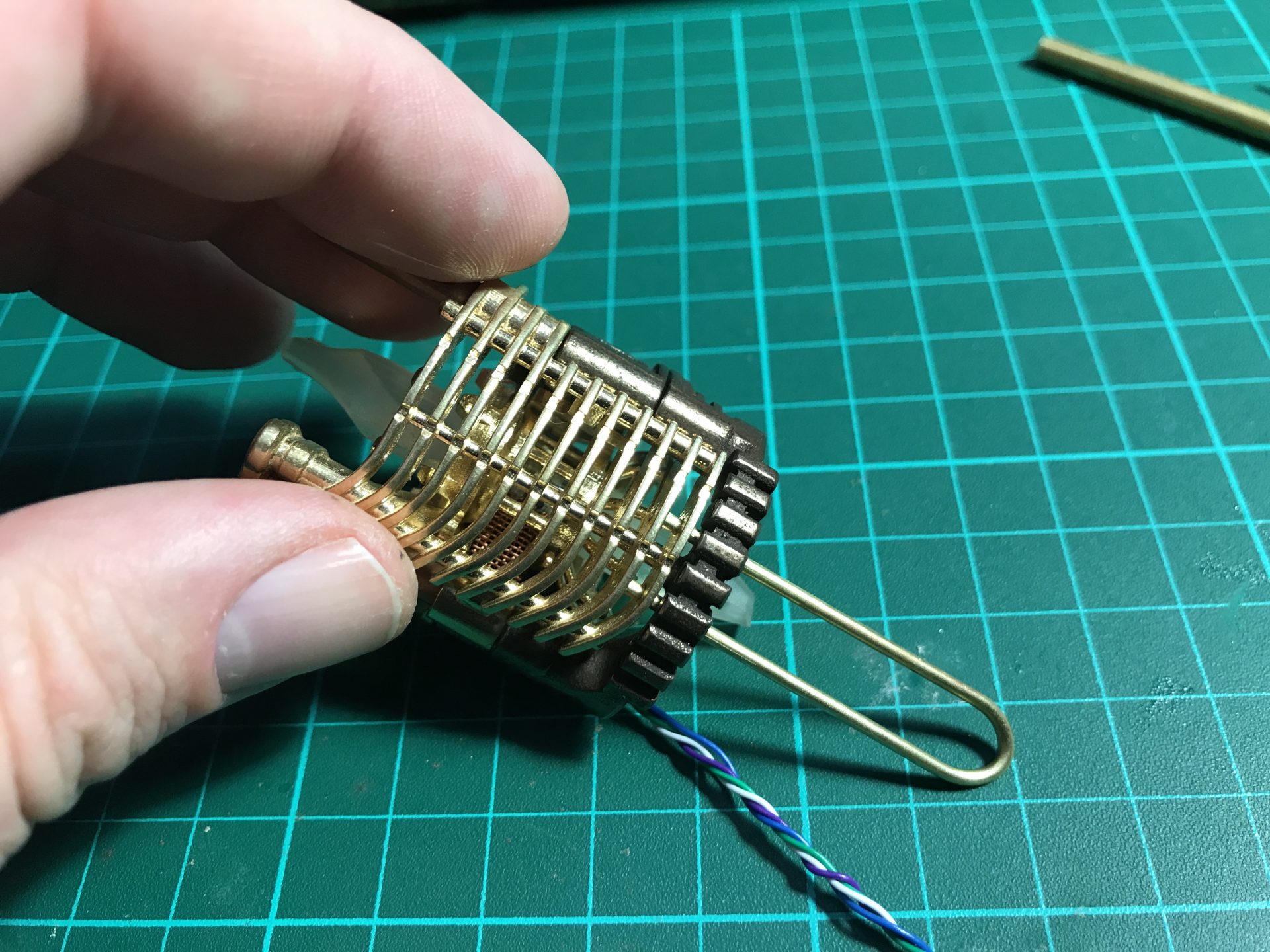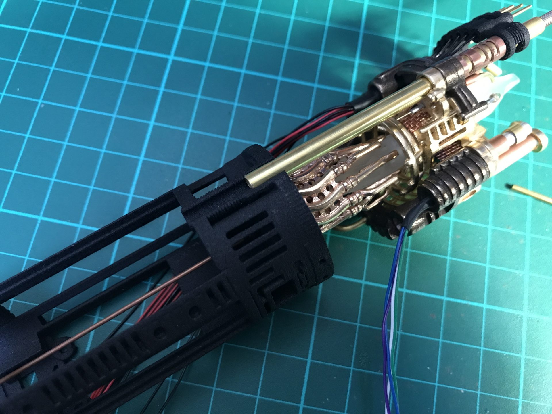 Step 26: Pass the wires into the dedicated channel tubes. Then add part06 and glue the tube to it. Make sure the whole assembly is strong enough,