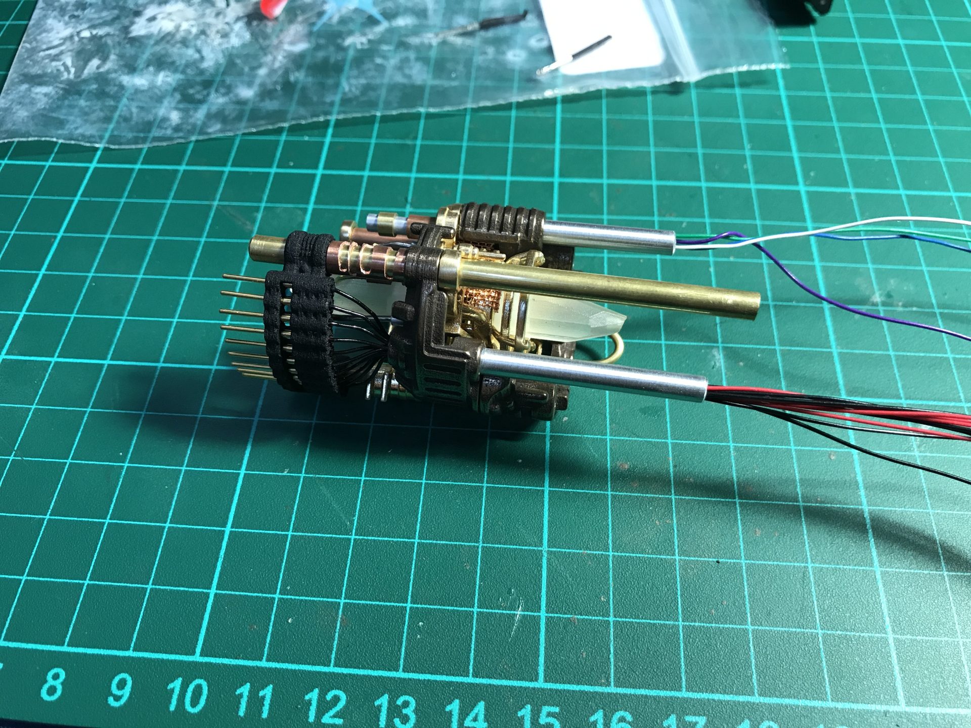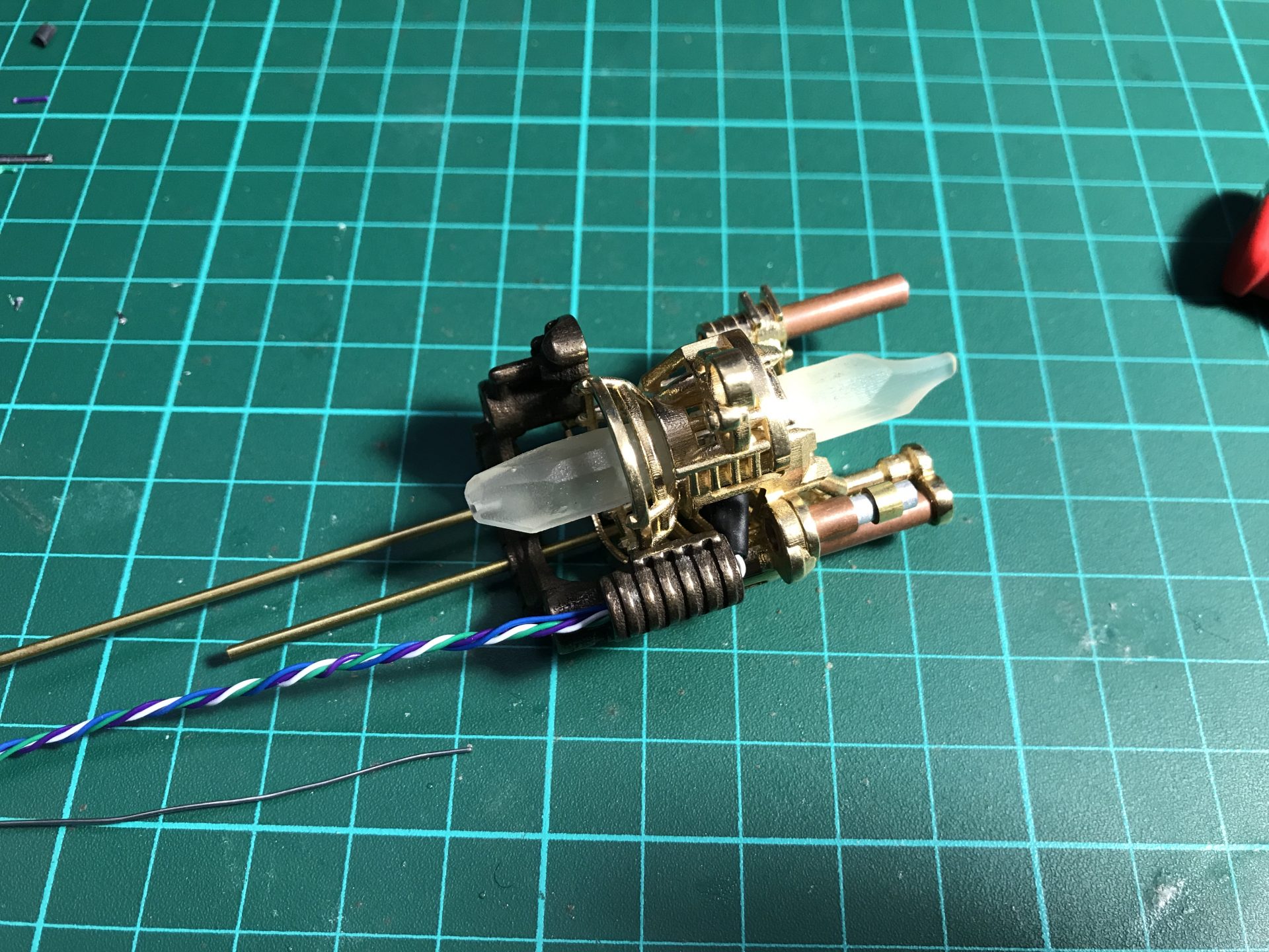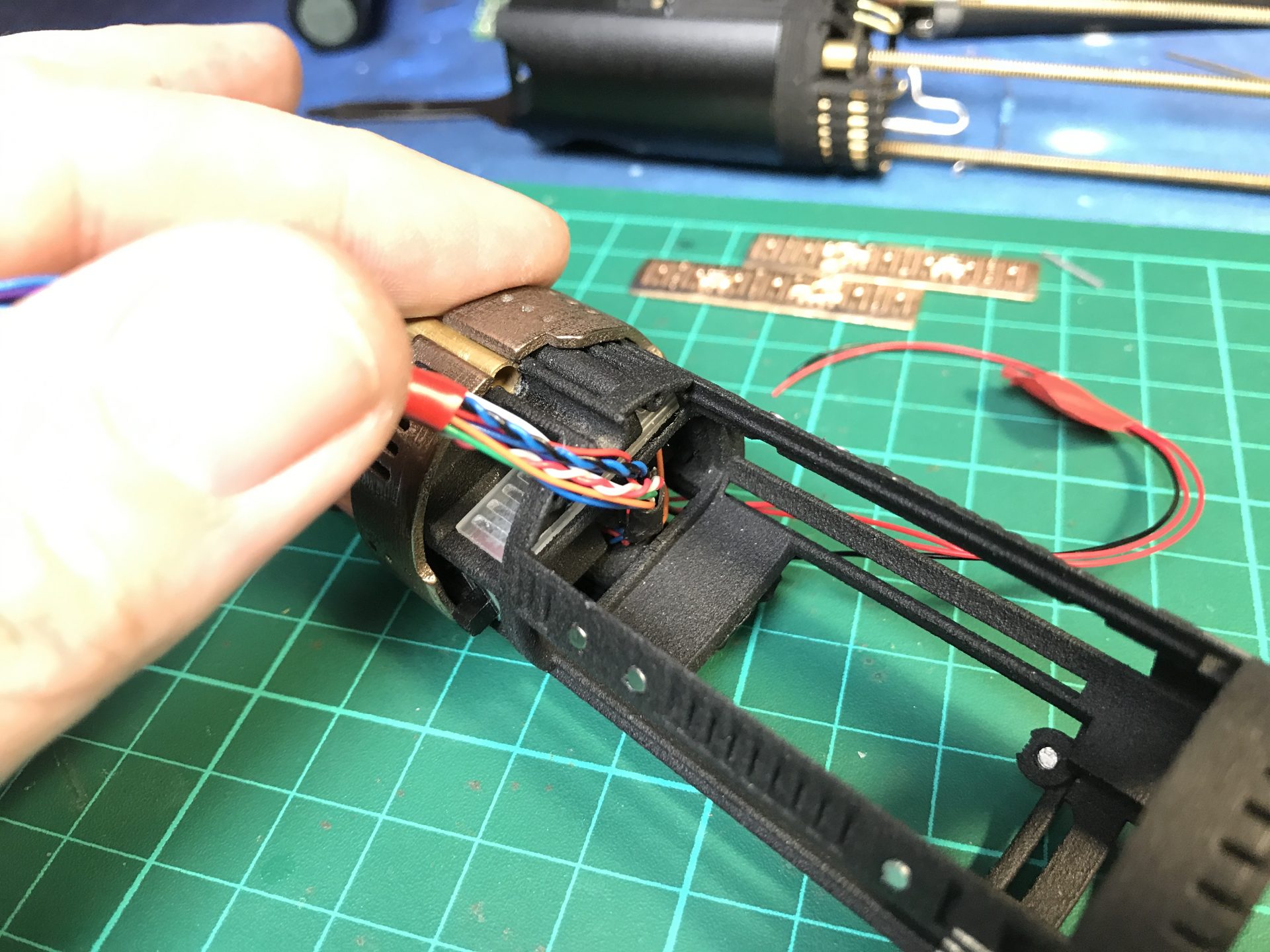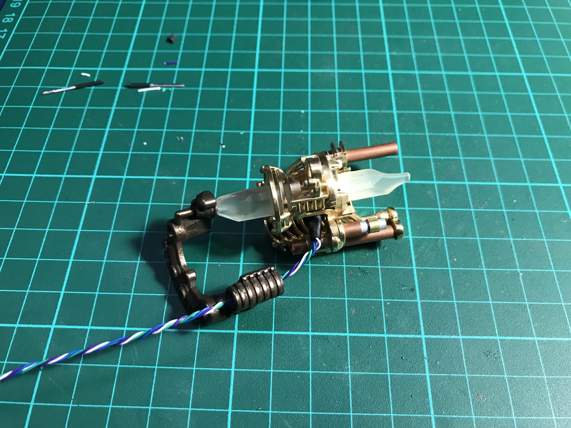 Step 26: Pass the wires into the dedicated channel tubes. Then add part06 and glue the tube to it. Make sure the whole assembly is strong enough,