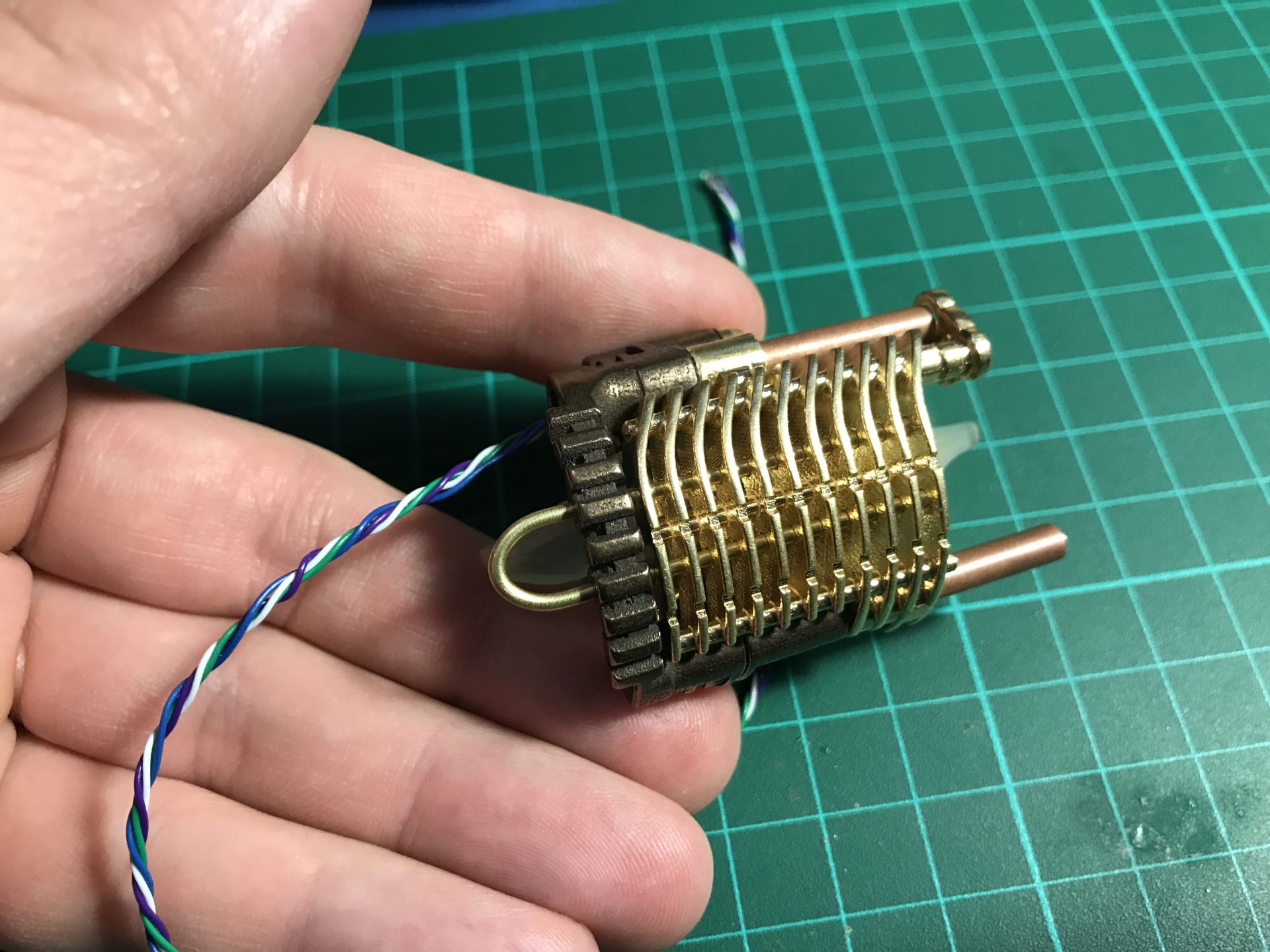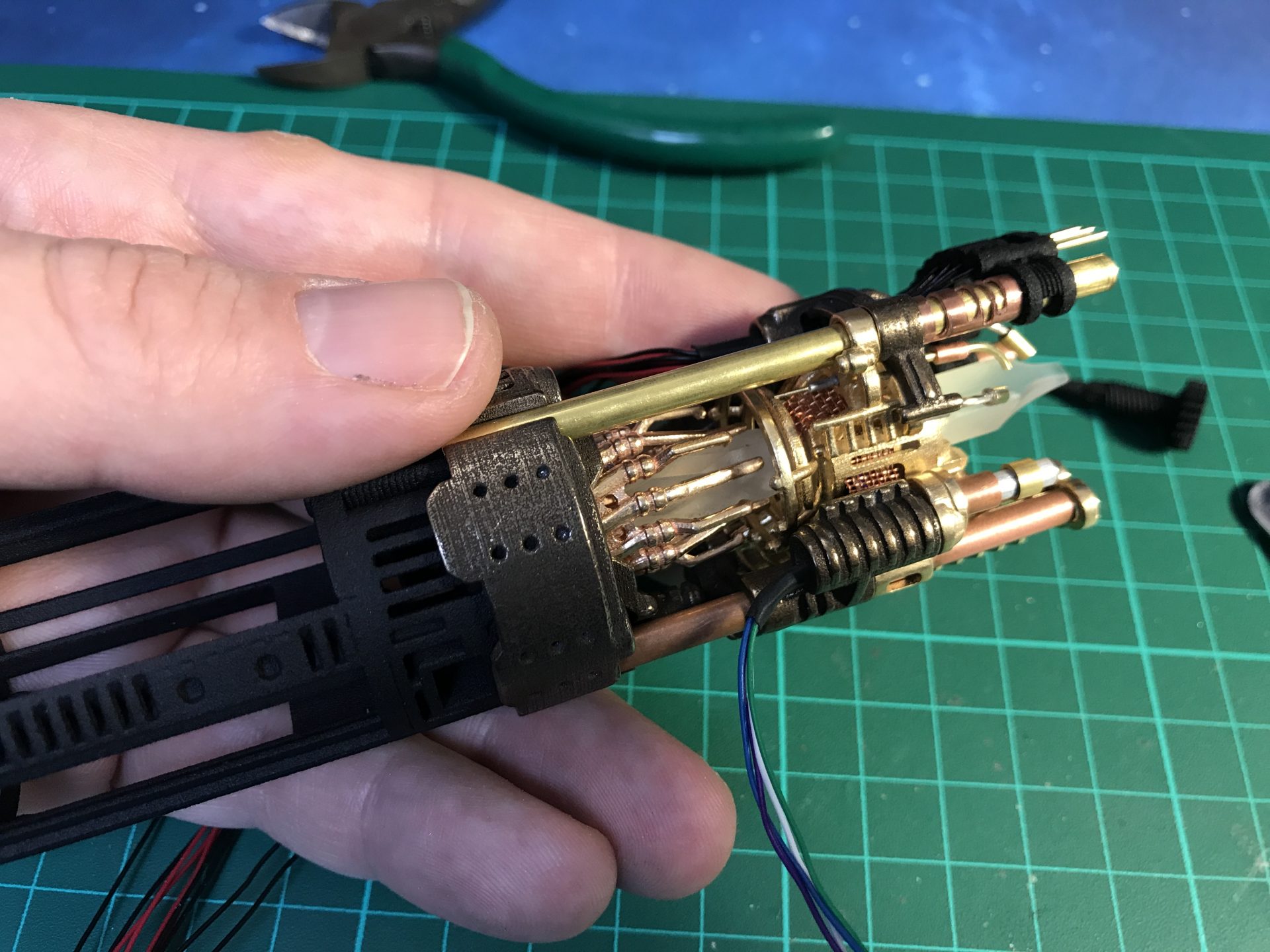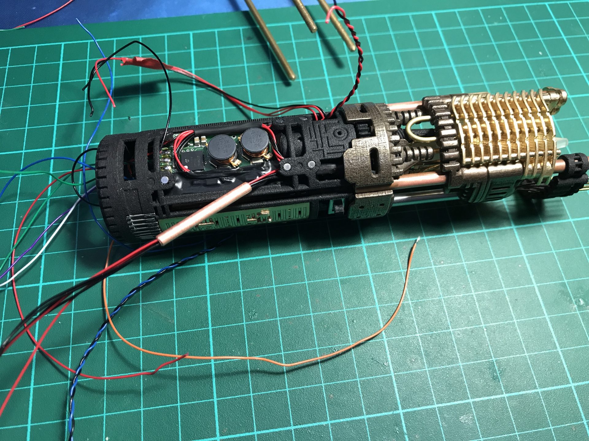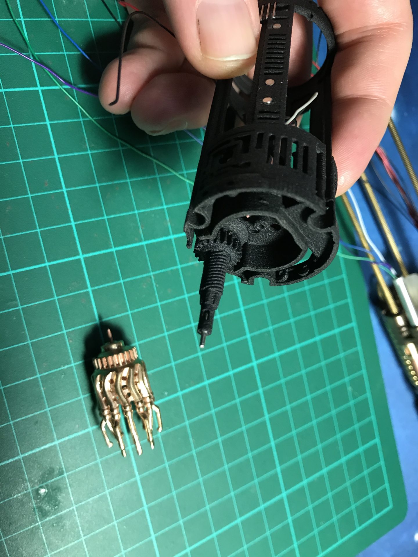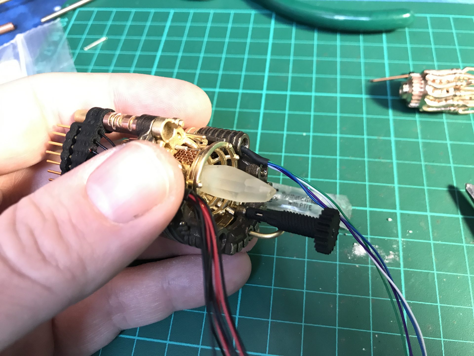 /!\ Important: This part is tricky, first take your time to make the wires fit in properly, making sure no wires are in the way when closing the assembly. You also have to make sure the gear and cycling part rods insert properly into the crystal and Part06 in front, so that both are properly supported and aligned.