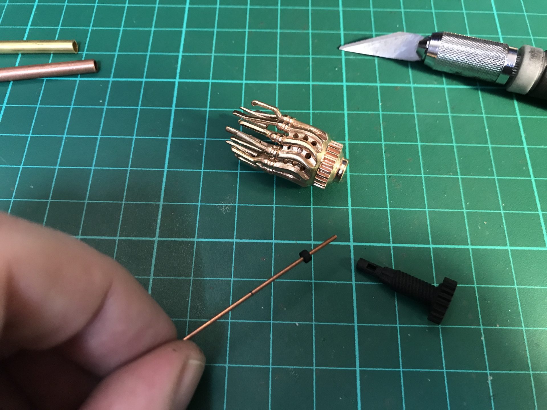 Step 23: Prepare and test the cycling devise chamber assembly. The gear plastic element contained in Part01 has a little plastic stopper part to be cut away and to be added on the other Rod 1mmOD. This little plastic stopper part prevents the cycling devise from sliding once installed. So you have to test the placement first to measure where the rod and stopper will be positioned in the chassis.