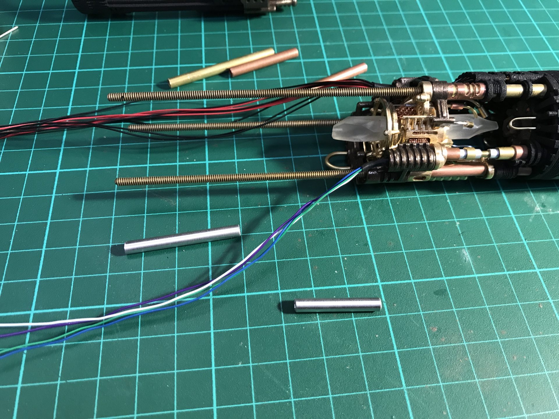 Step 14: Cut the tubes to the length described in the section 2 (additional chassis parts). We strongly suggest to cut the tube with a slightly longer length, and then use of a caliper and hand file to reduce to the desired length. You can choose to Use brass, copper or aluminium as you prefer. You then have to secure them on the chassis parts with a bit of super glue using a spare 4-40 threaded rod as guide.