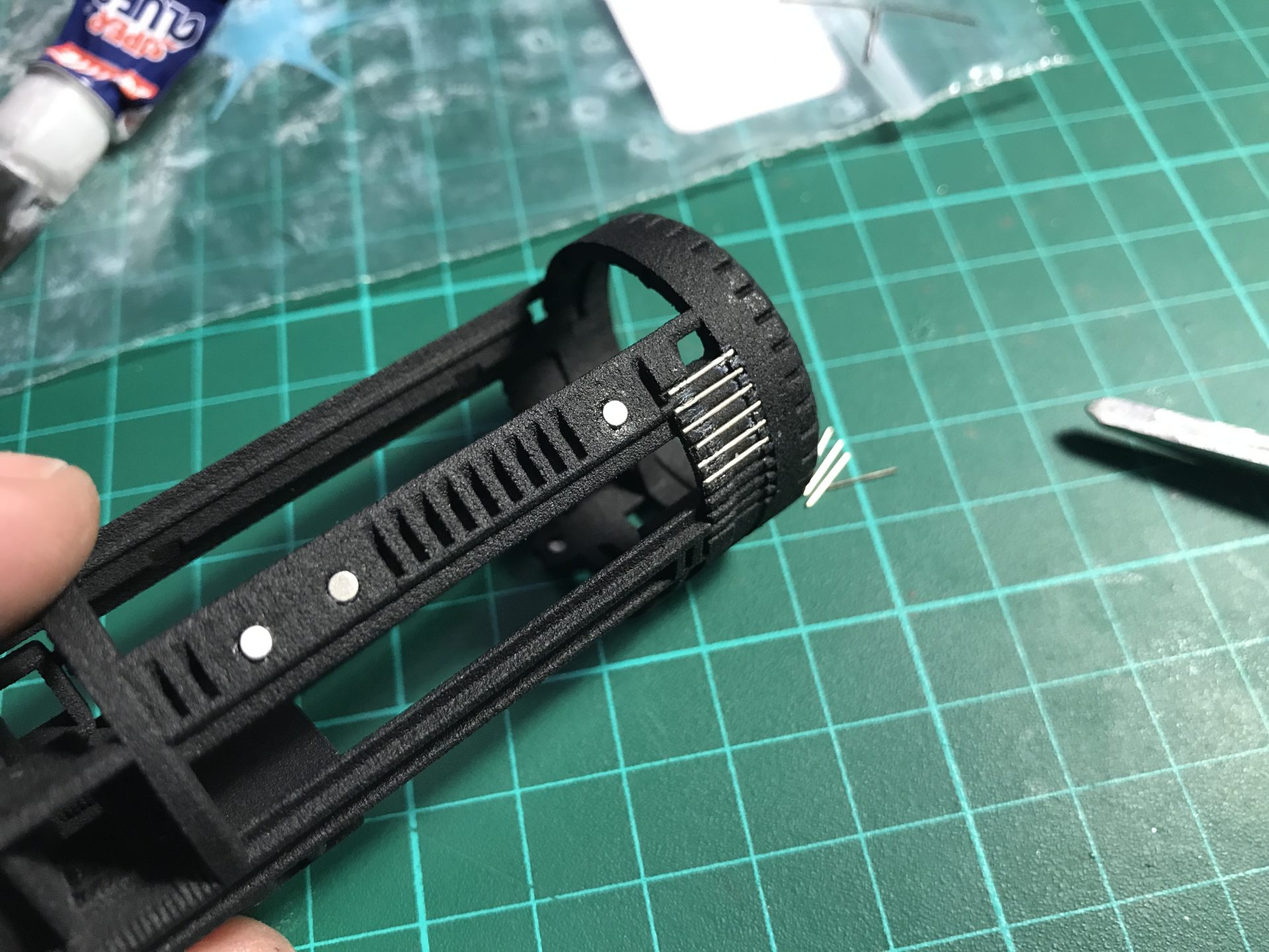 /!\ important: make sure to respect the magnet polarity before gluing them!