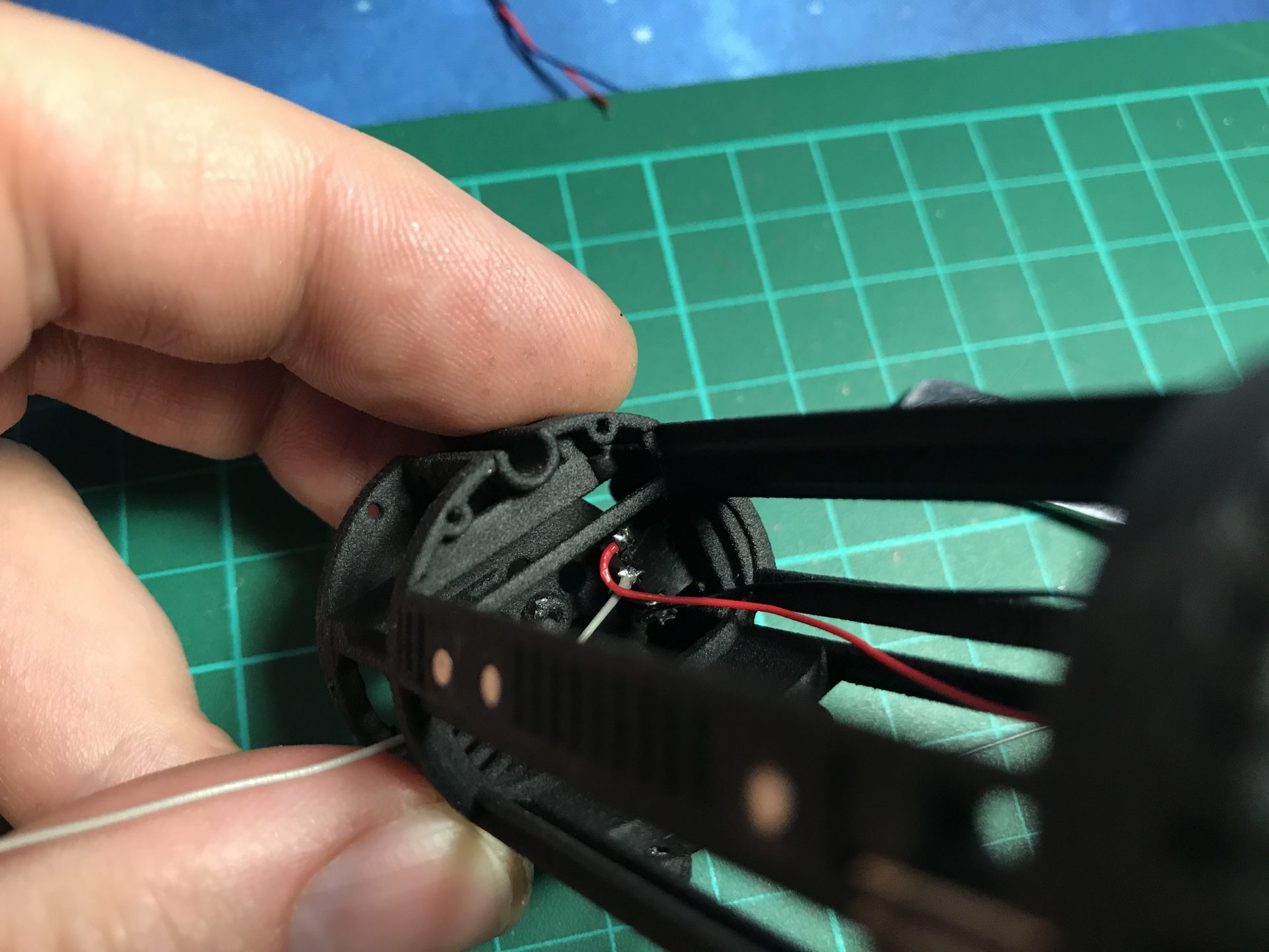 Step 8: Install the main led. 6 wires are soldered for the CF9, then use double tape thermal pad to secure the led into the blade holder. There is no need for a long length of wire here, but give a bit of margin to ease the install later.