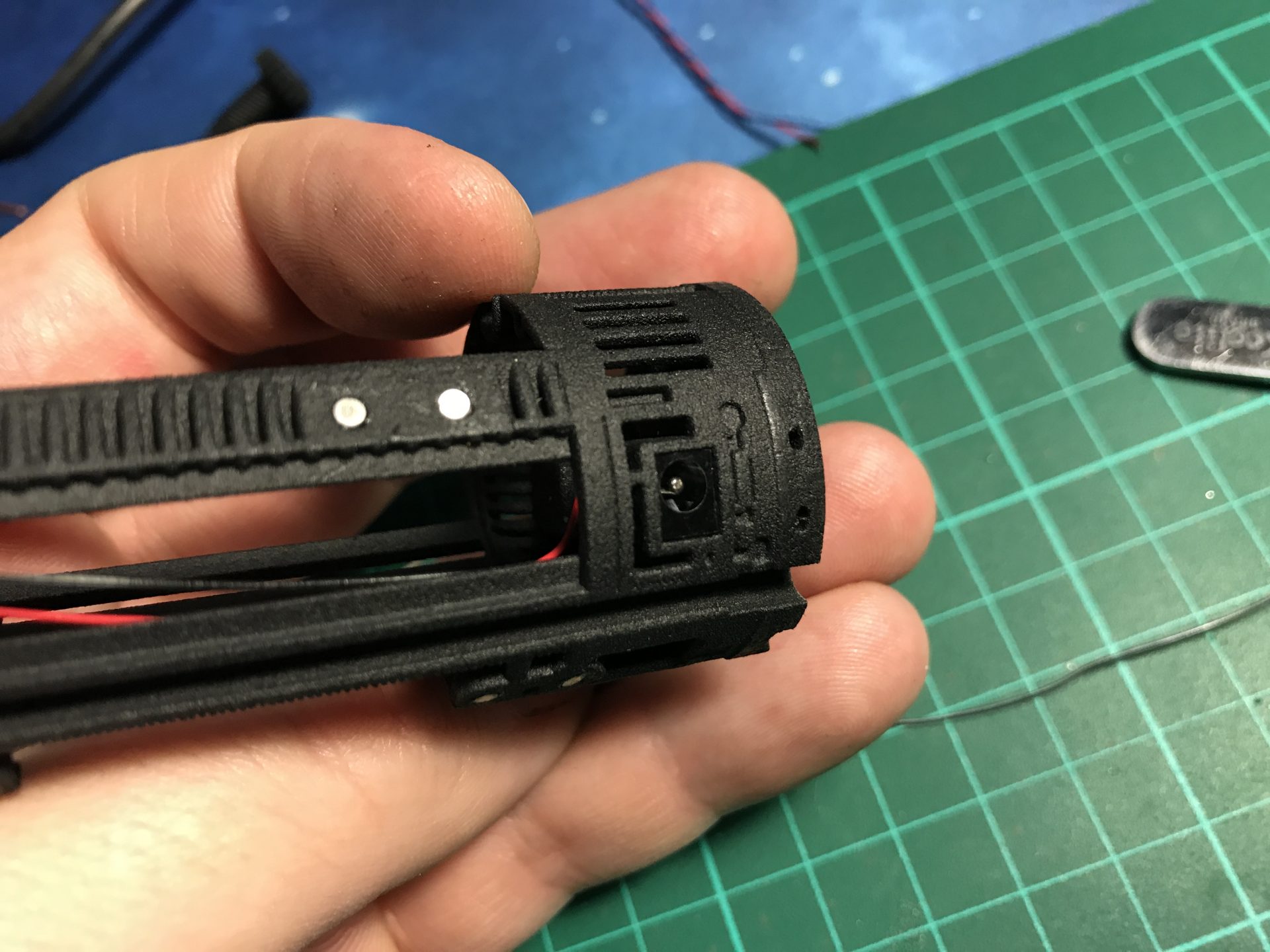 /!\ Important: It is very important at that point to check the connectivity of each of your 10 pins (Switches, Main Led and Accent Led). It is also very important to make sure both upper and bottom parts of the chassis magnets bind properly. If there is any gaps, adjust your tubes accordingly or the male connector placement accordingly. For example, if your male connector sits too high, it will create a gap between the magnets, reduce the length of the support Tube 8) to insert the connector a bit lower.