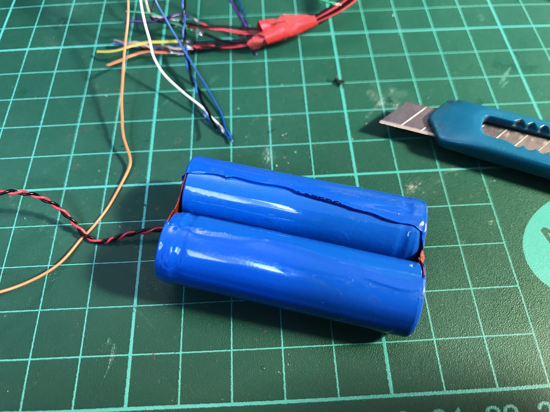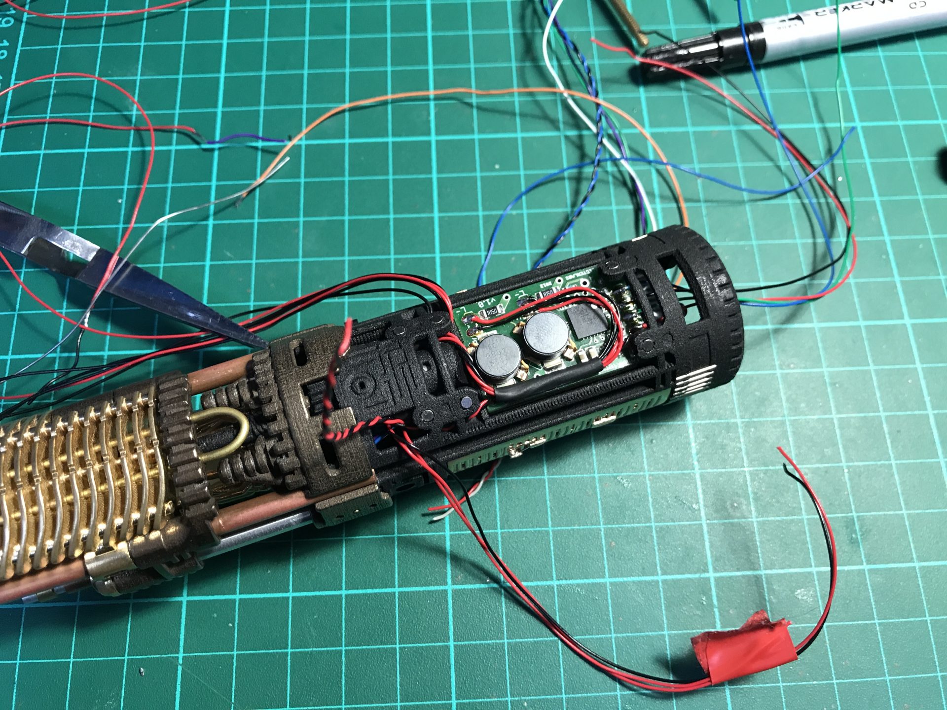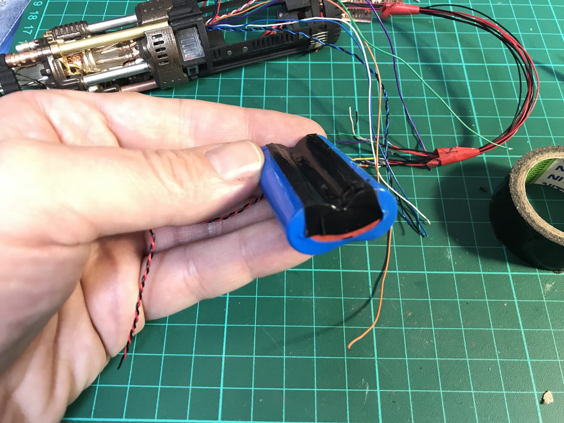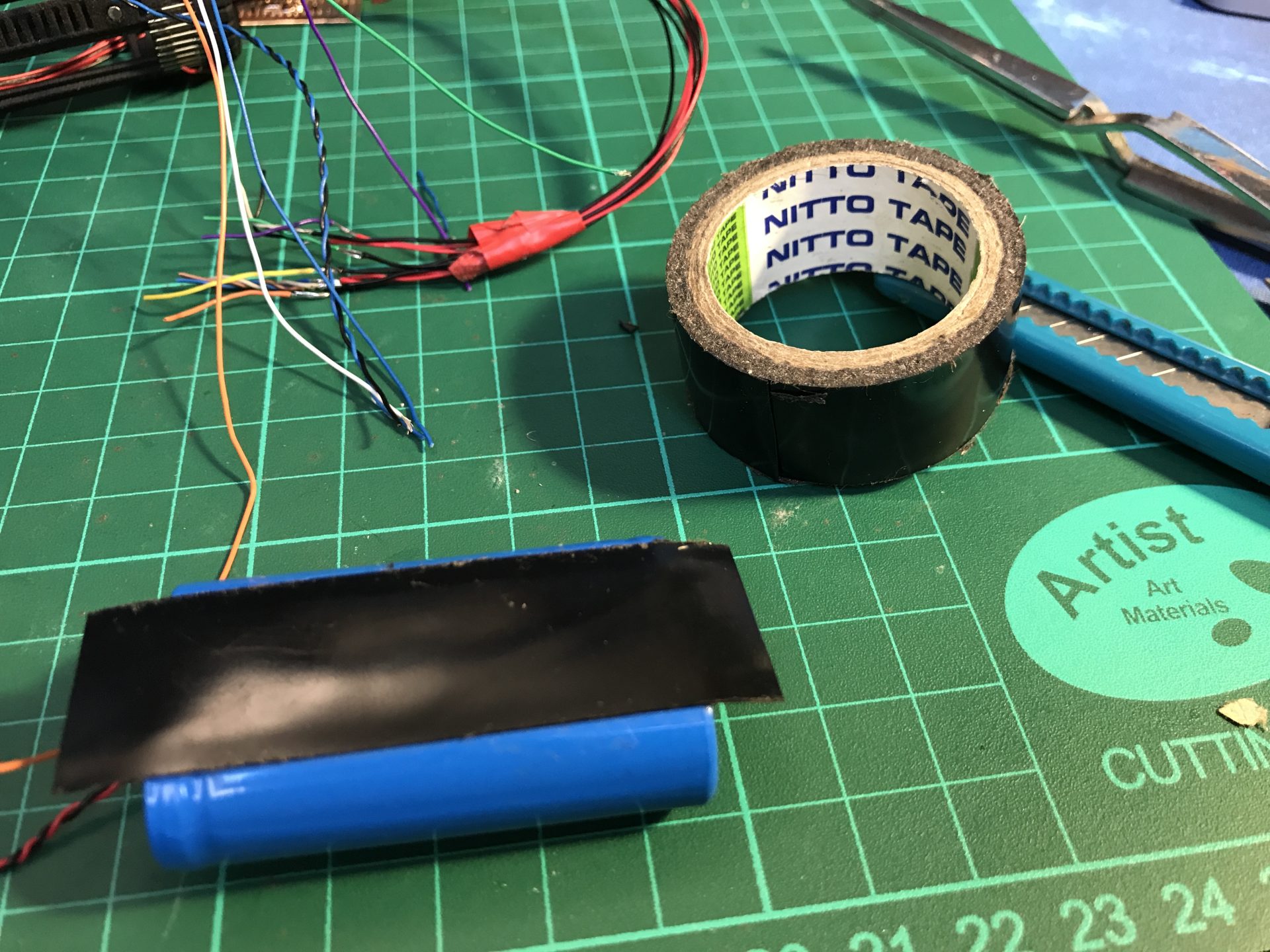 Step37: All empty space counts, as there are many wires. To add the necessary channel space, we open the battery pack heatshrink wrap, which liberates a wires channel and protect it again with Nitto tape that shrinks and takes the form of the battery.