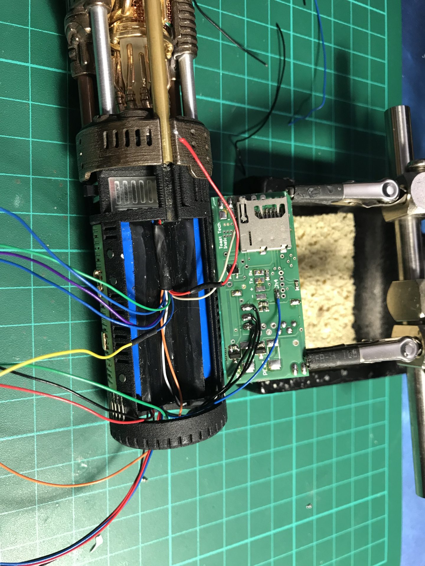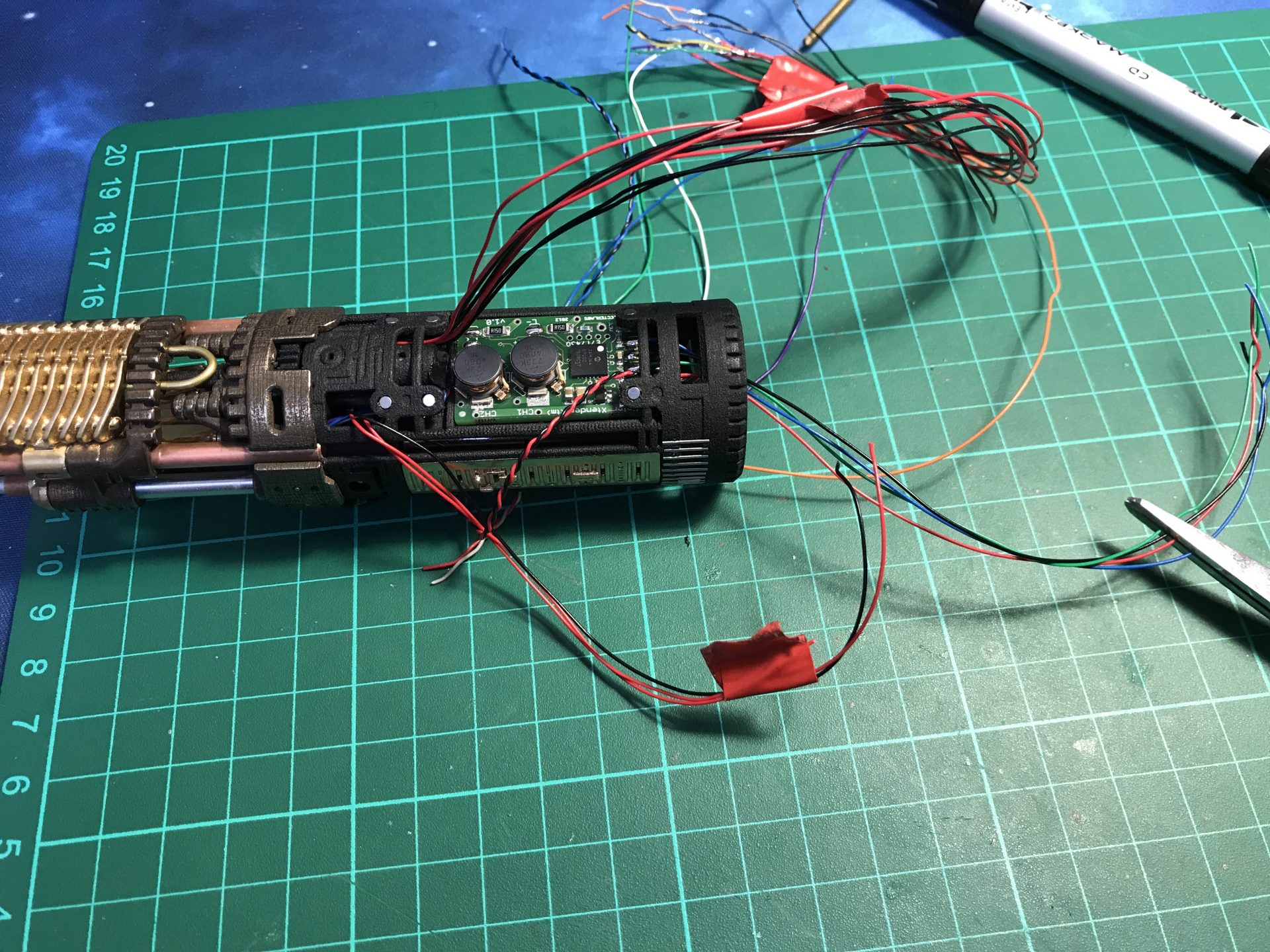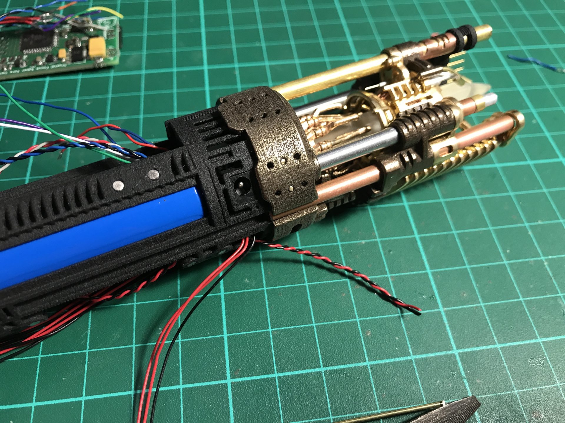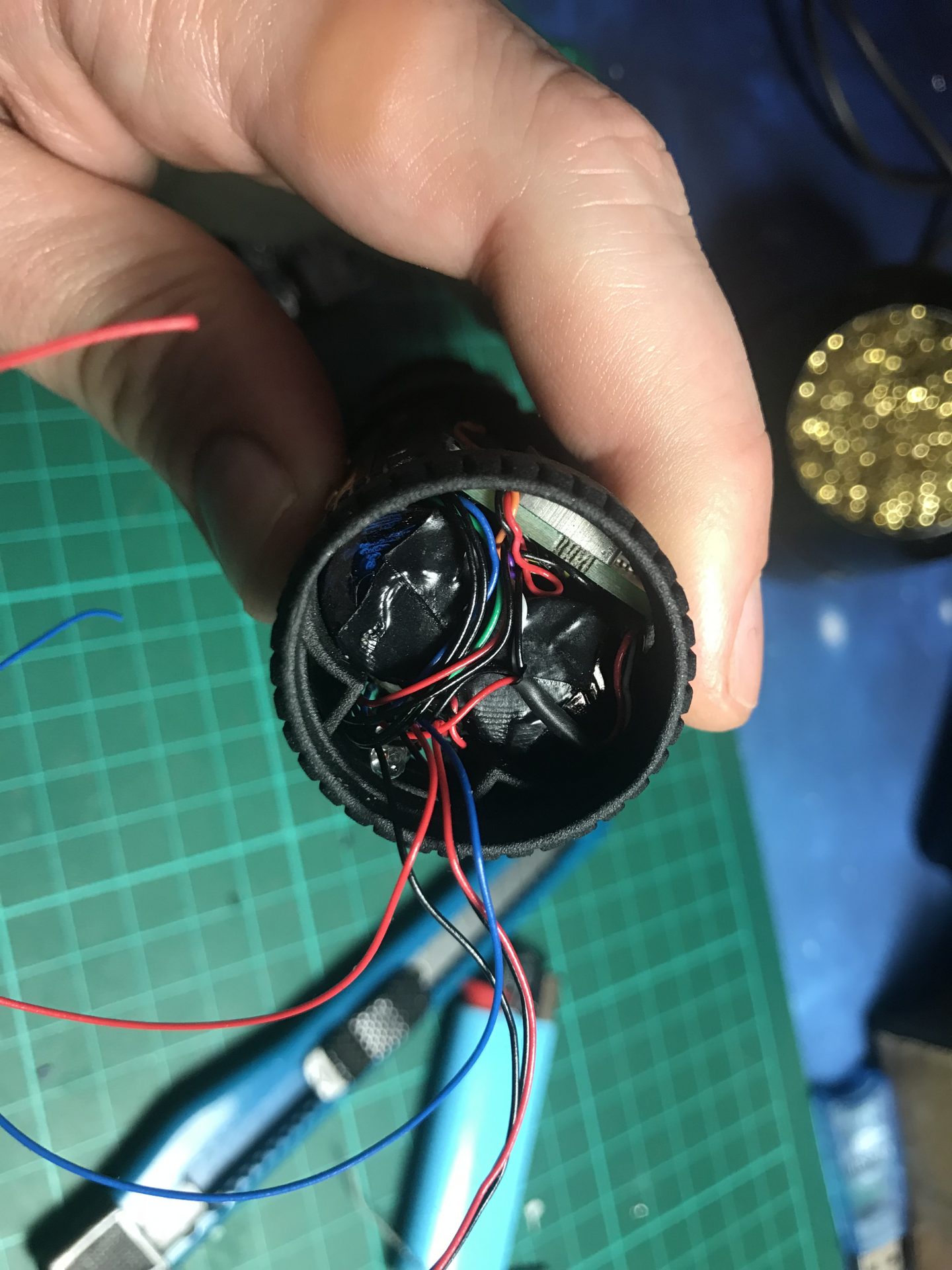 Step37: All empty space counts, as there are many wires. To add the necessary channel space, we open the battery pack heatshrink wrap, which liberates a wires channel and protect it again with Nitto tape that shrinks and takes the form of the battery.