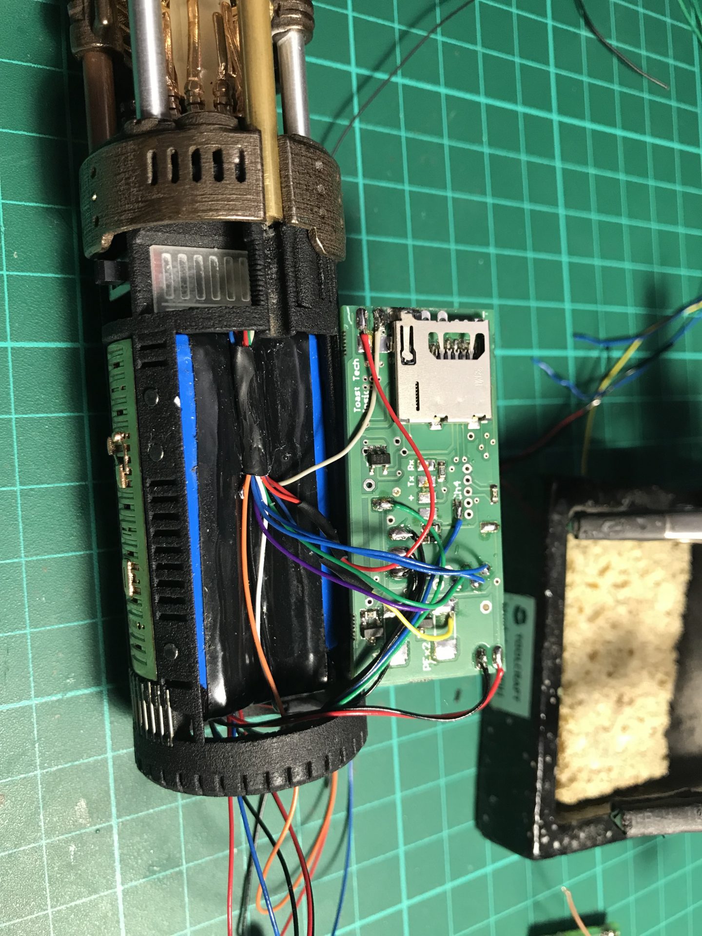 Step 32: Install the switch. Cut one leg and sand the switch down (that space is needed for an accent led later). Wire the switch with the soundboard negative wire coming out of the recharge port, then insert it.