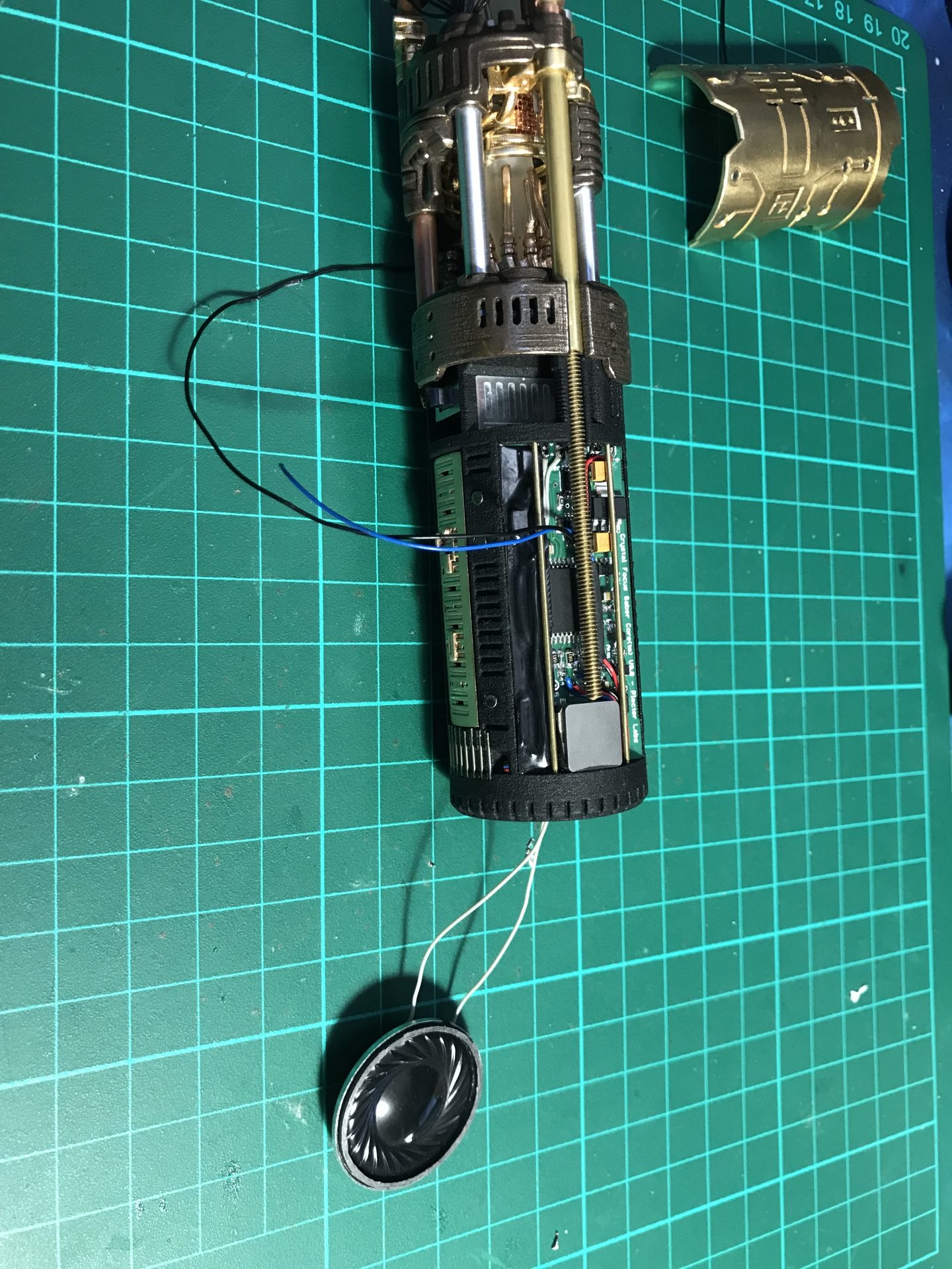Step 43: Install the flat 28mm speaker. Then solder the last accent led to be glued aside of the 4-40 rod.