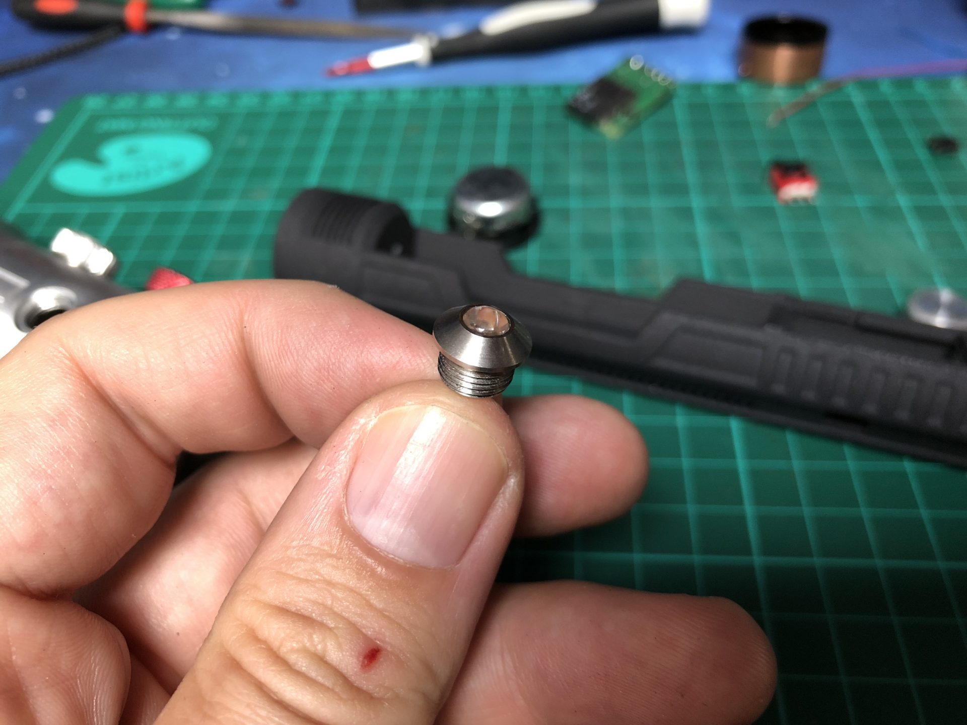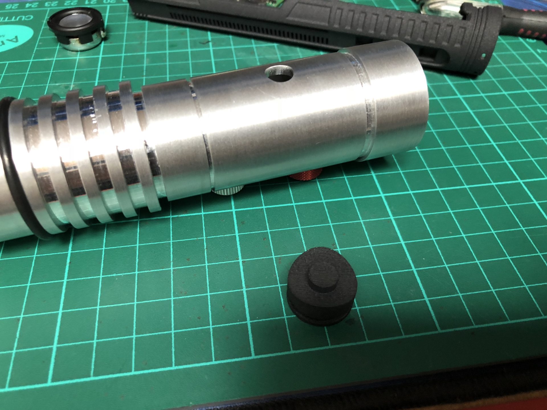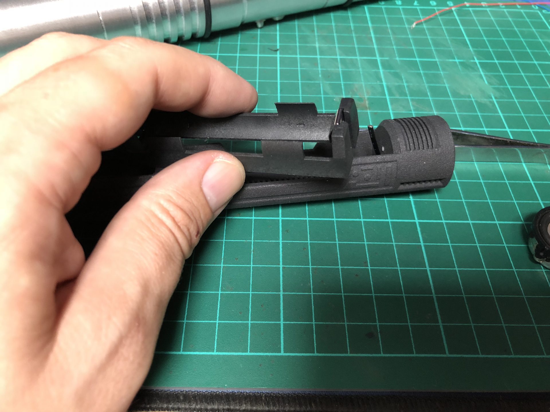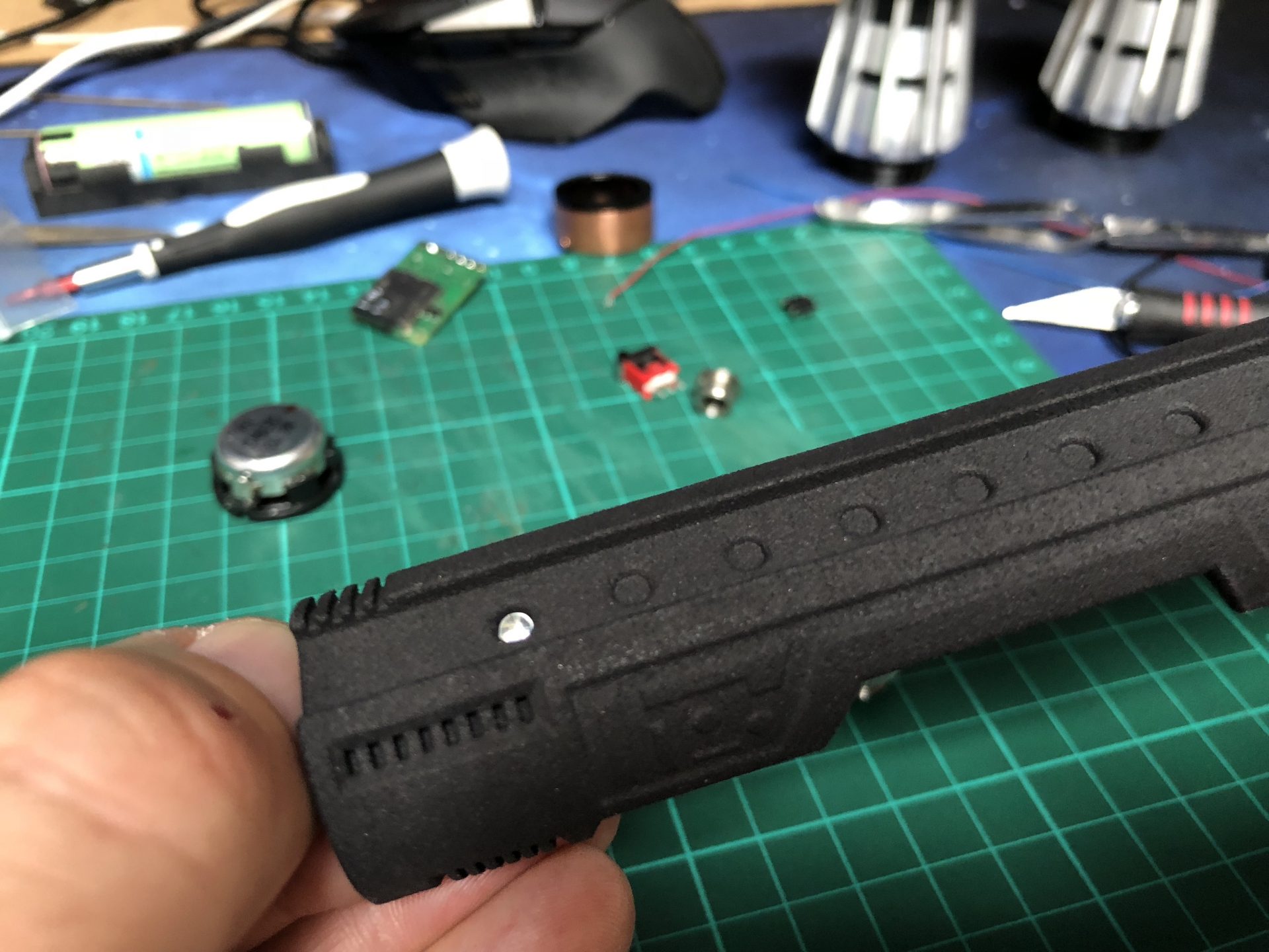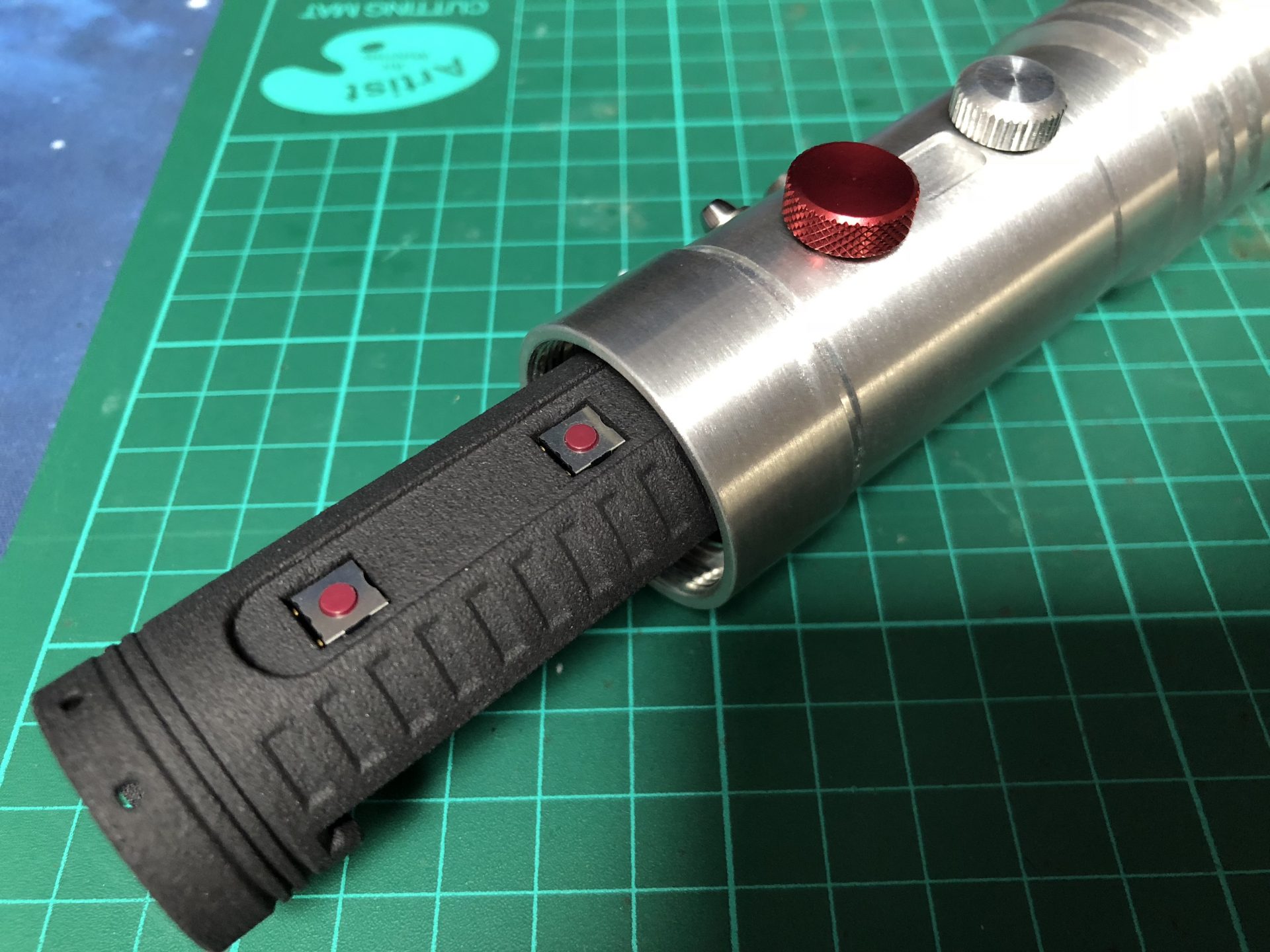 The top 2 thumb screw which operate the tactile switches under them cannot be screwed to the max on the hilt, otherwise they will not work. Test the switches before continuing the build, and eventually add a bit of super glue to secure the thumb screws.