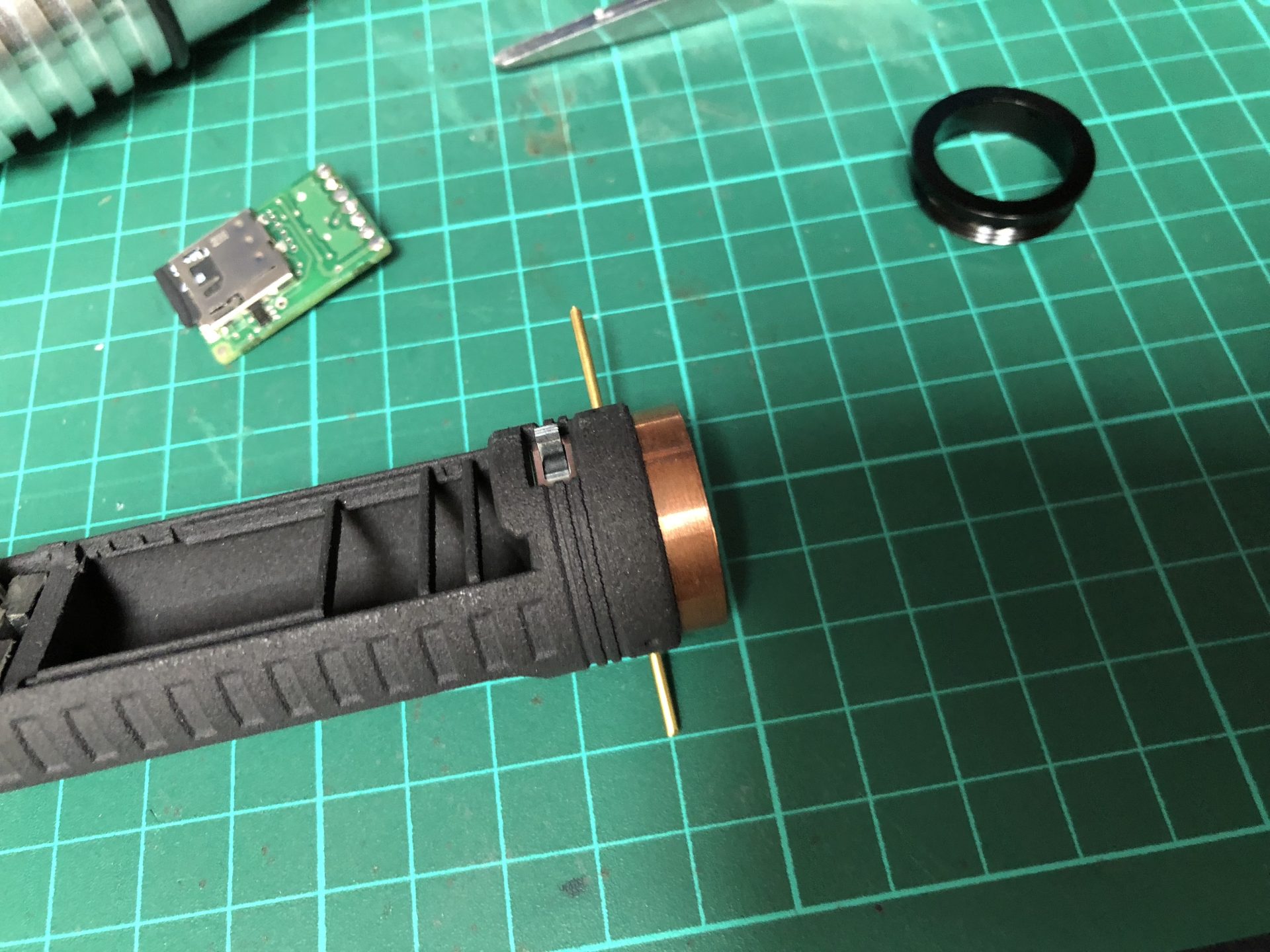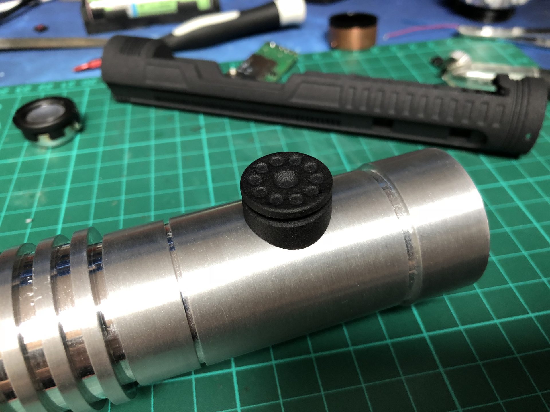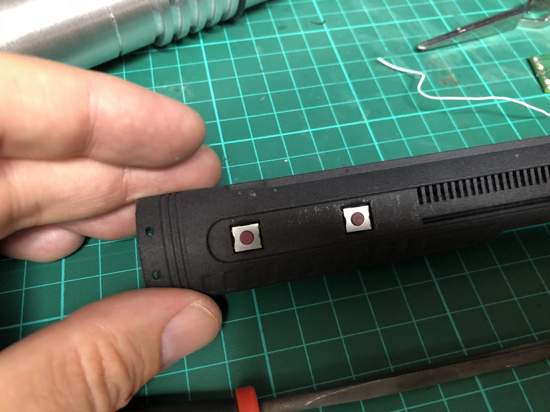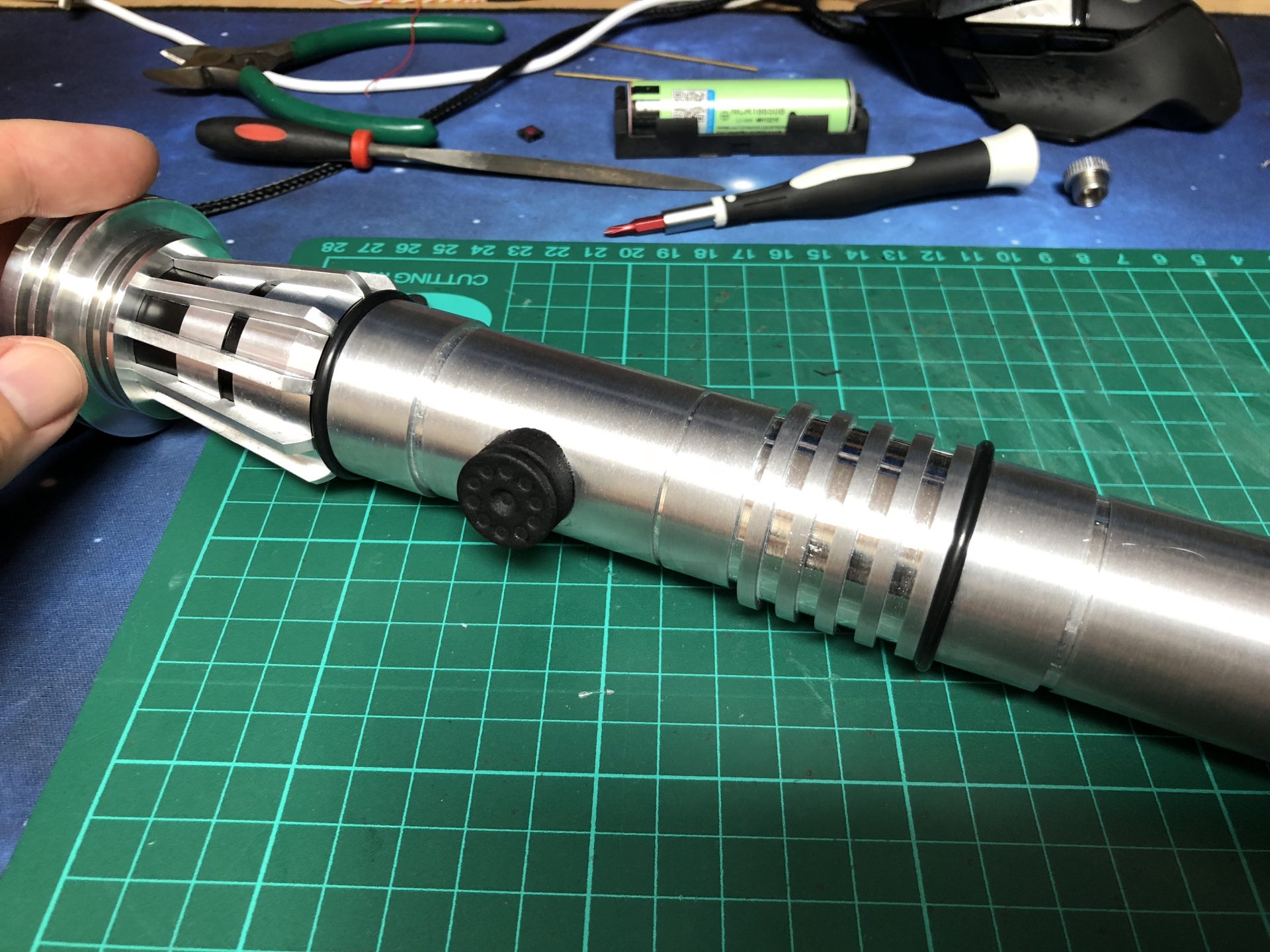 The top 2 thumb screw which operate the tactile switches under them cannot be screwed to the max on the hilt, otherwise they will not work. Test the switches before continuing the build, and eventually add a bit of super glue to secure the thumb screws.