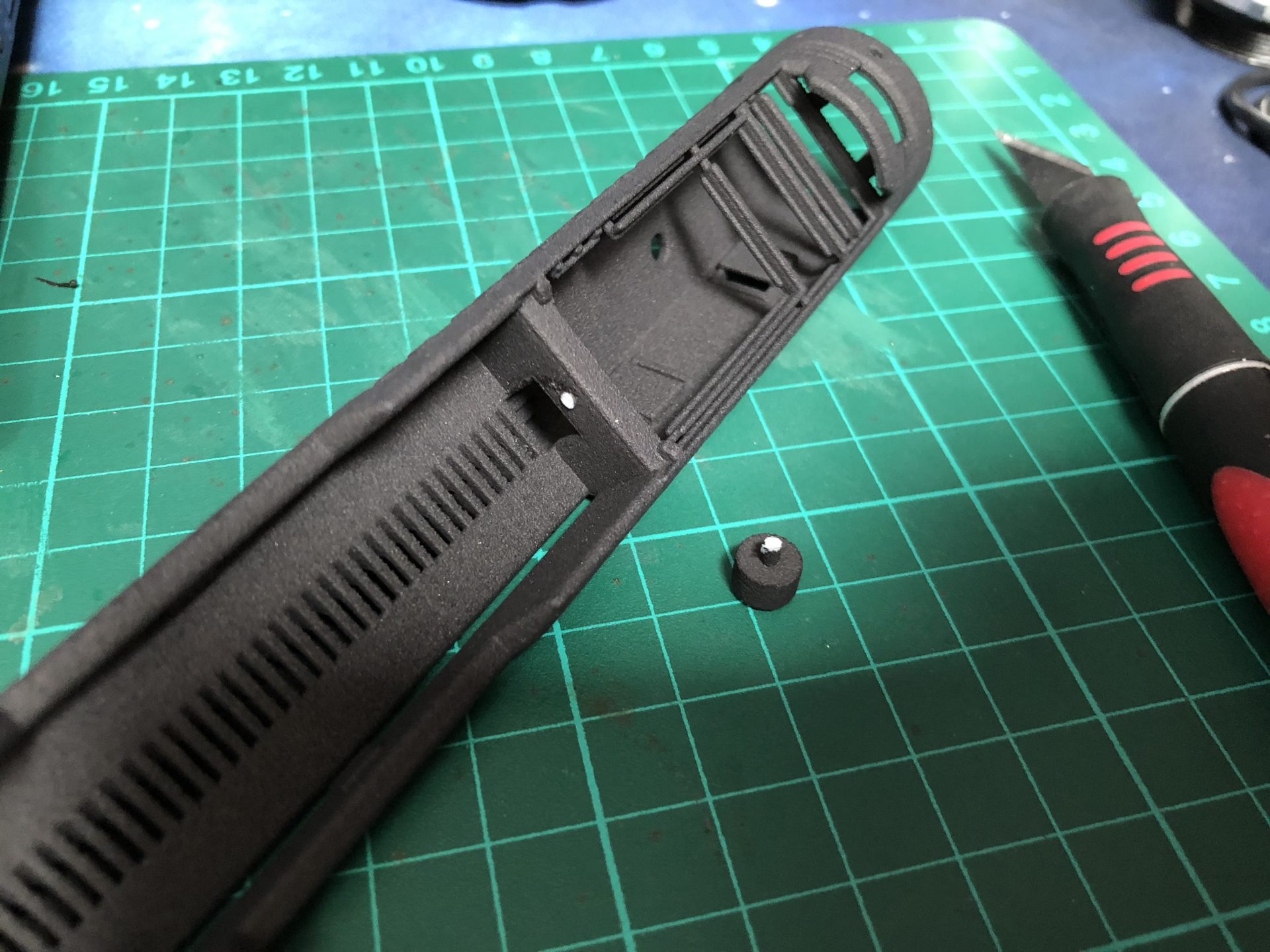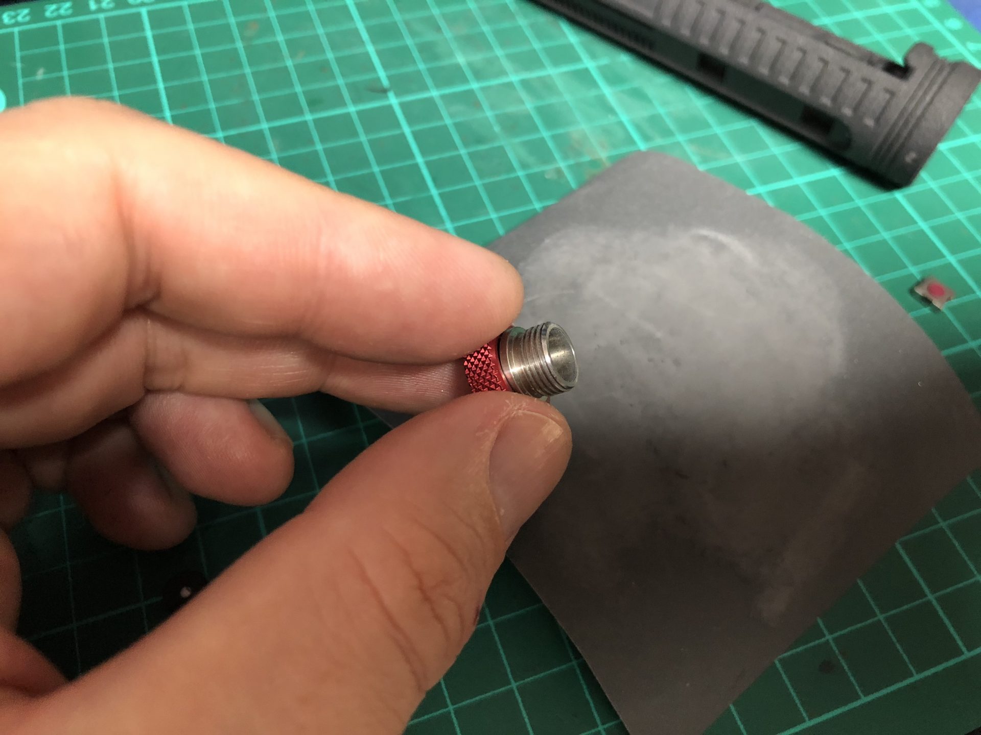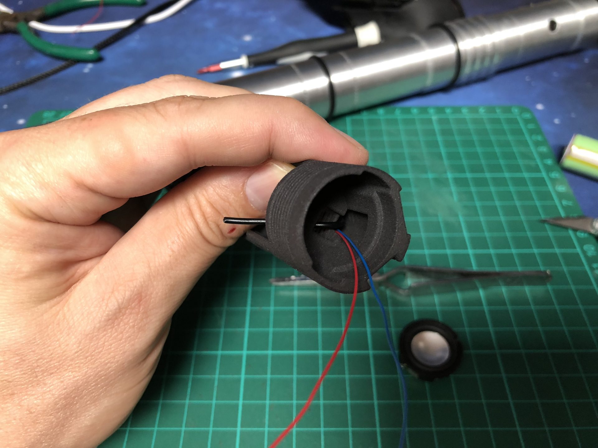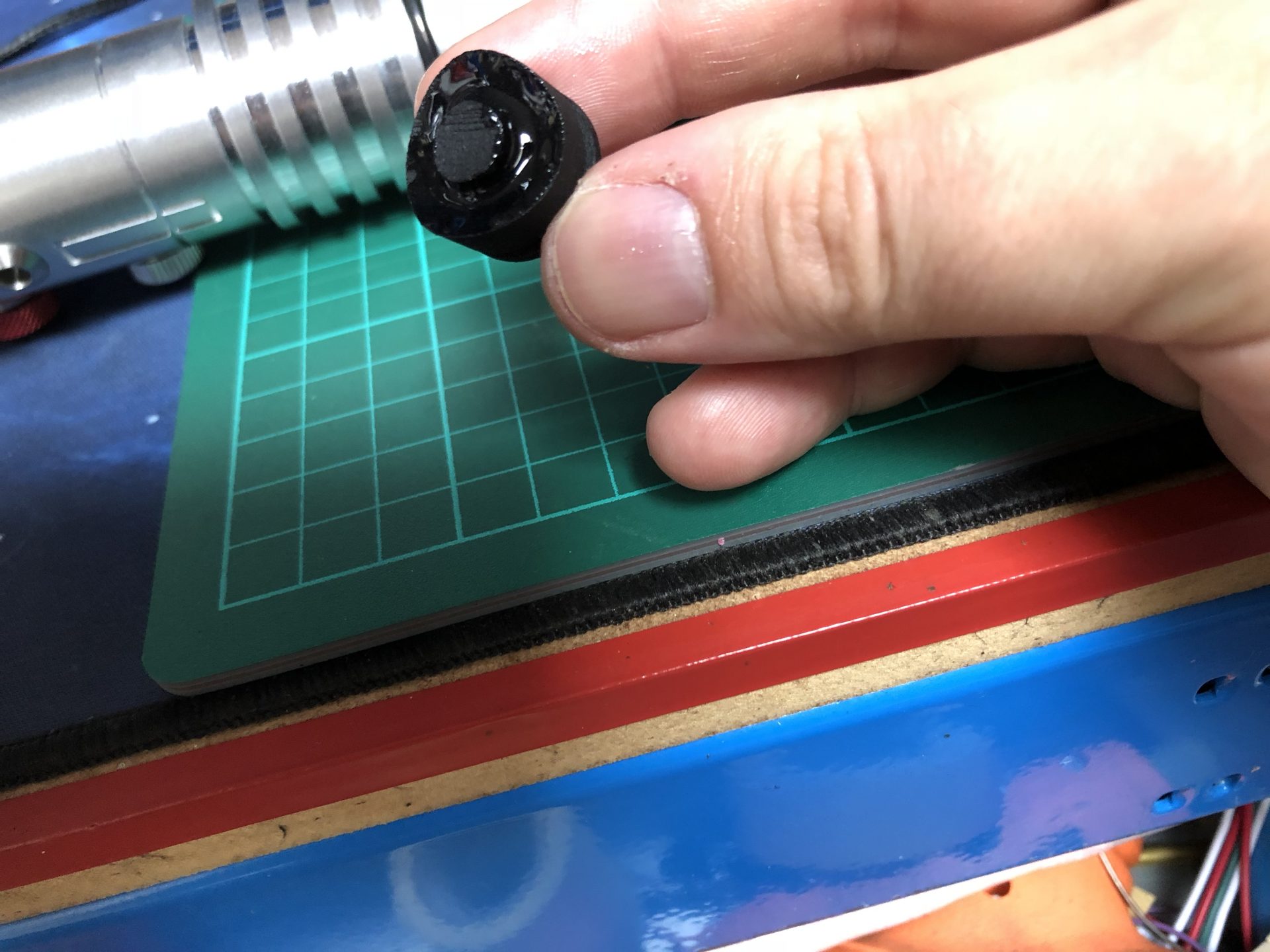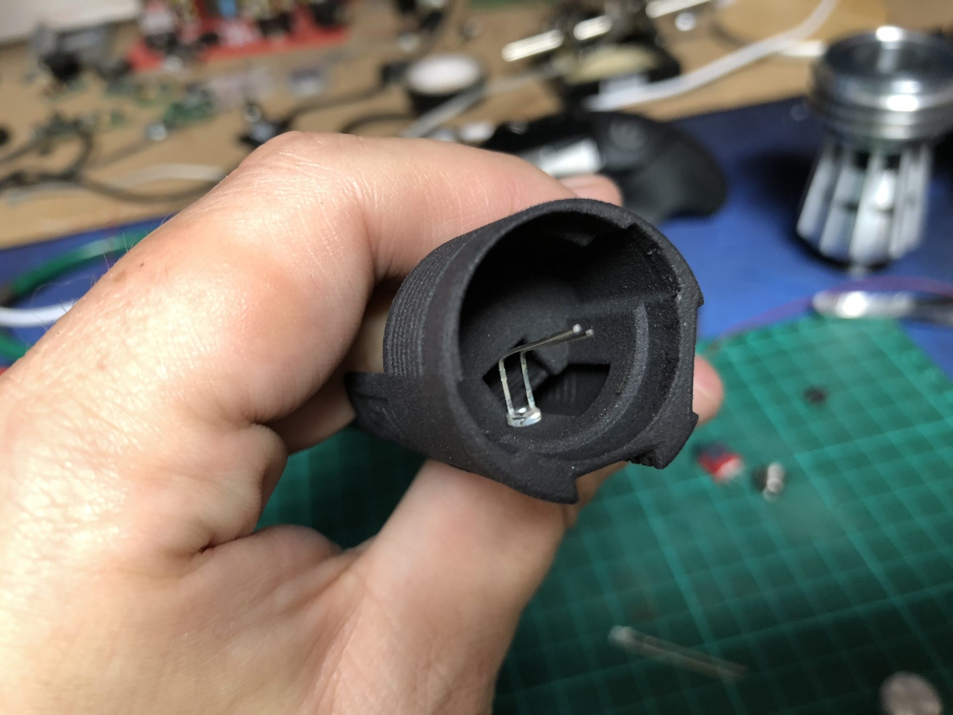 The top 2 thumb screw which operate the tactile switches under them cannot be screwed to the max on the hilt, otherwise they will not work. Test the switches before continuing the build, and eventually add a bit of super glue to secure the thumb screws.