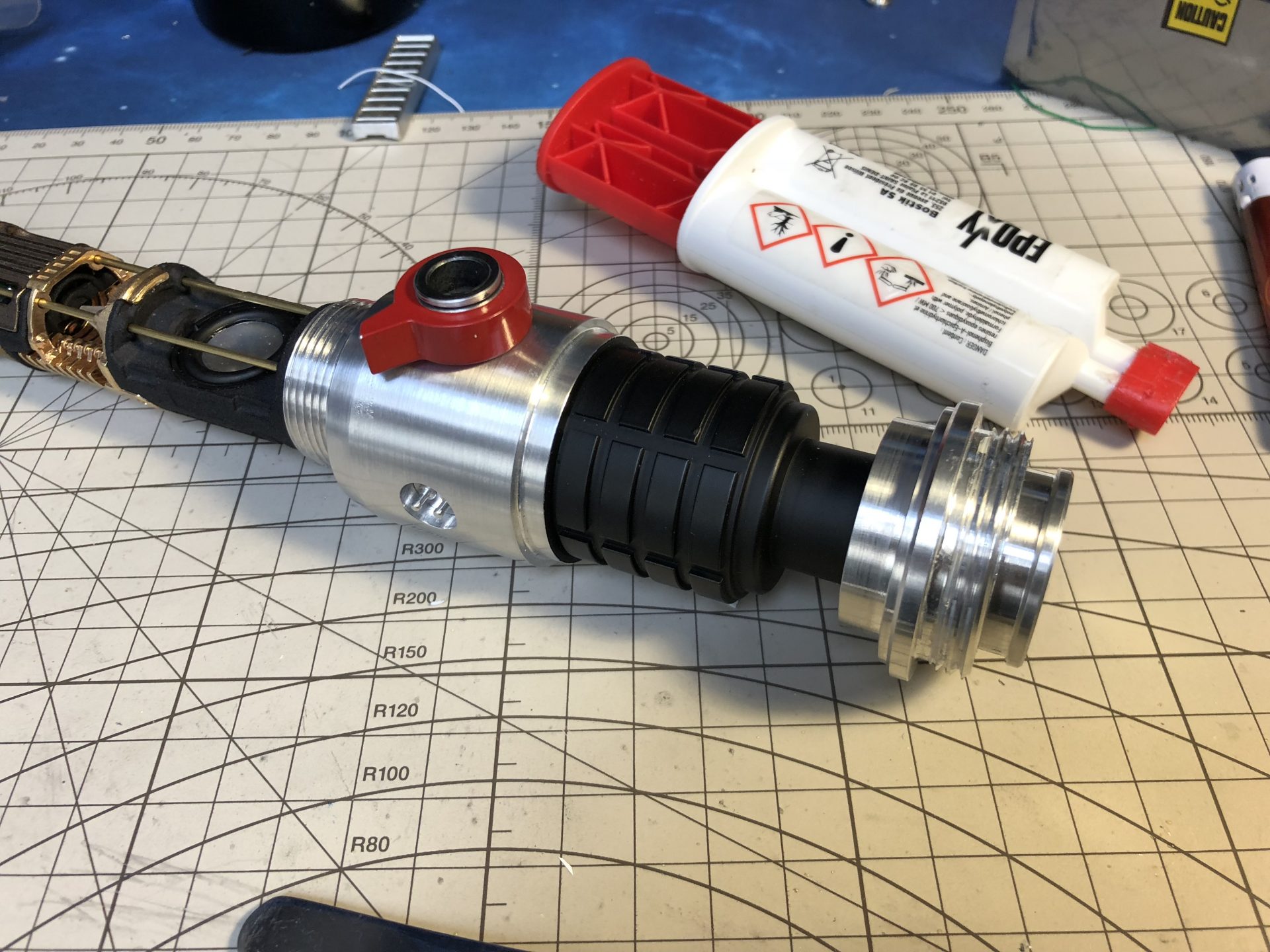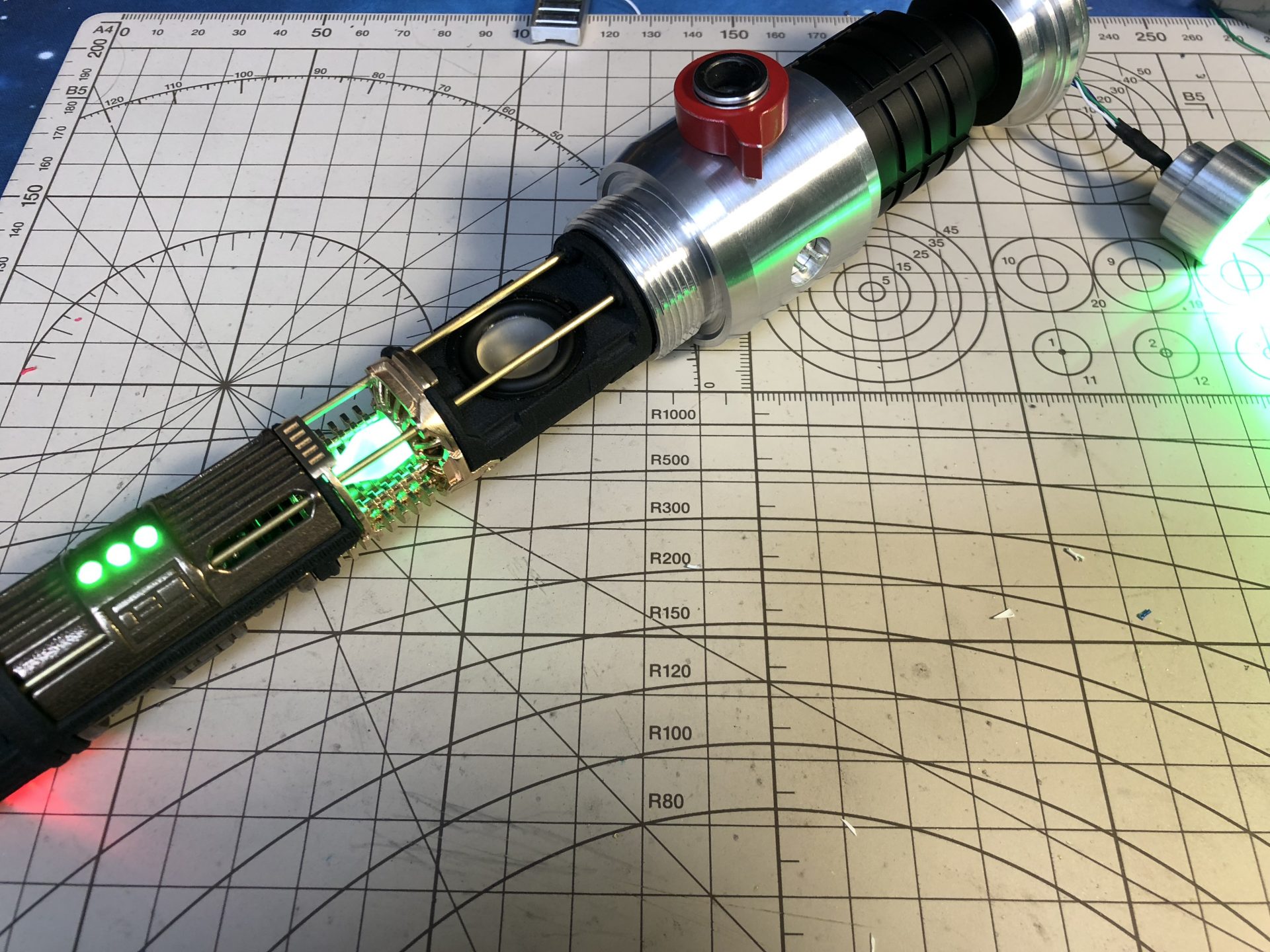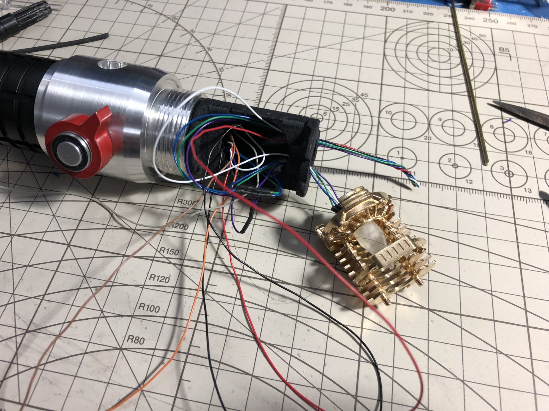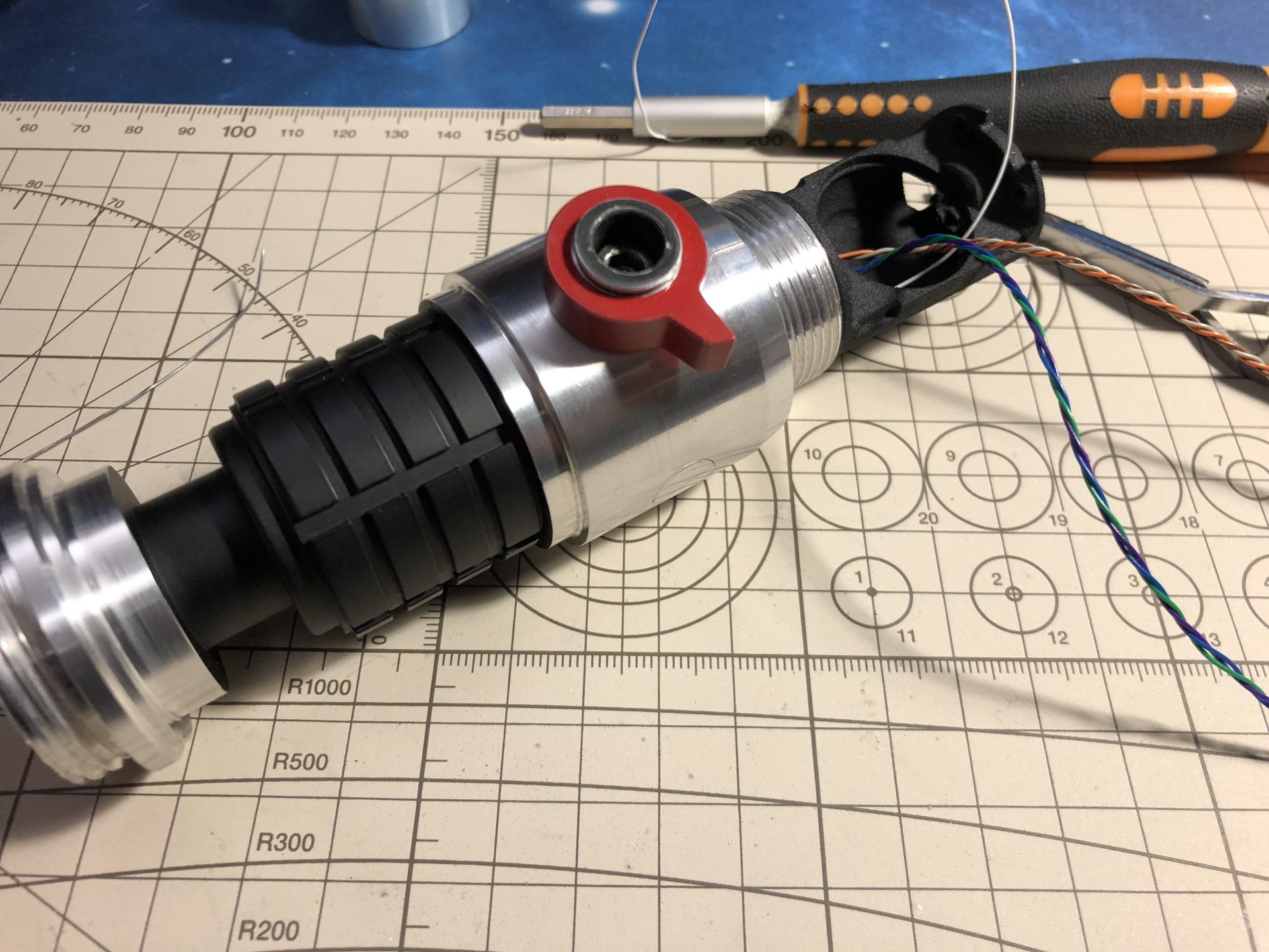 It is then mandatory to insert the chassis into the upper hilt part to test the switches work fine. The red lever screw is used to lock the chassis in.