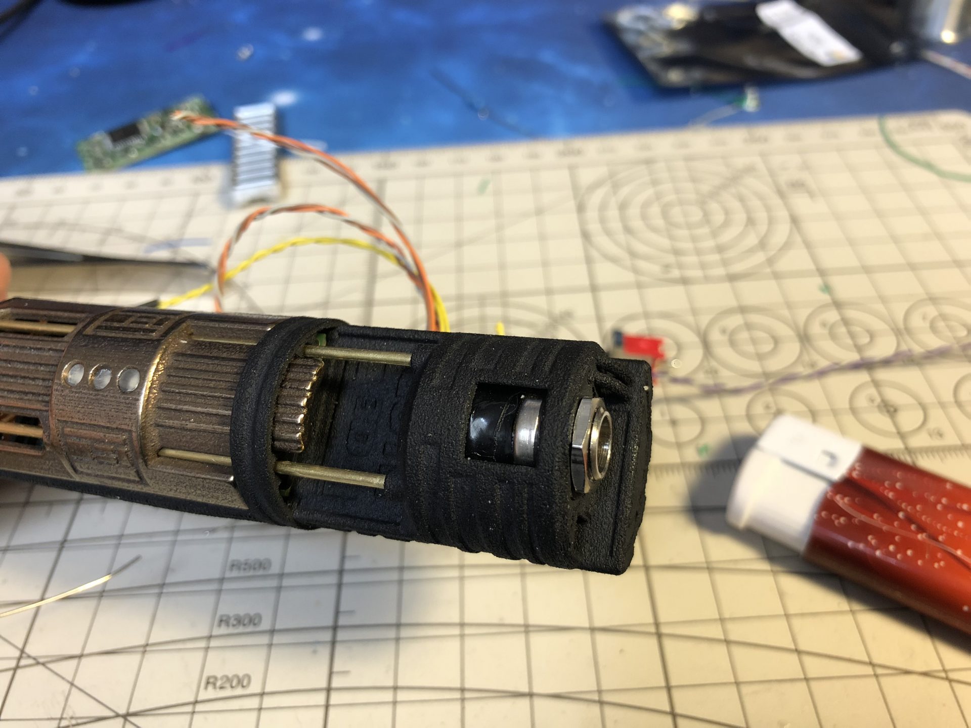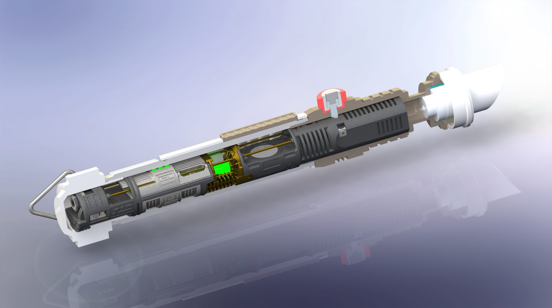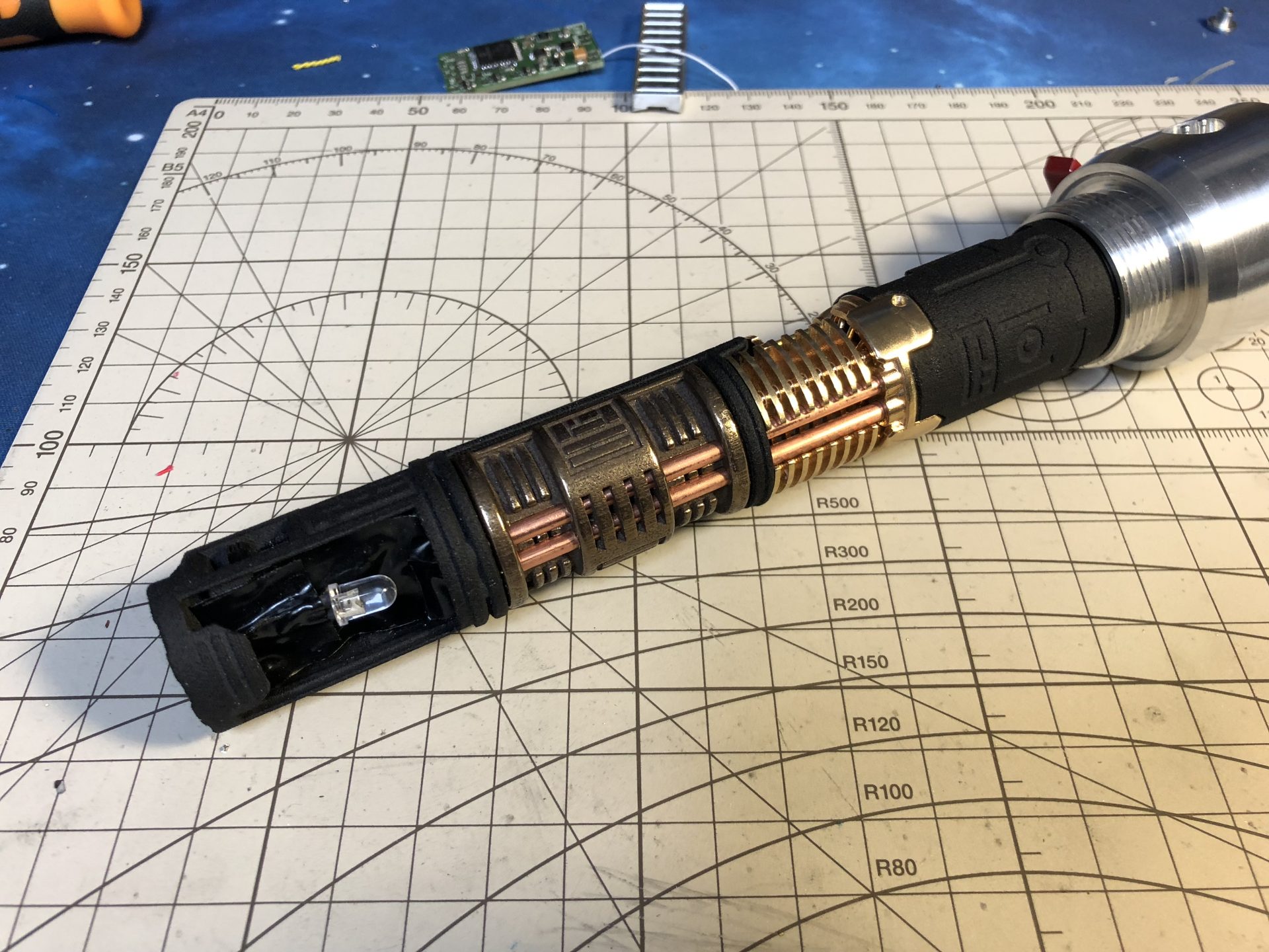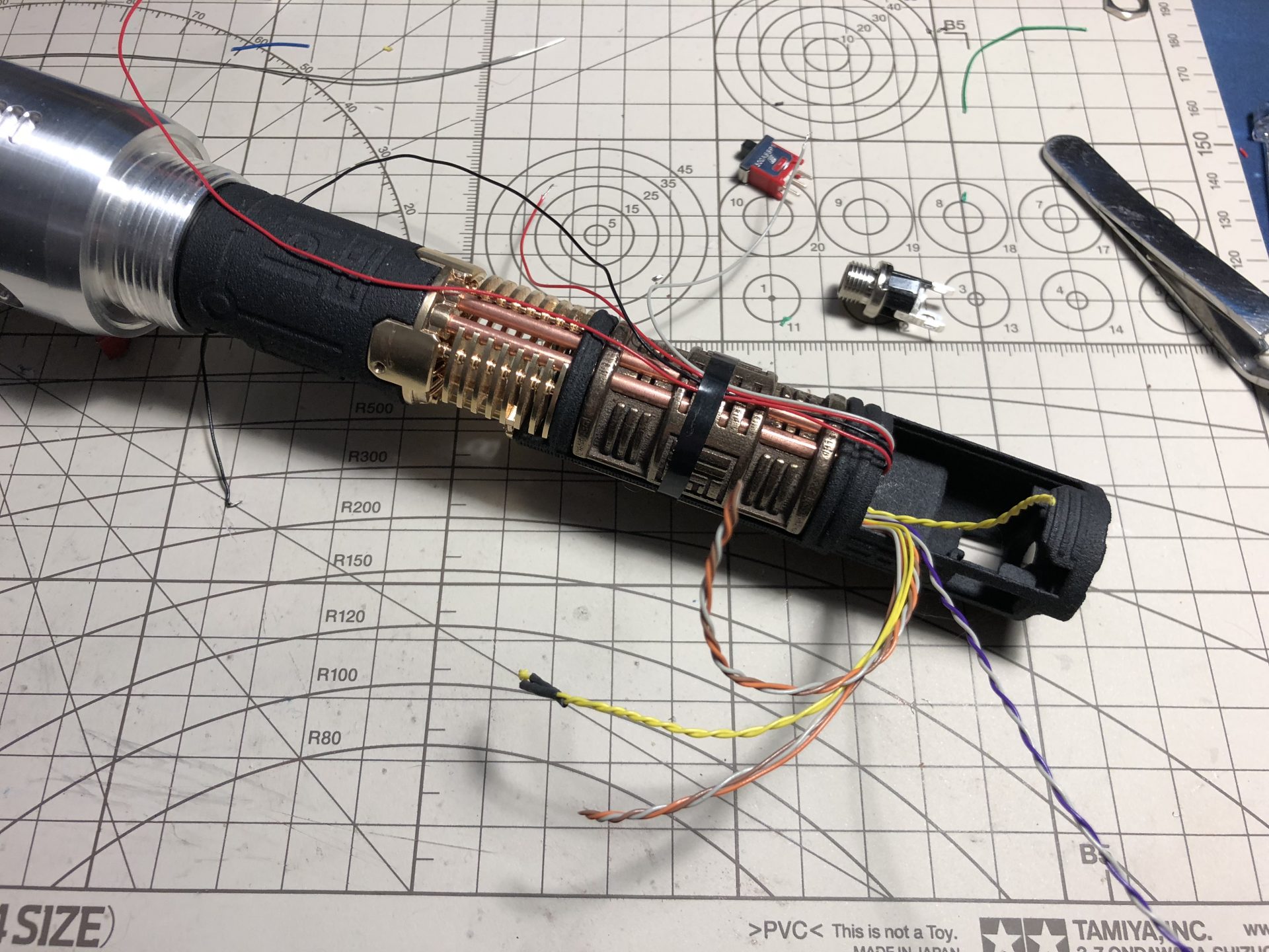 It is then mandatory to insert the chassis into the upper hilt part to test the switches work fine. The red lever screw is used to lock the chassis in.