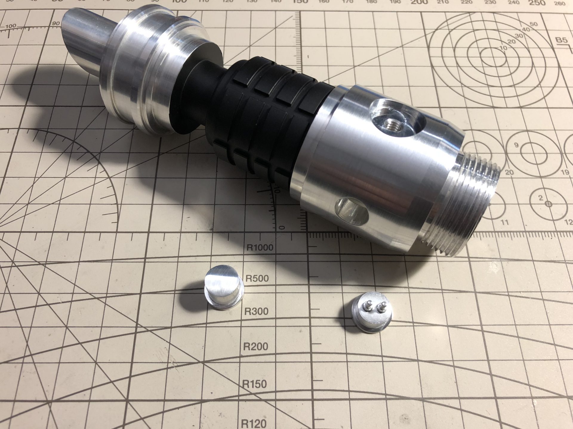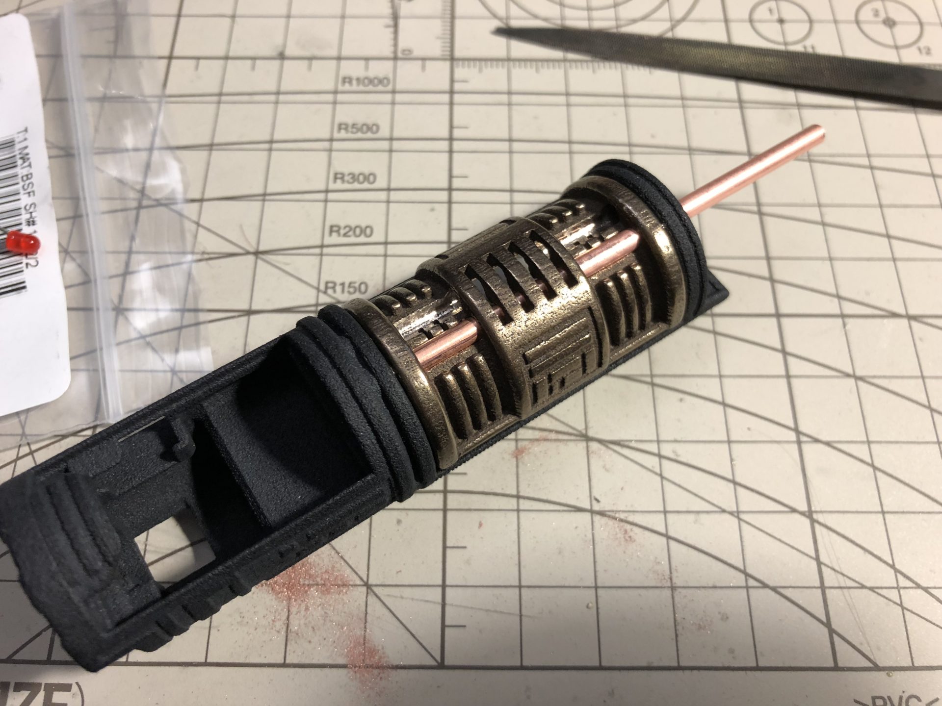 Glue the pins, and optionally polish the plain plunger, then add the plain on the left and the pins plunger on the right of the hilt emitter part as shown below (make sure they slide in easily).