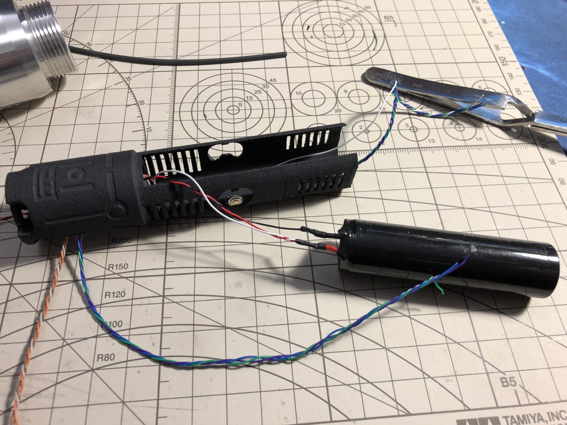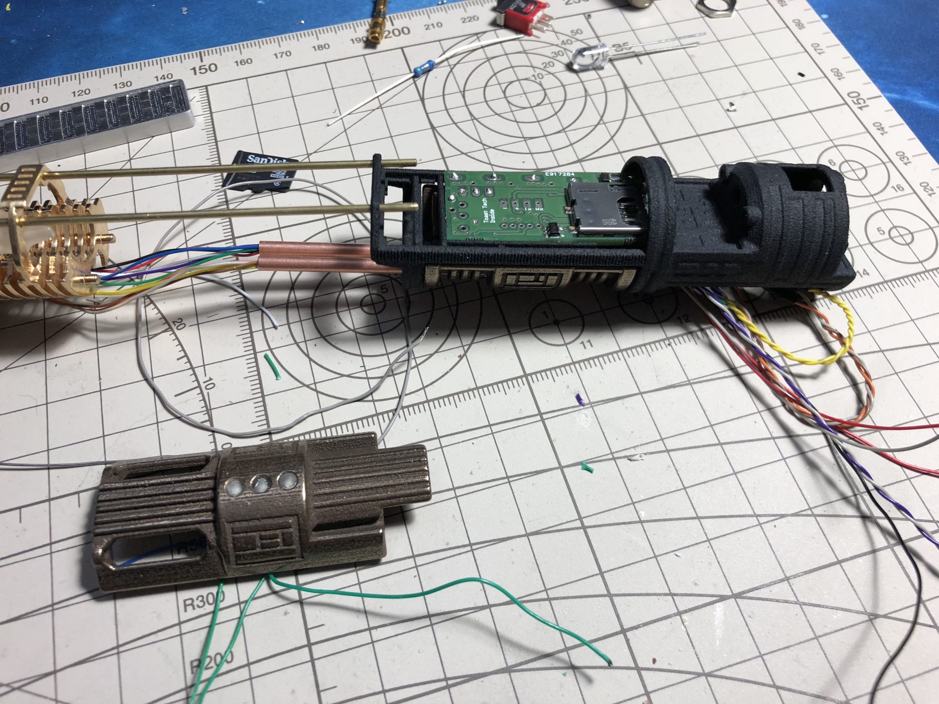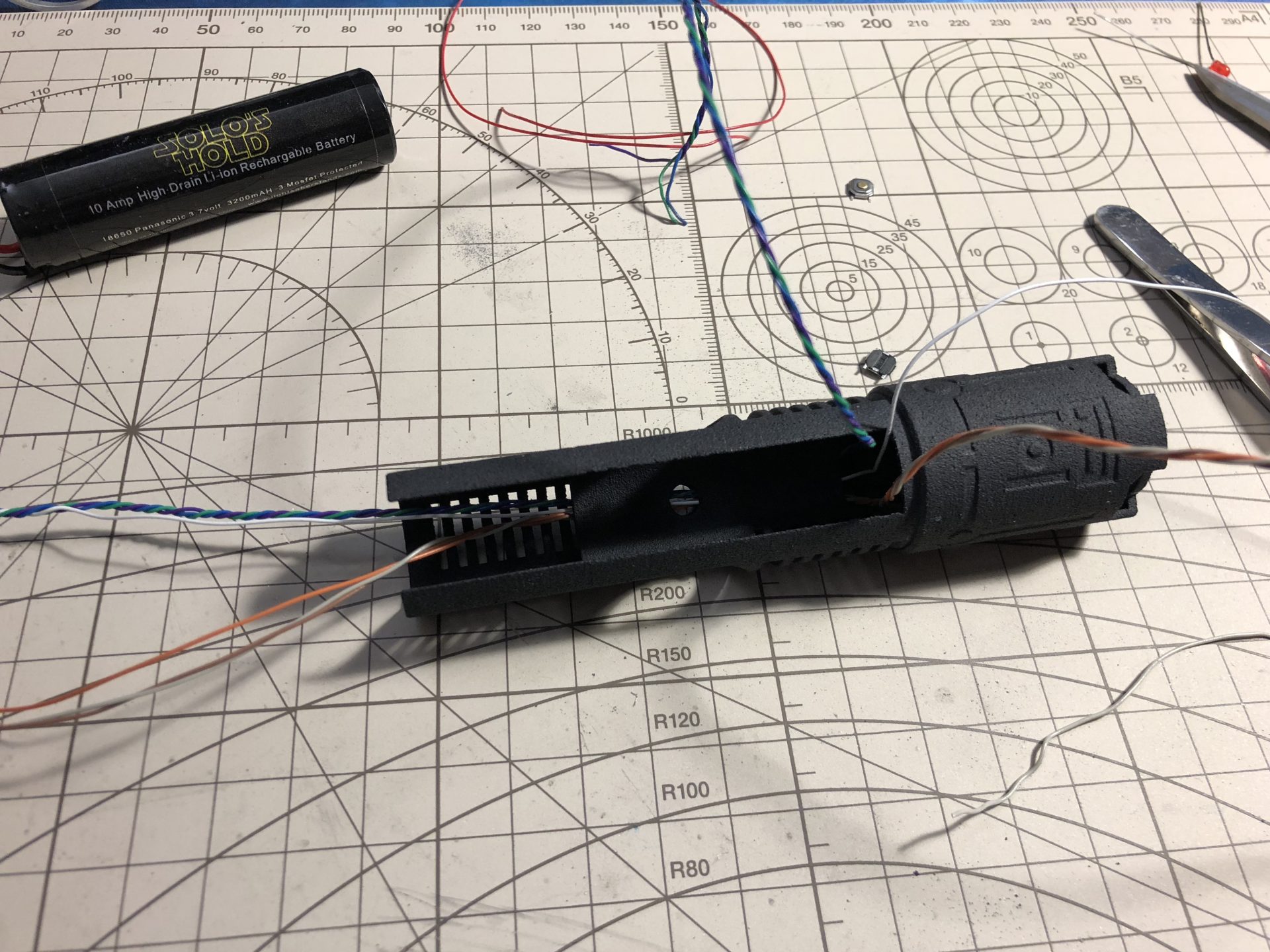 Add enough length of wires for the main led and switches wires, to be passed through the dedicated channel over the battery holder.