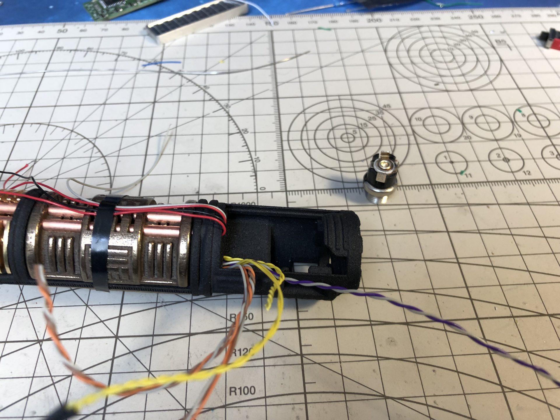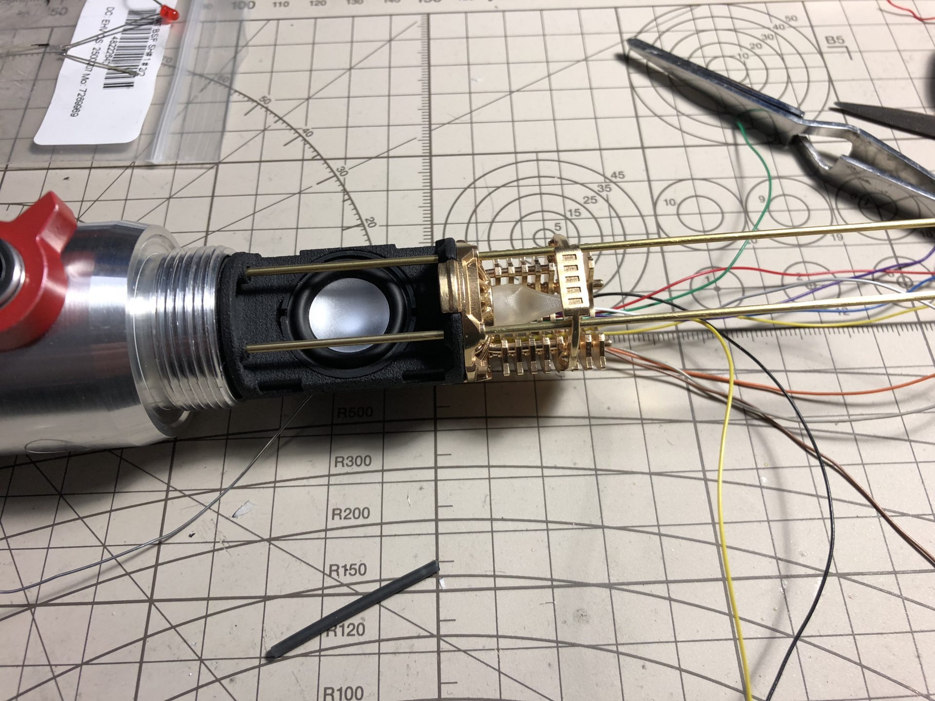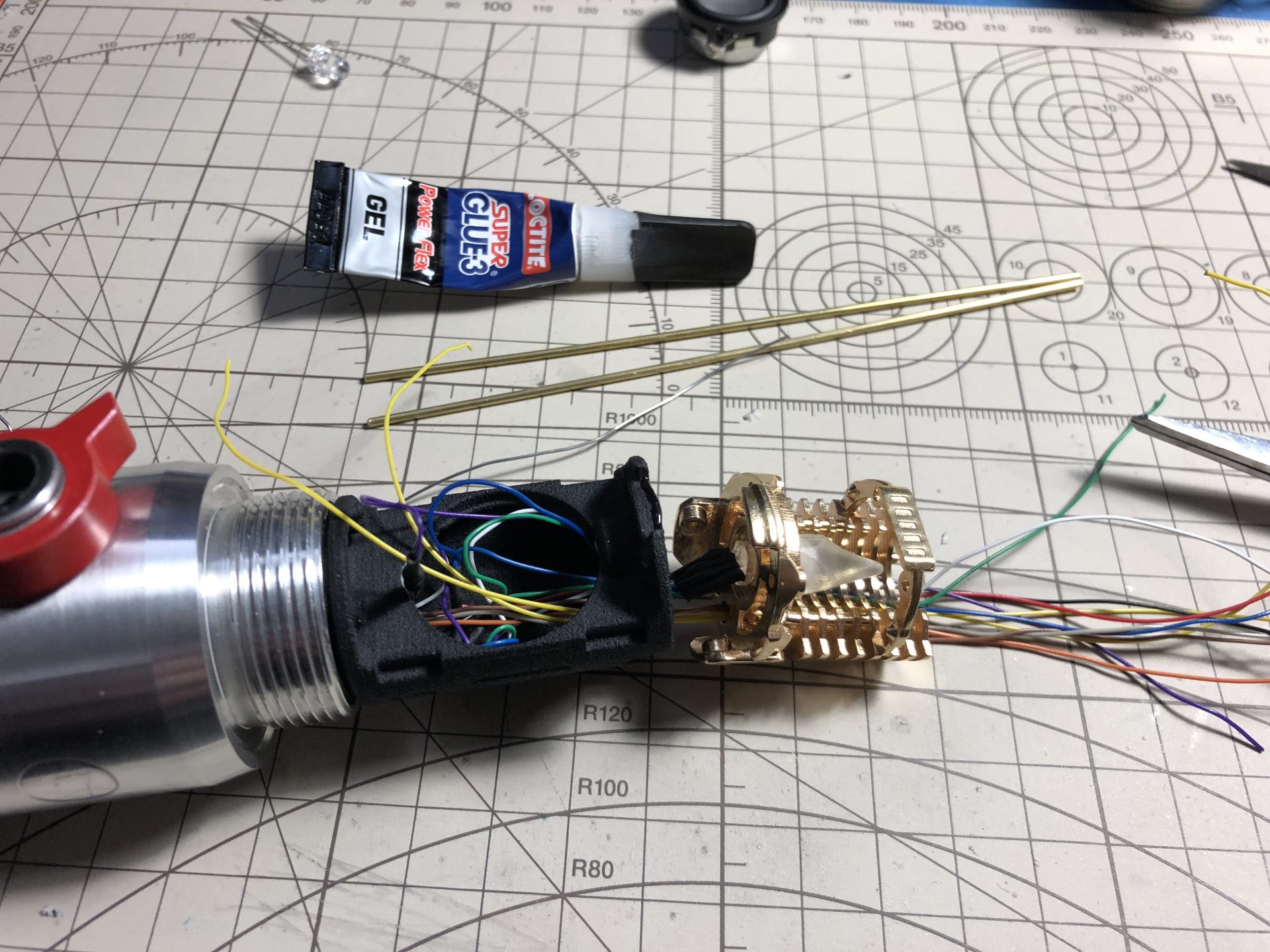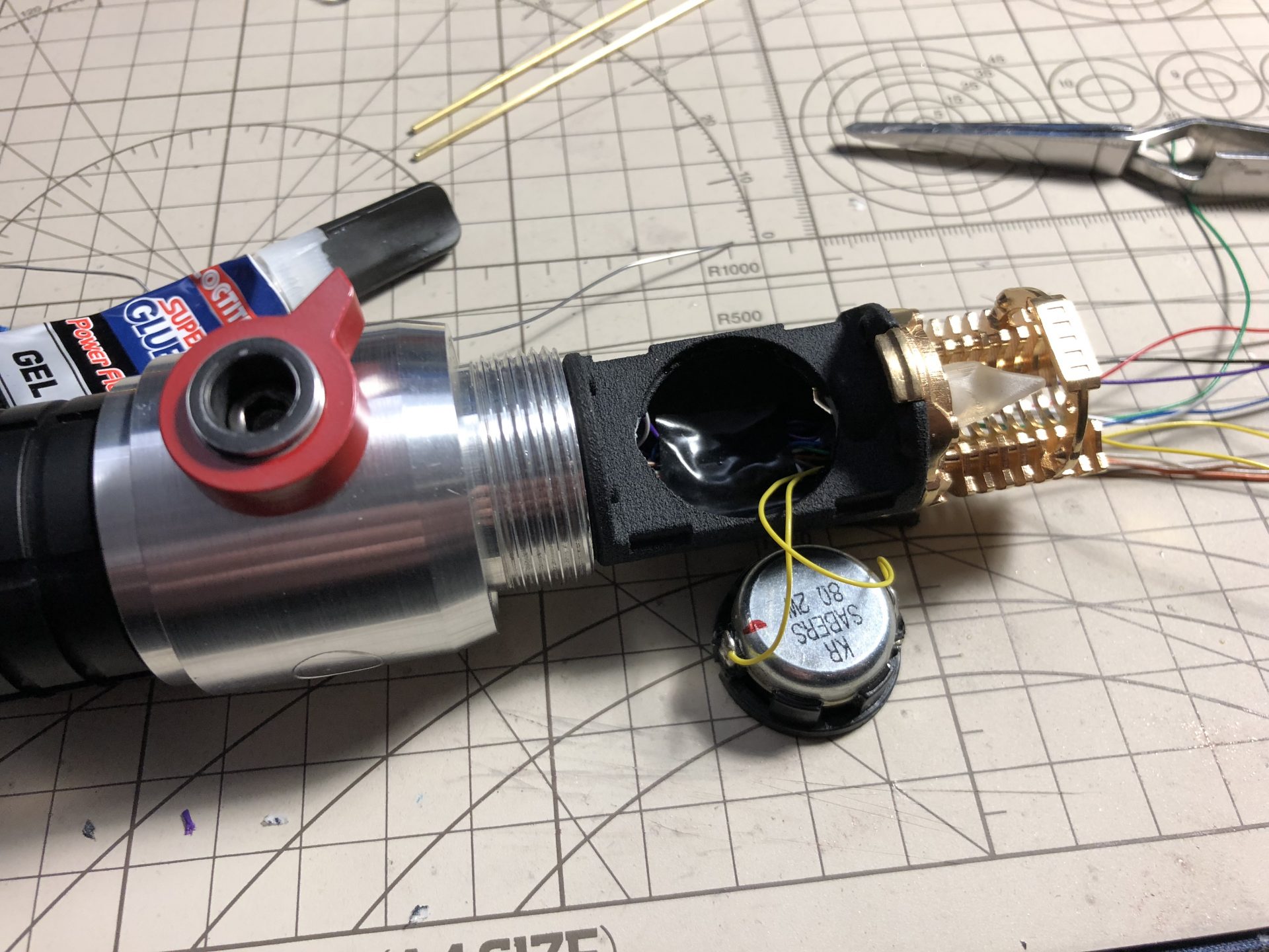 To limit the number of wires going through the tubes, the crystal chamber LED wires are wired in parallel of the main led under the speaker.