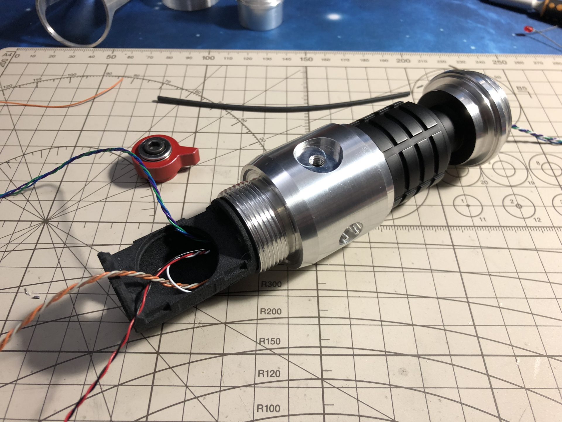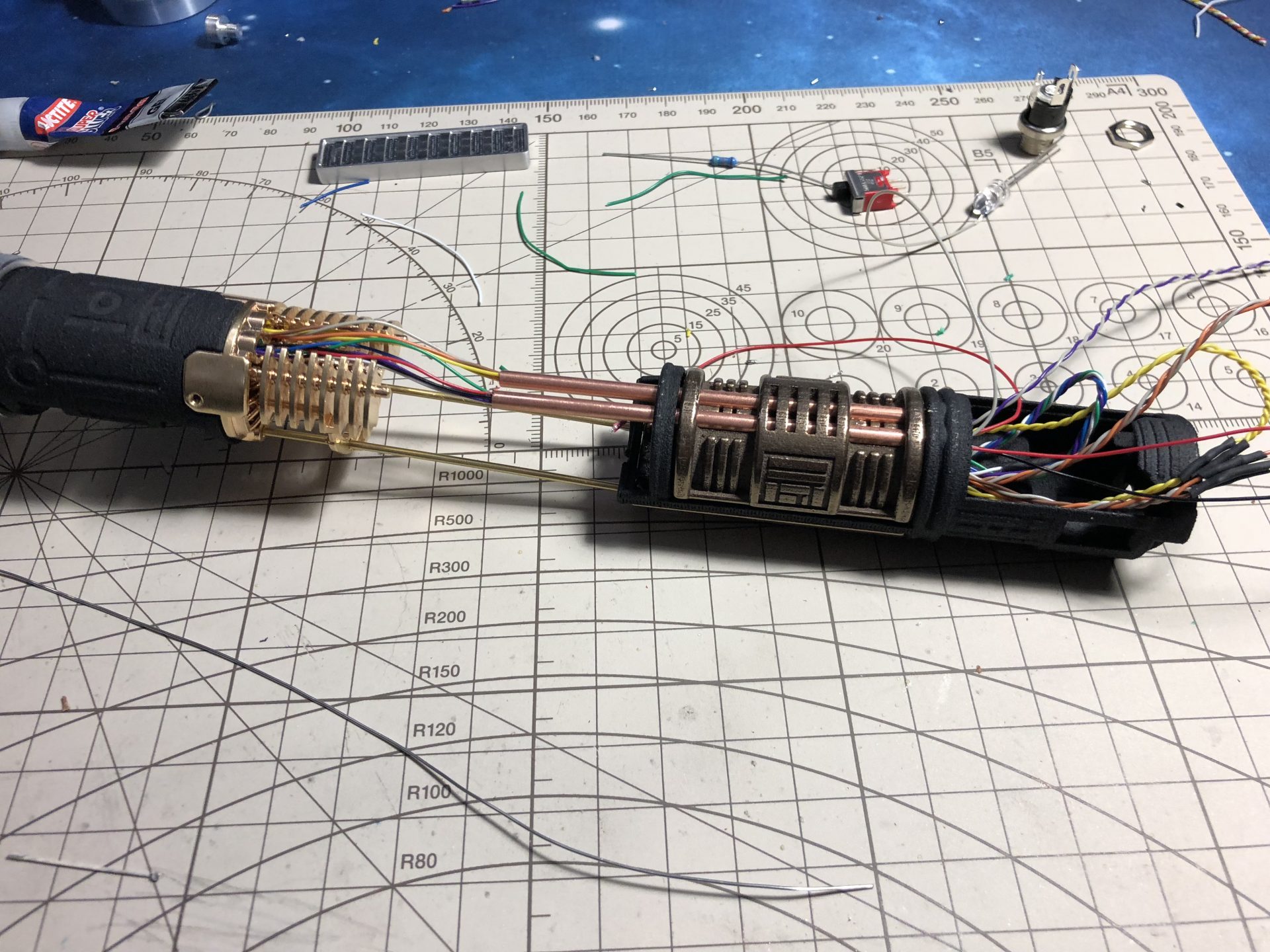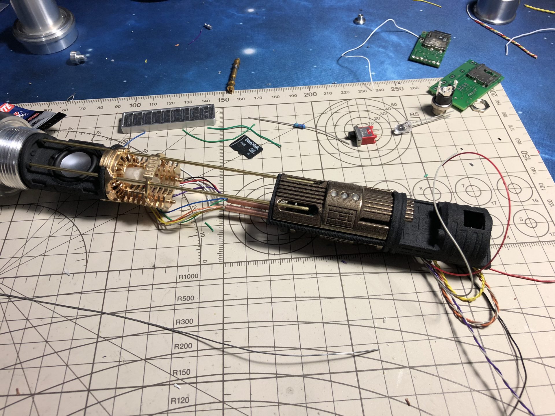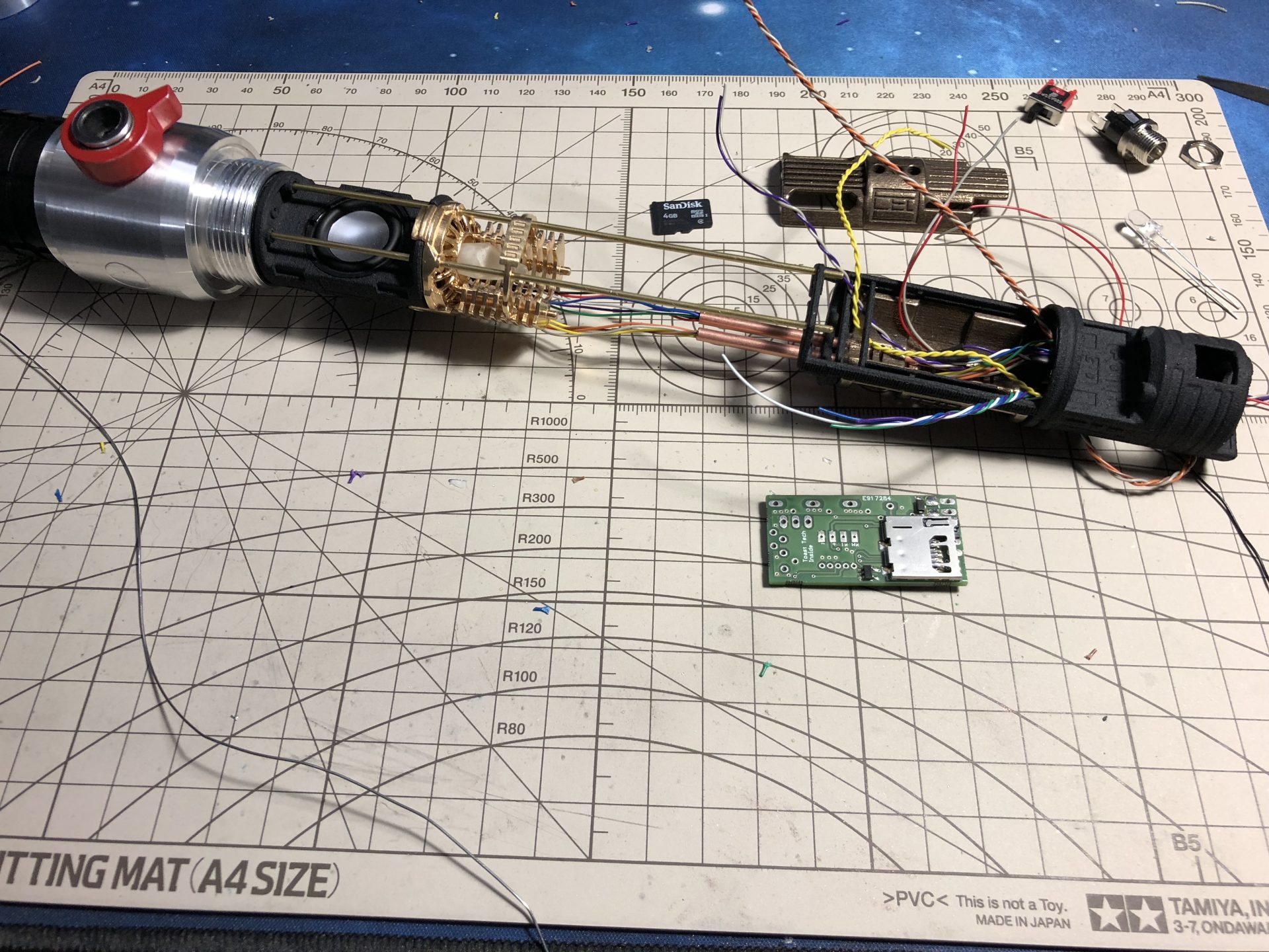 To limit the number of wires going through the tubes, the crystal chamber LED wires are wired in parallel of the main led under the speaker.