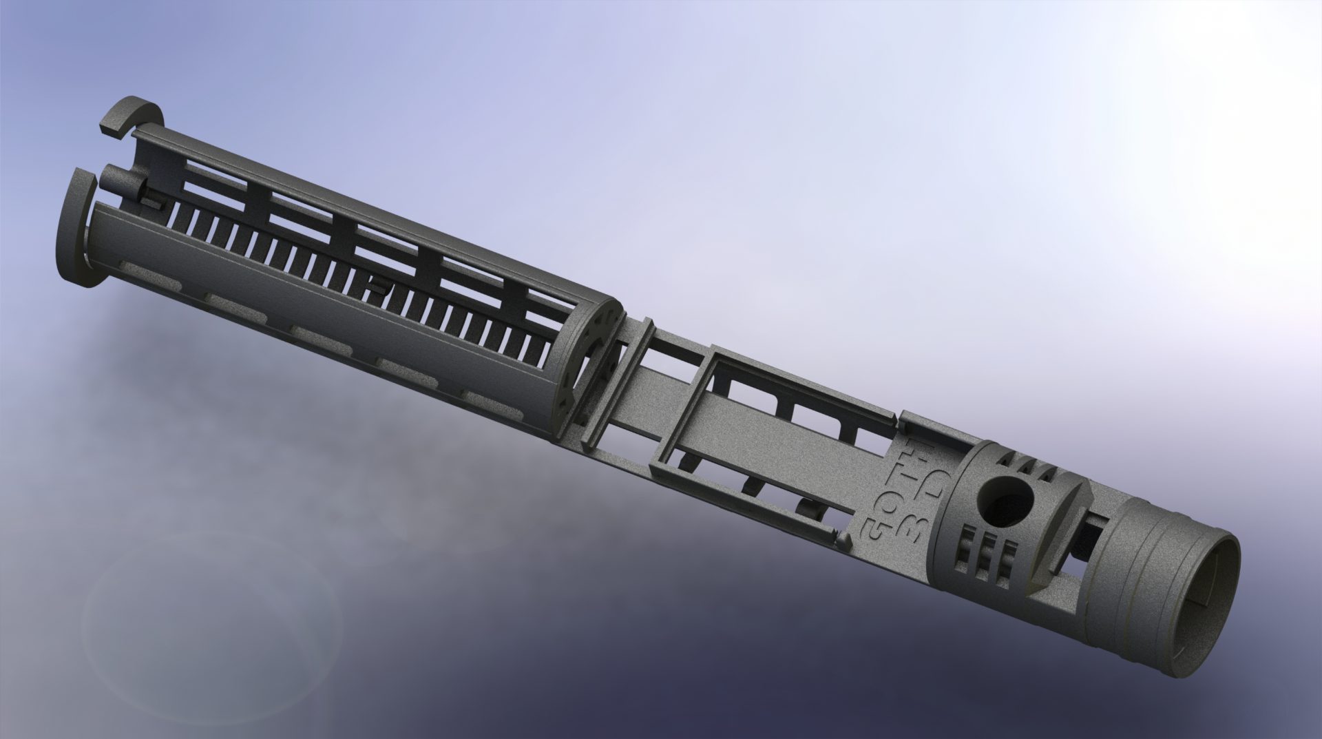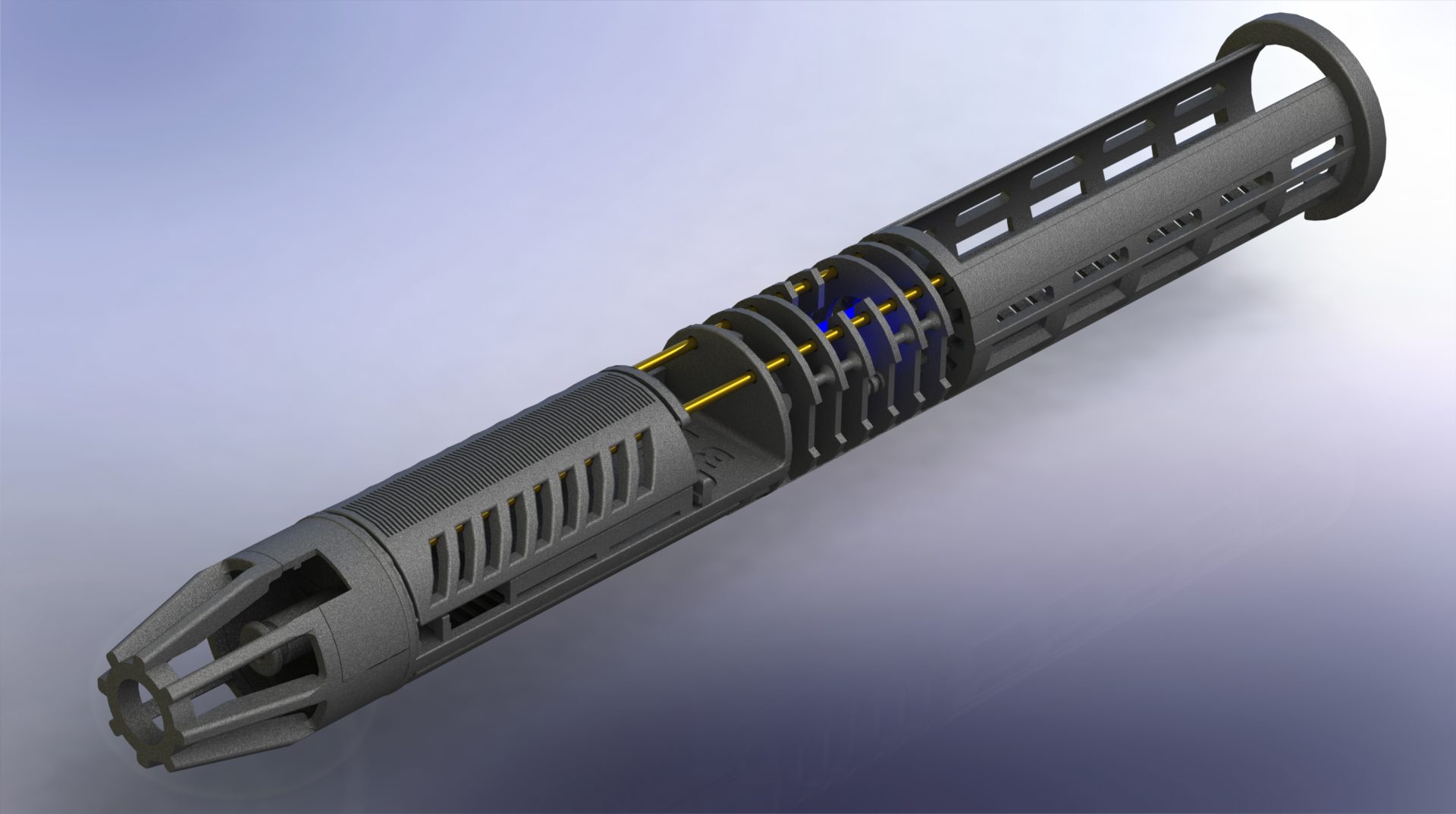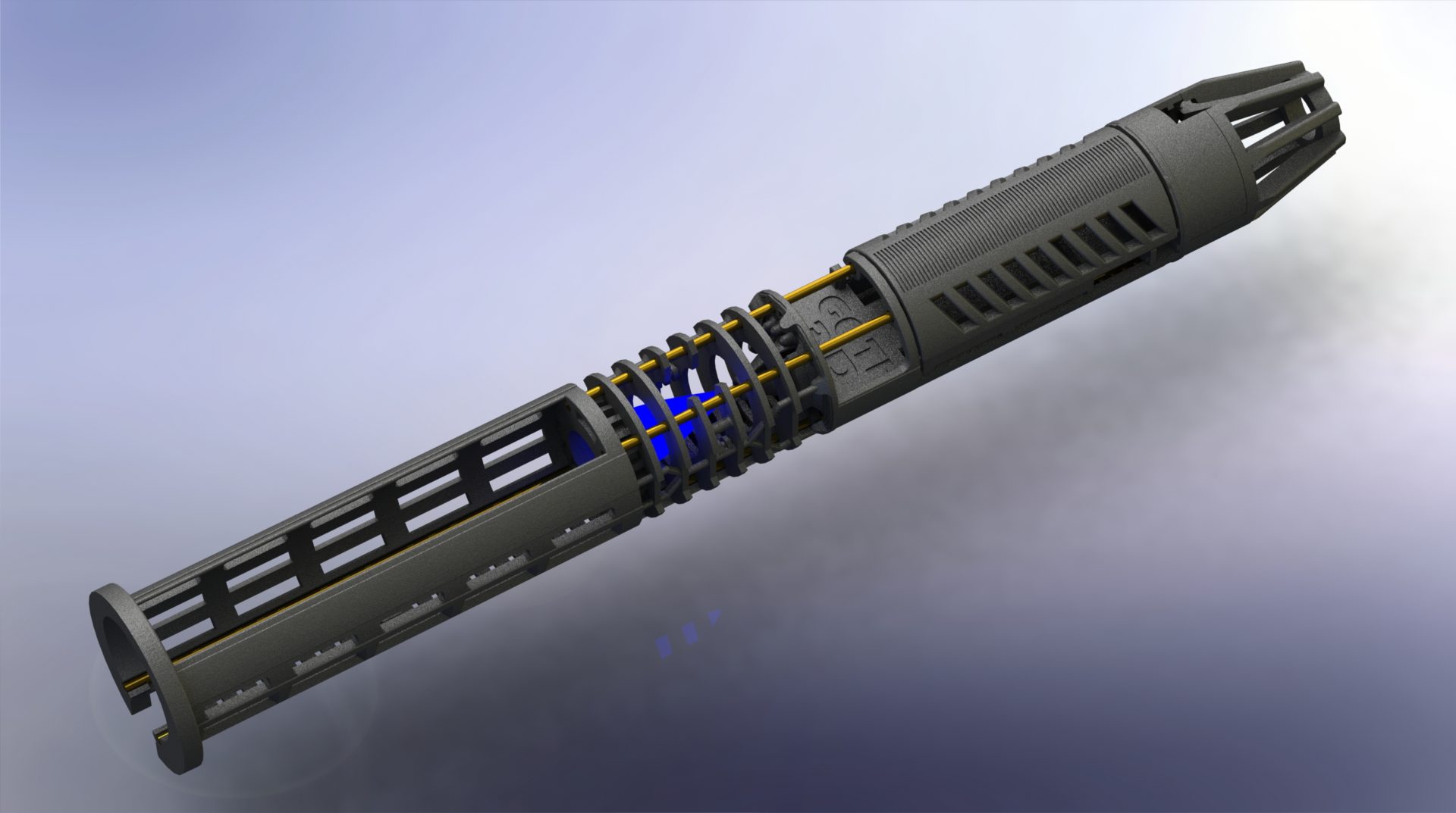 Variant 2 has the speaker at the end. It uses an on/off switch instead of a kill key, and both switch and recharge port are accessible by unscrewing the booster/pommel parts.
