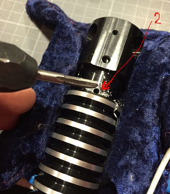 Step 13- Properly align the round hole of the grenade section and the shroud. Then screw back the “side switch” screw, the red button screw, the clamp screw, the glass one (or second red button) and the brass pins.